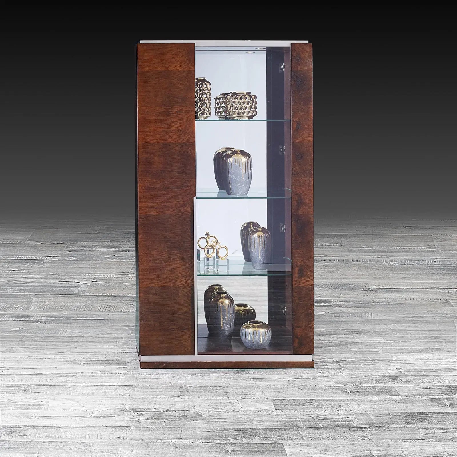 Lozano Curio by Norhaus Furniture is made with wenge oaks wood veneers body and door. It has a wood front door and a clear glass display door. The Lozano features polished stainless-steel hardware and handles along with a trim on the top and base. The vitrine features LED lights with clear glass shelves and mirrored back panel.