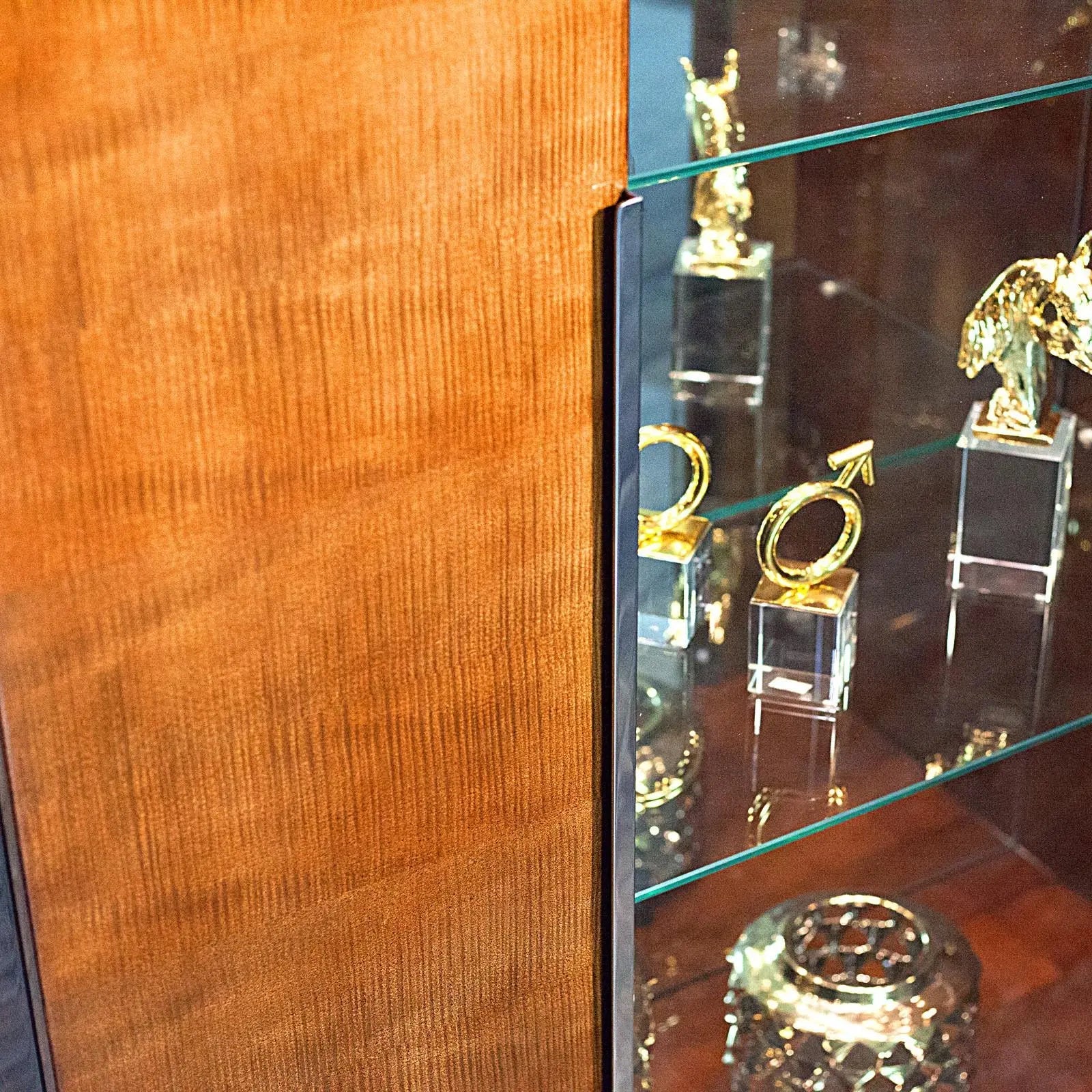 Lozano Curio by Norhaus Furniture is made with burl wood body and Maple wood veneer door. It has a wood front door and a clear glass display door. The Lozano features polished stainless-steel hardware and handles along with a trim on the top and base. The vitrine features LED lights with clear glass shelves and mirrored back panel.