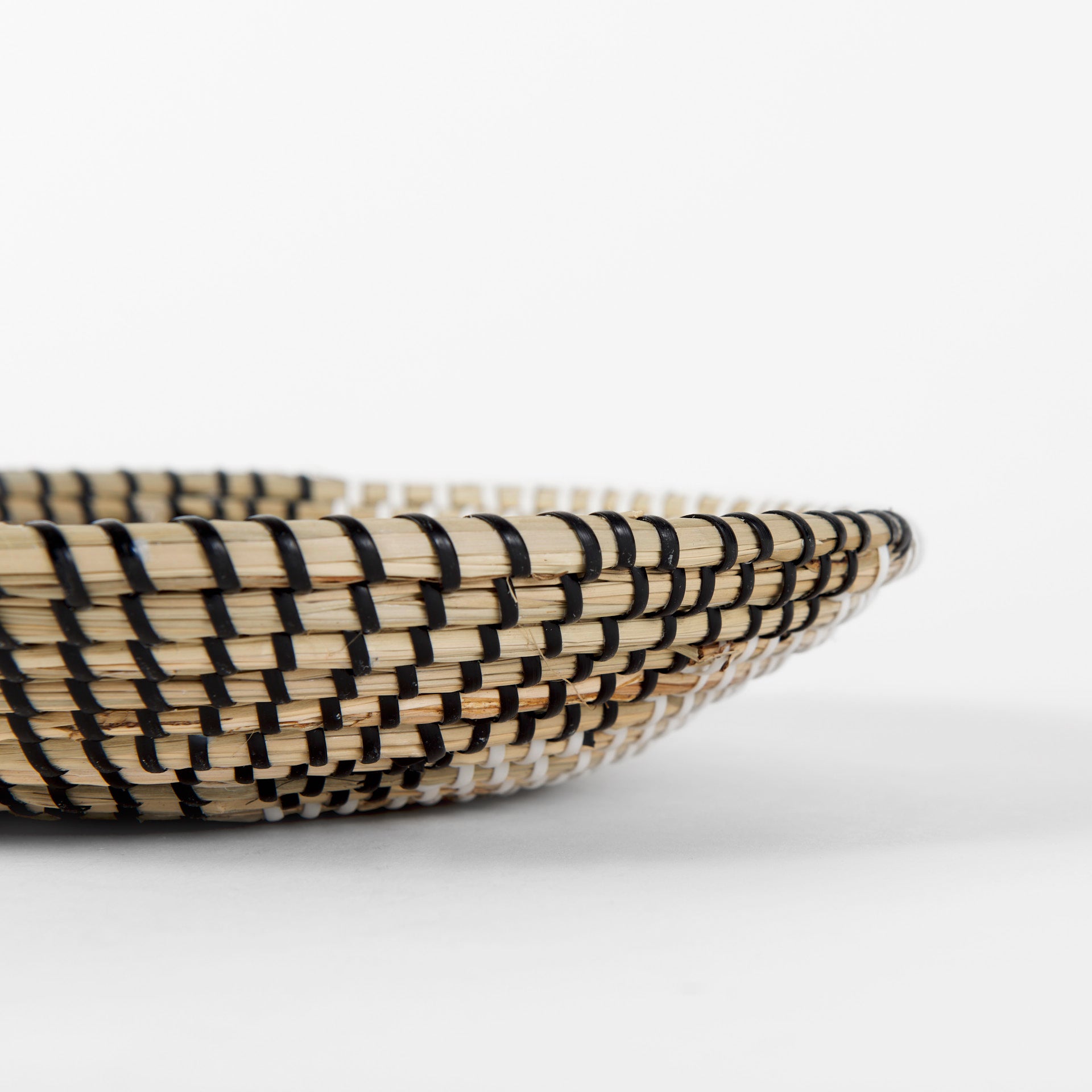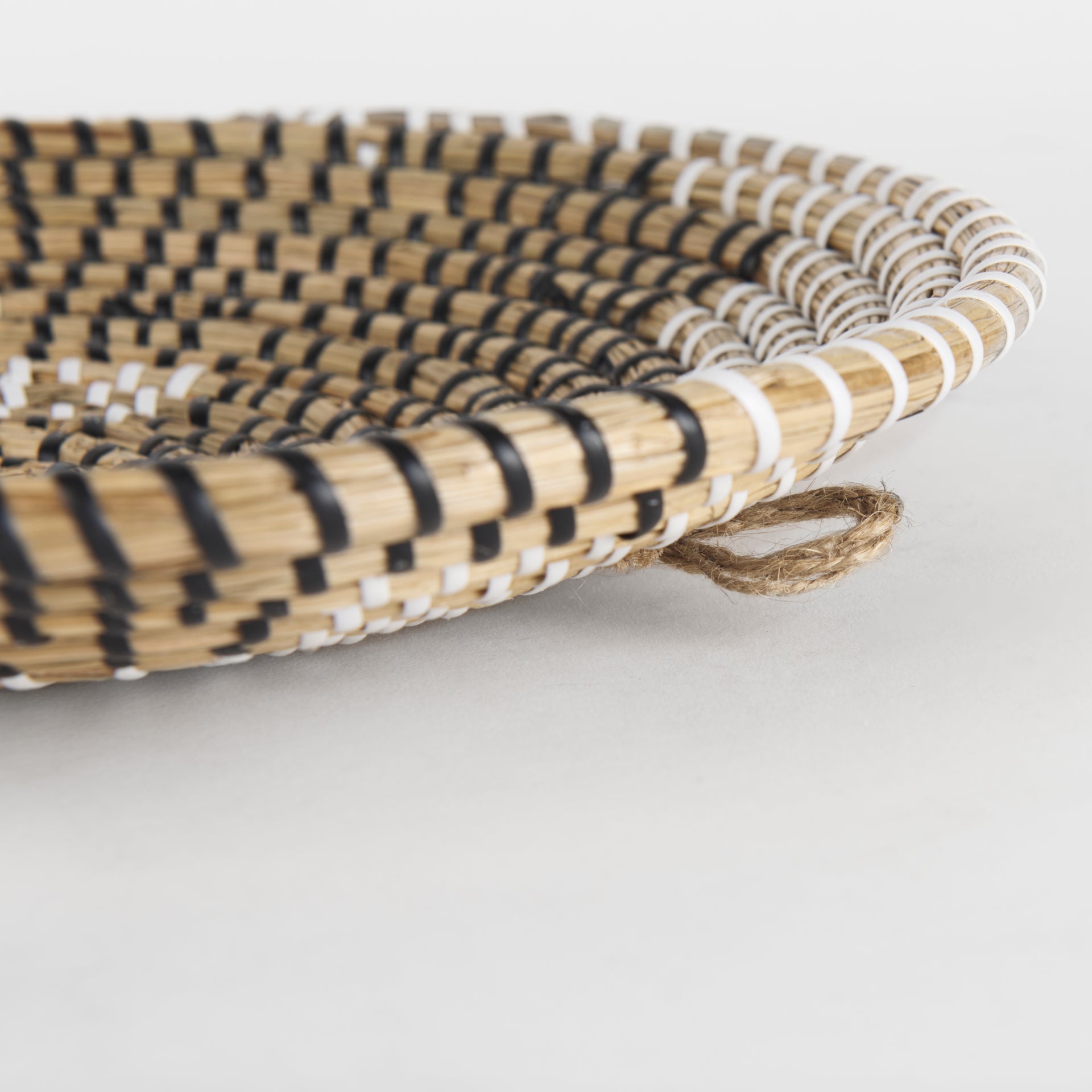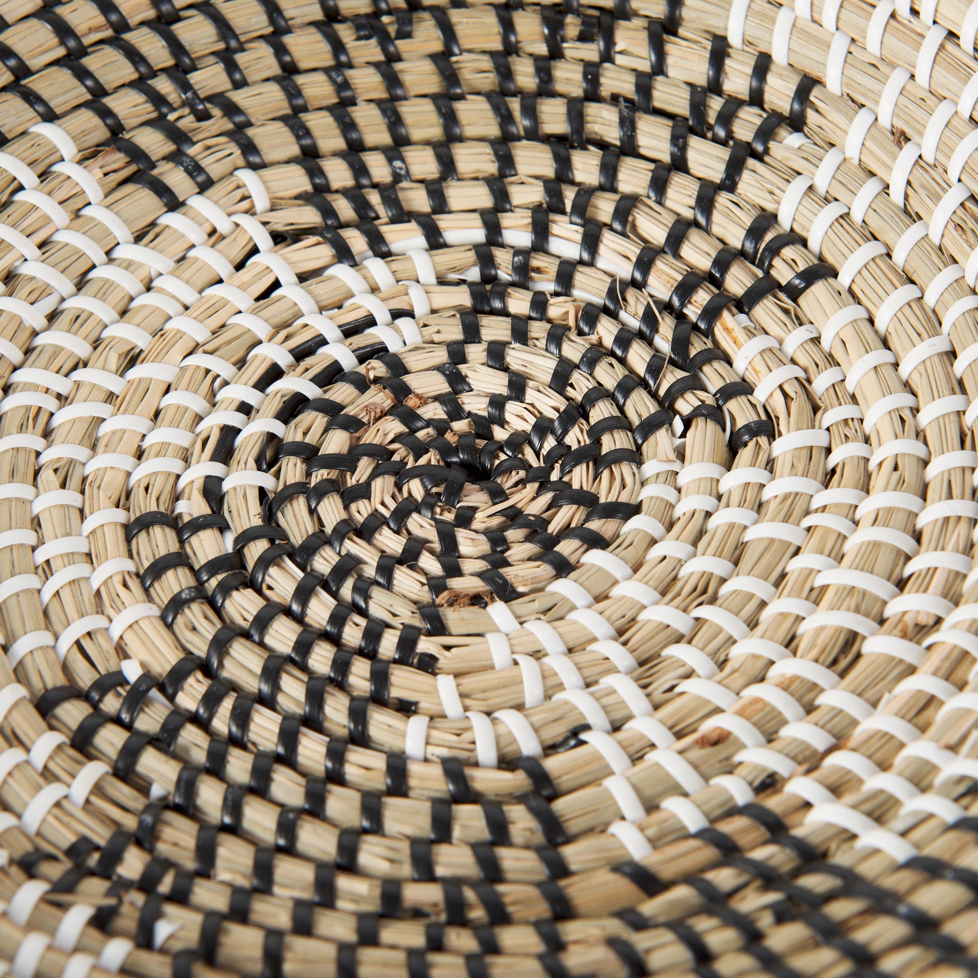 Luna is a beautiful wall accent made of light brown seagrass intertwined with white and black string, creating a visually striking pattern.