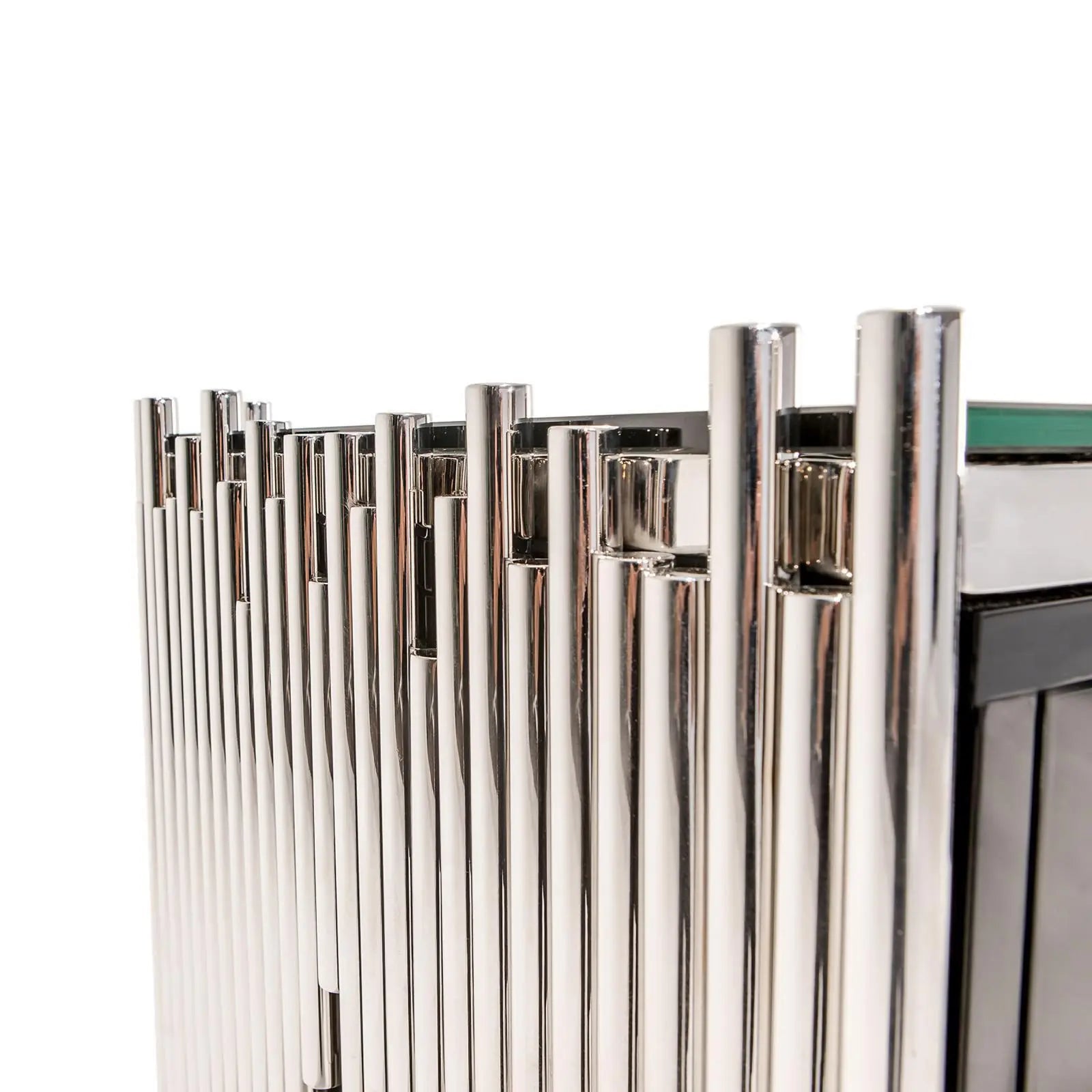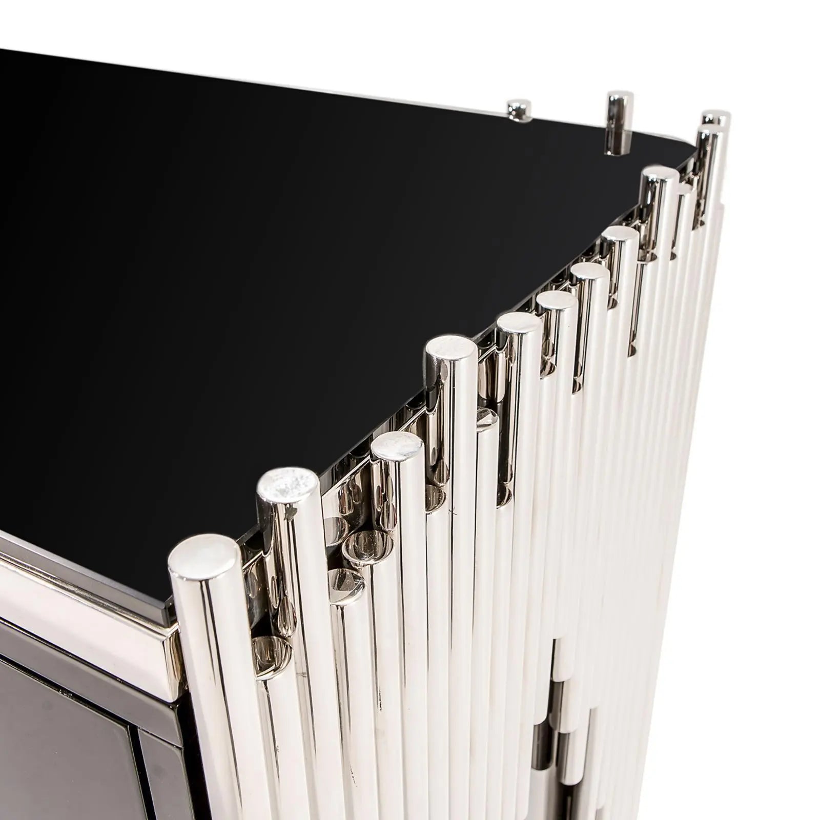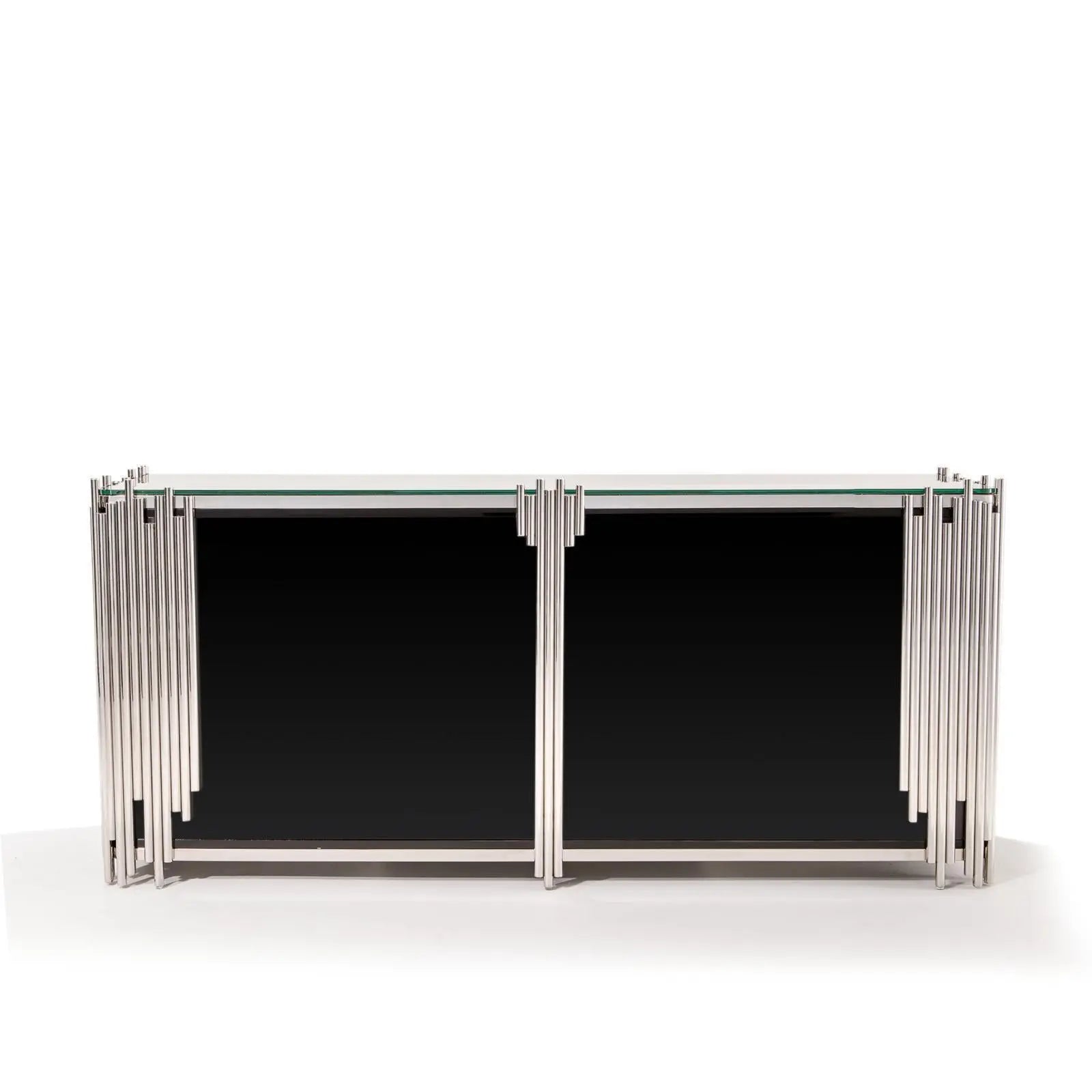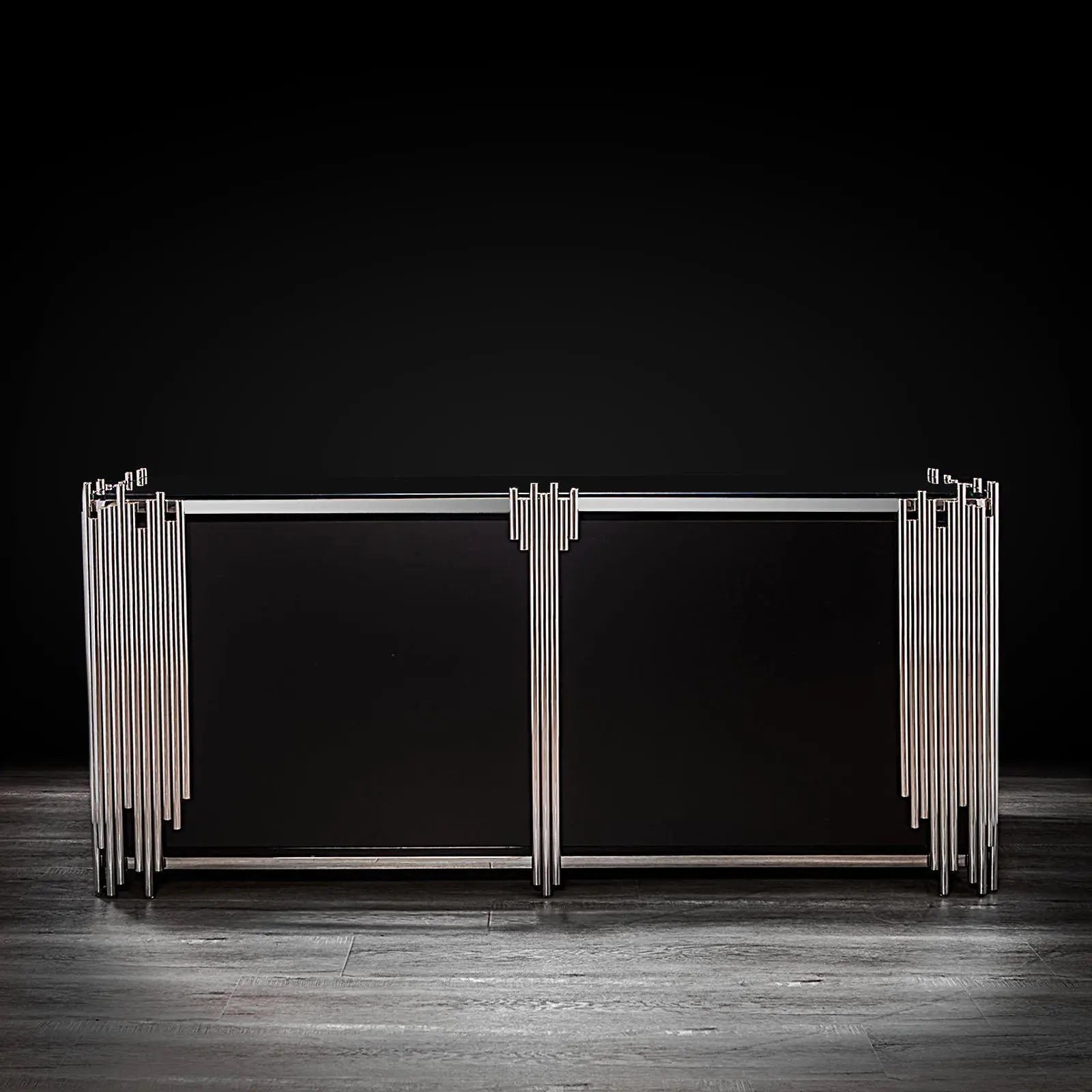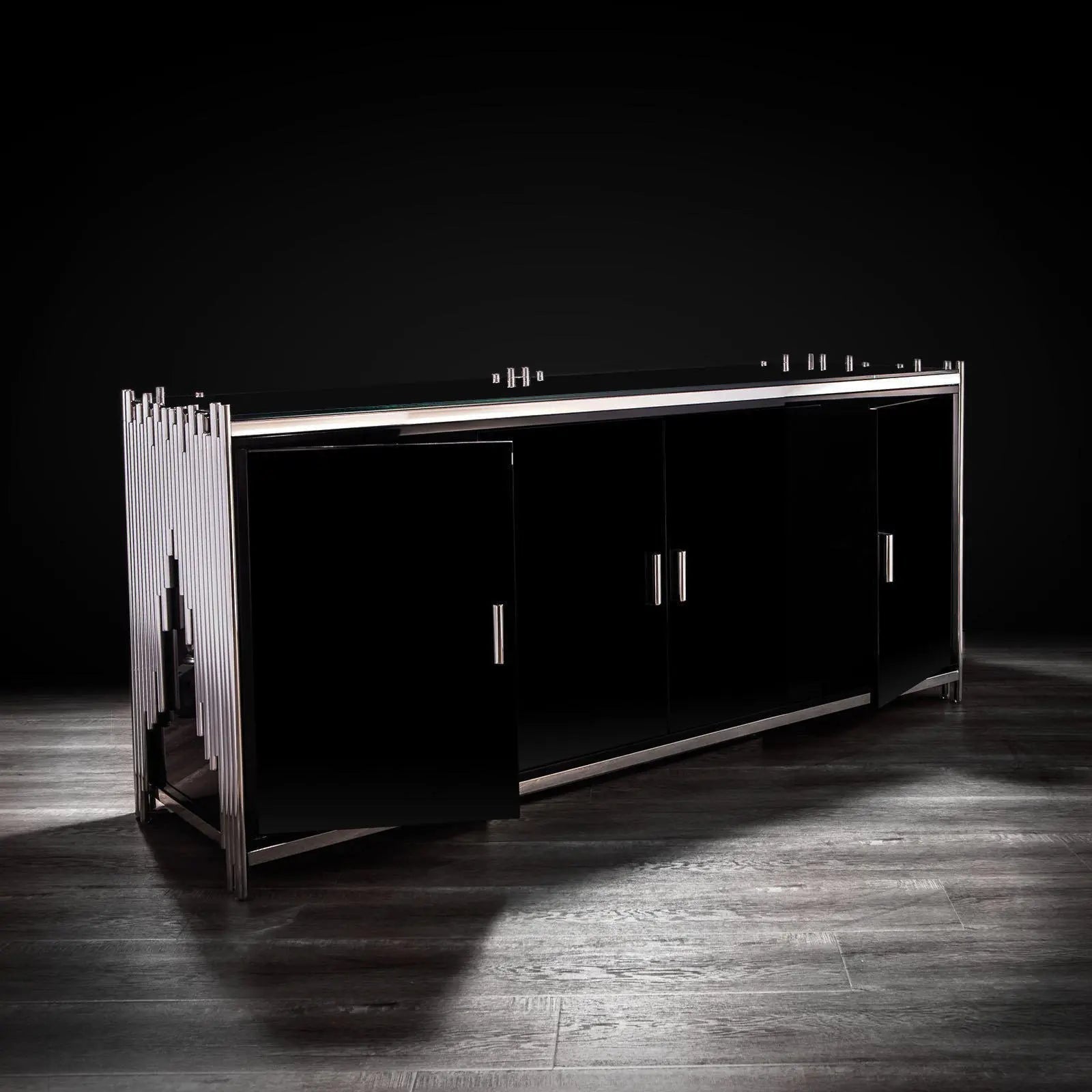 This contemporary Mauris buffet with four black lacquer doors and silver pulls creates an instant attraction in your home. The irresistible silver stainless steel frame design adds a sense of elegance. The large smooth top surface made of black glass guarantees luxurious looks.