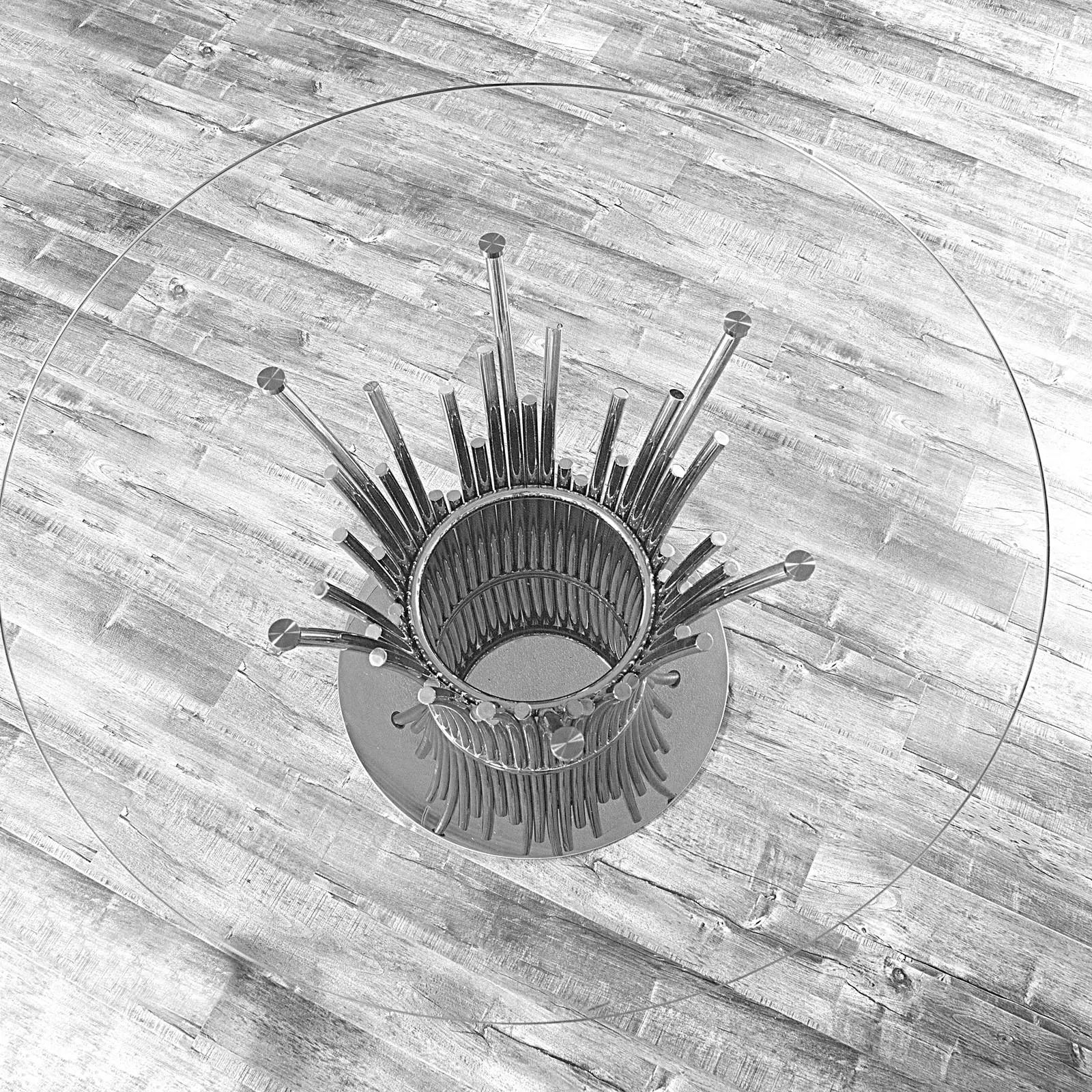 This beautiful dining table highlights the elegance and subtle intricacies of the deco style and presents them in an elegant modern fashion. The base of this piece is made of different lengths tubes that curve to perfectly carry a tempered round glass top.
