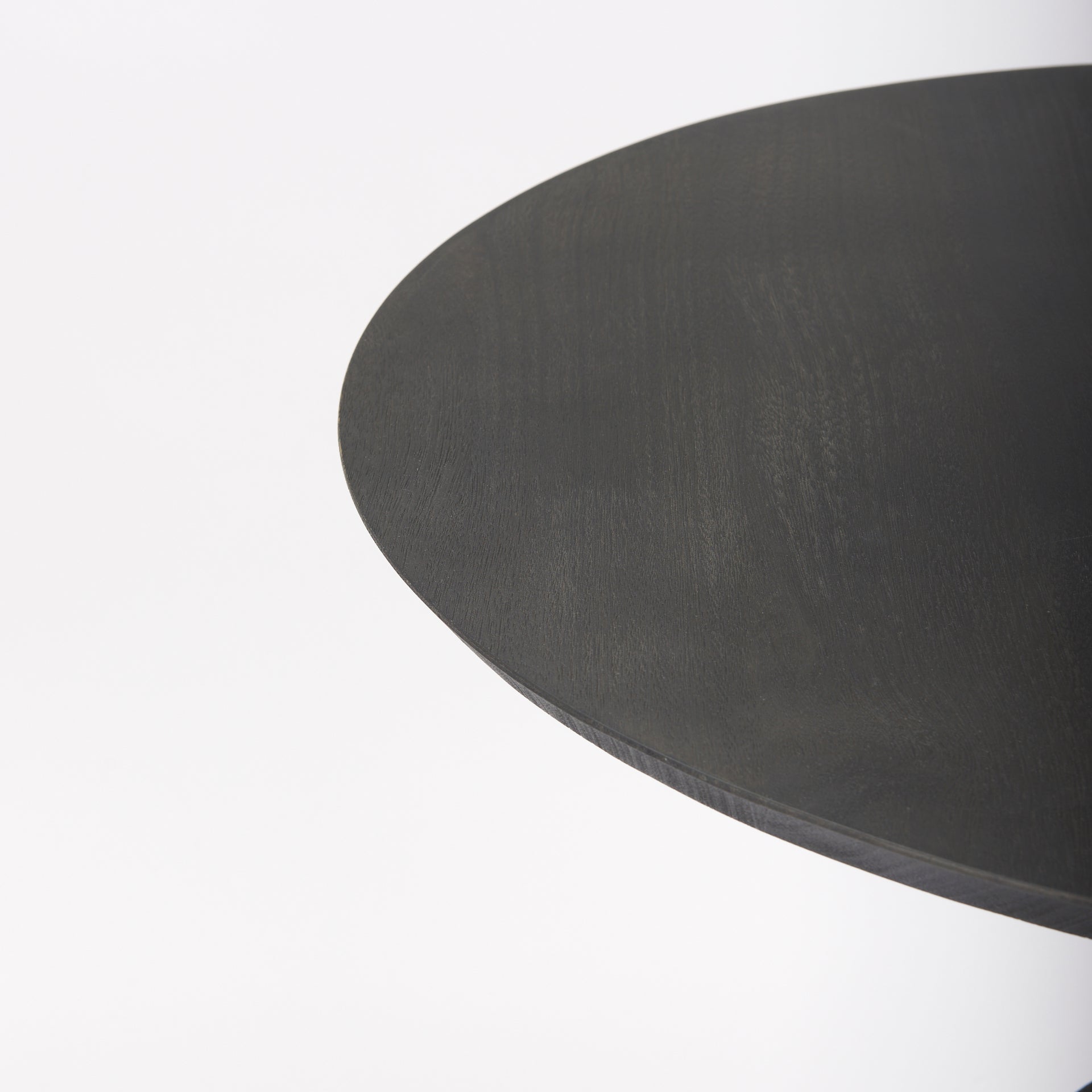 This Maxwell simple, round tabletop made from solid Mango wood sits upon an iron pedestal anchored by a tapered wooden base. The smooth, black-brown finish of the wood tabletop and base complements the black iron.