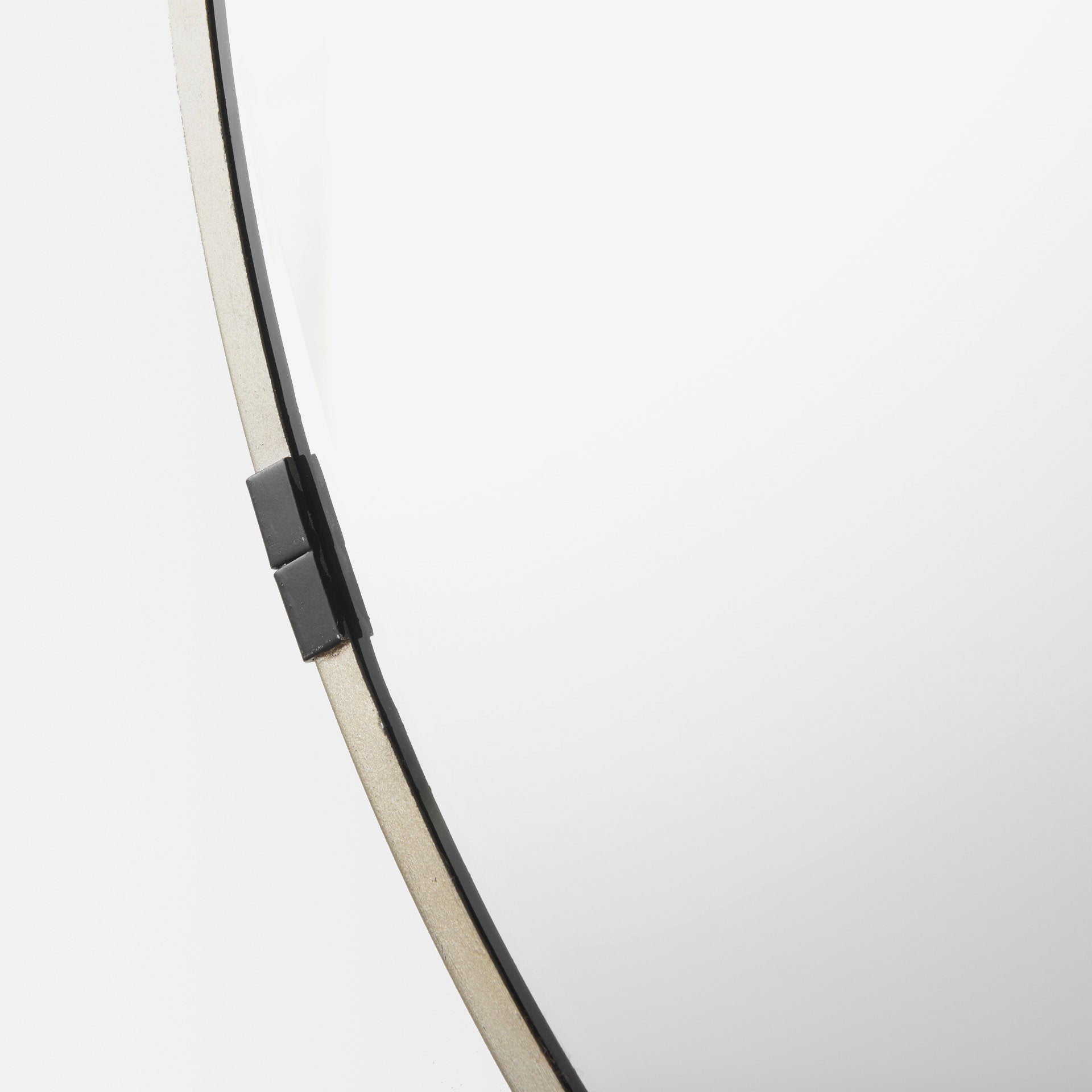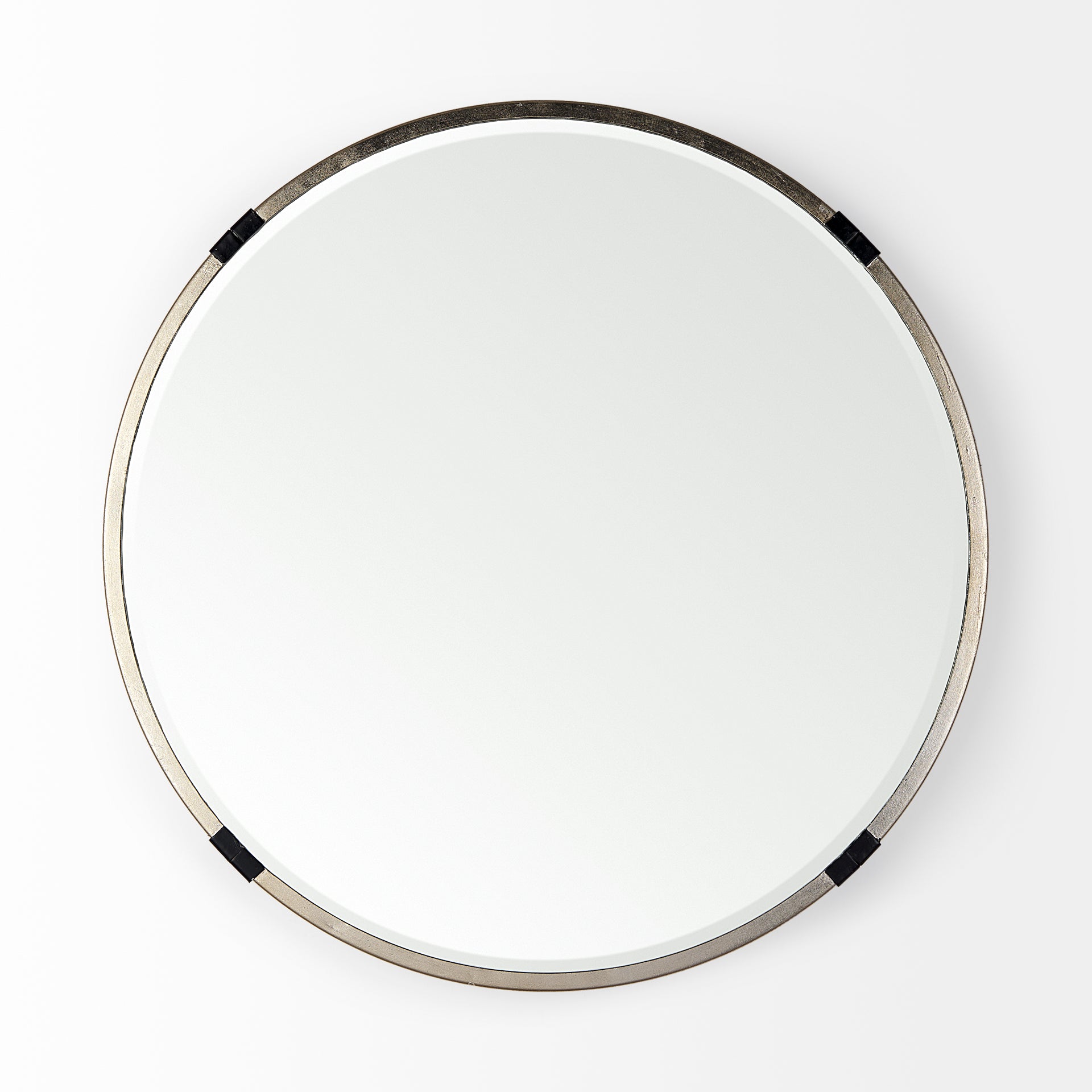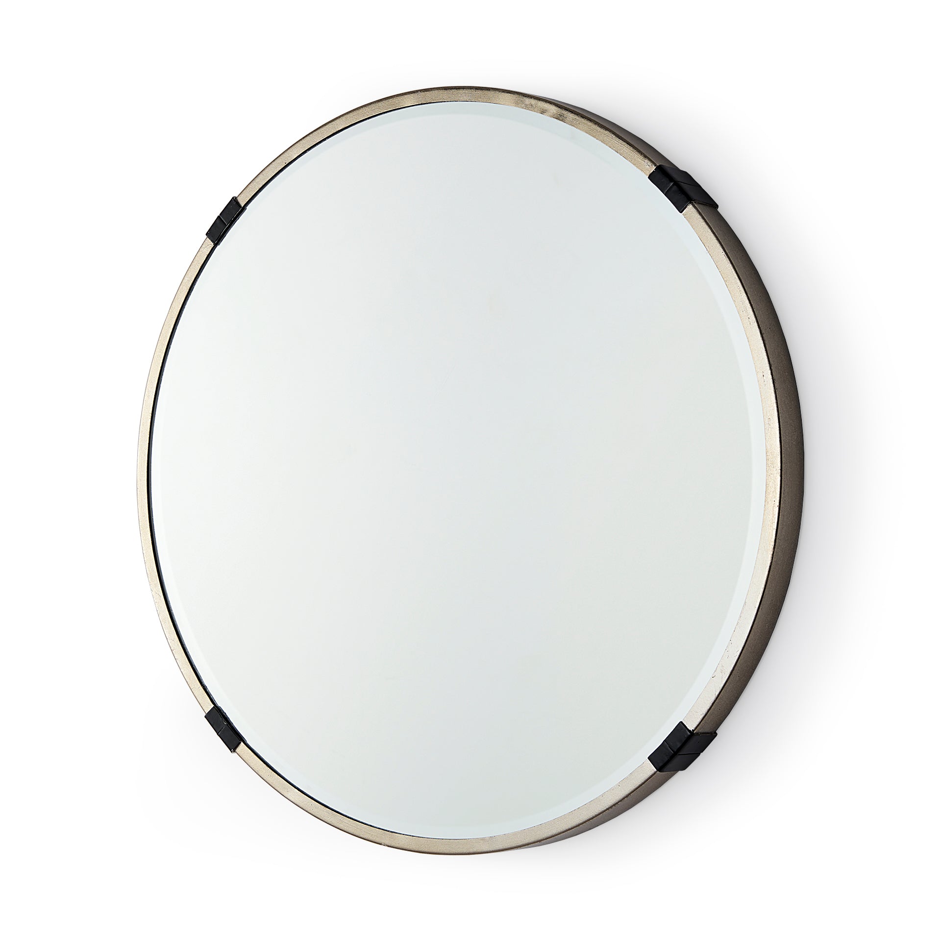 Clean lines and a simple design, this round mirror is edged by a slender iron frame with four clamp-like embellishments that add a little texture and interest.Β