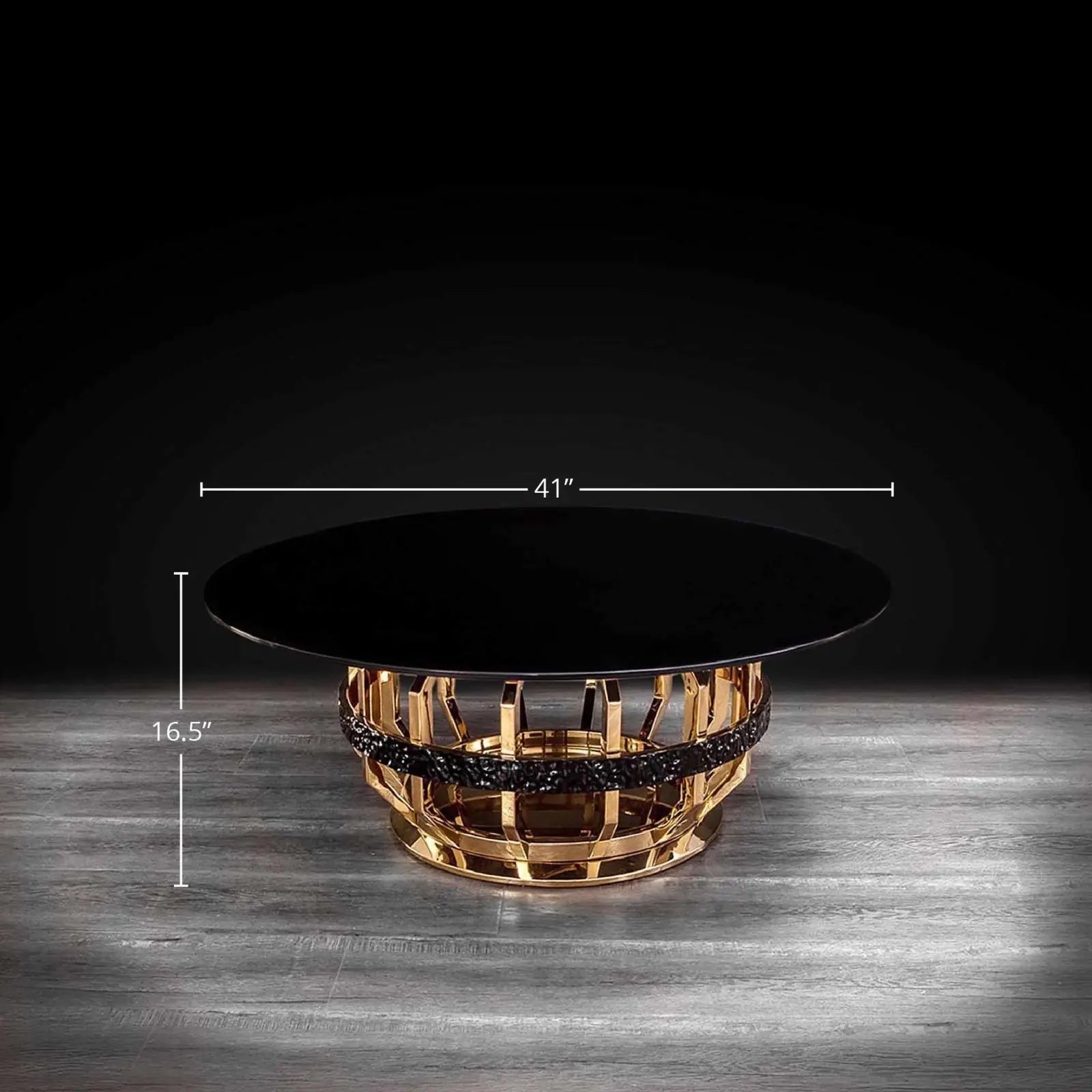 Milano round coffee table with an astonishing titanium-gold polished stainless-steel base by Roberto Grassie. This modern coffee table features a round black tempered glass top with 12mm thickness. The hand-hammered black belt detail in the middle of the base adds great sophistication to this wonderful piece.