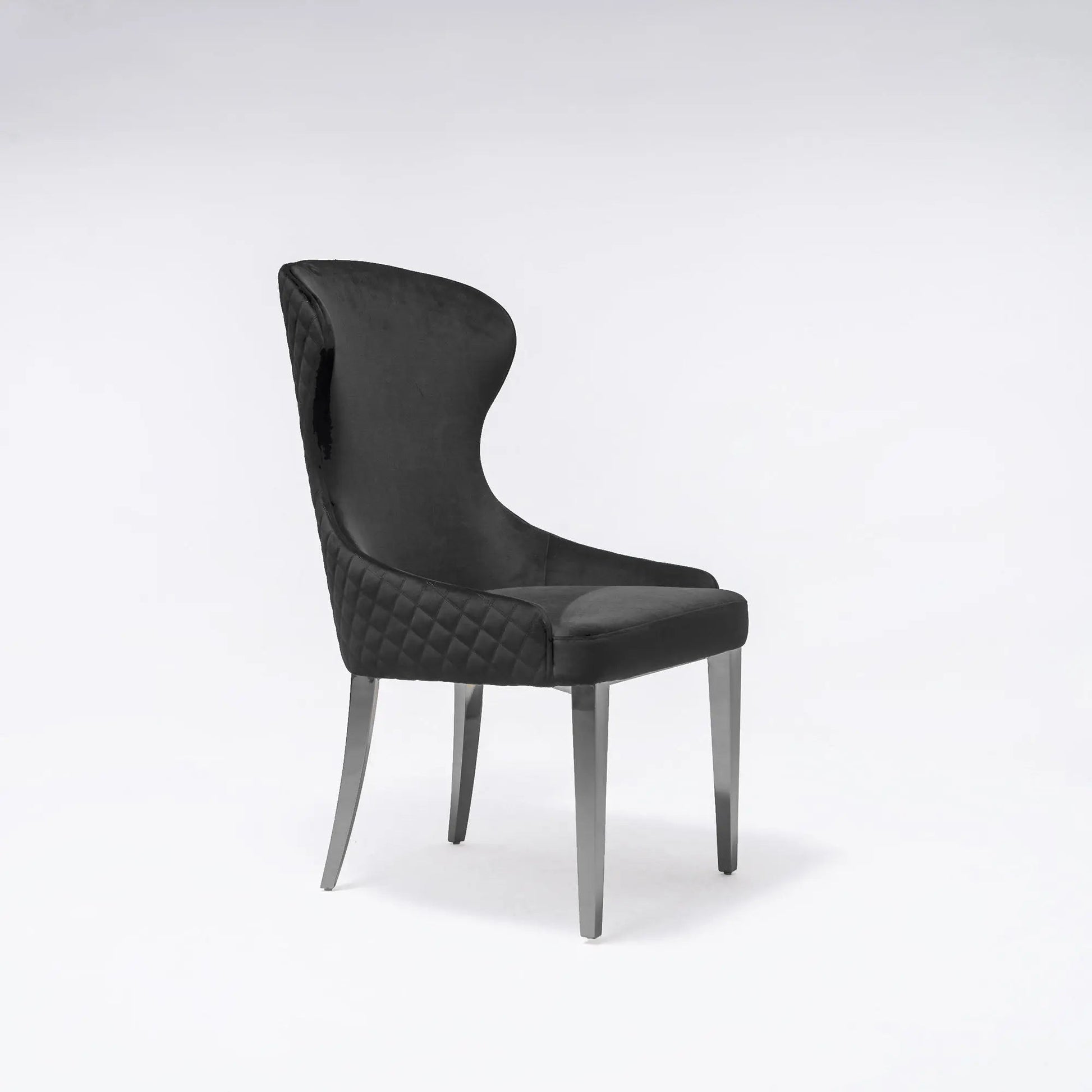Modena Dining Chair is a beautiful large scale dining chair with elegant shape and a beautiful quilted back design, it is upholstered in luxurious performance velvet and complemented with Stainless steel base.