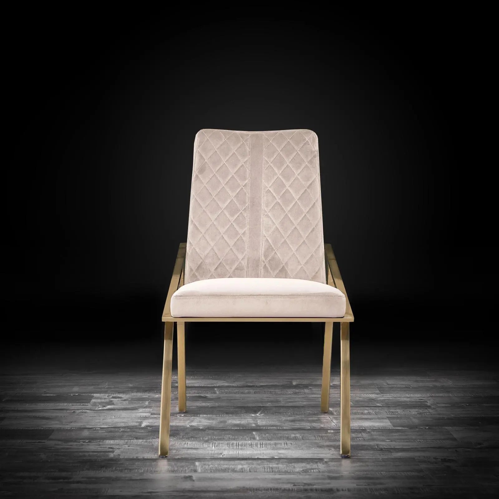 Nolan stylish dining chair features quilted design detail on the back. The chair has minimalist modern lines with profound design. The velvet upholstery gives the chair a luxurious feel and look while the Champagne Gold brushed stainless-steel finish on the frame adds a touch of contemporary to this impressive chair by Norhaus Furniture. Available in Black, Gray, Dark Blue, Dark Green, Beige, Orange and Taupe colors.