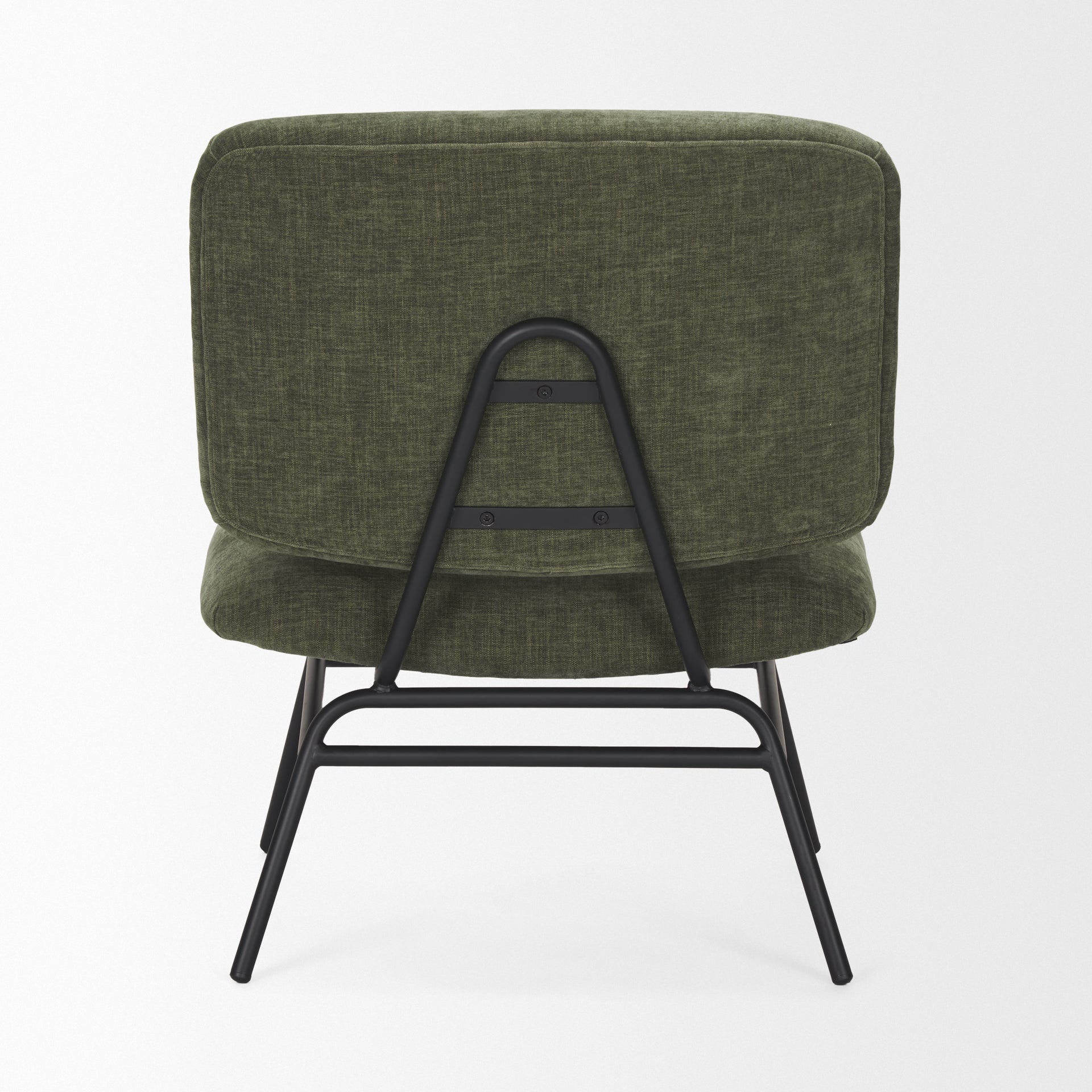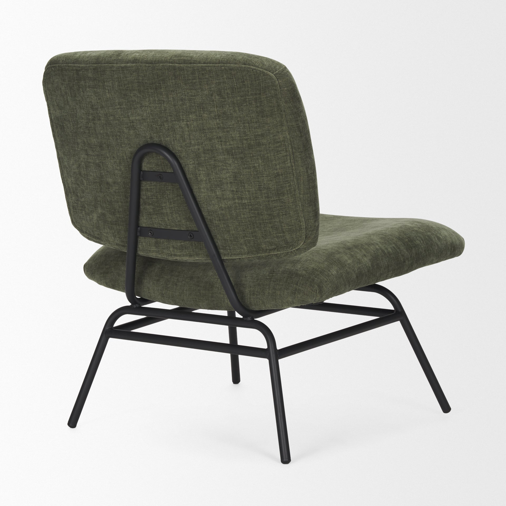 The Nora Accent Chair is supported by a matte black iron metal frame with a padded seat and backrest upholstered in a forest green fabric.