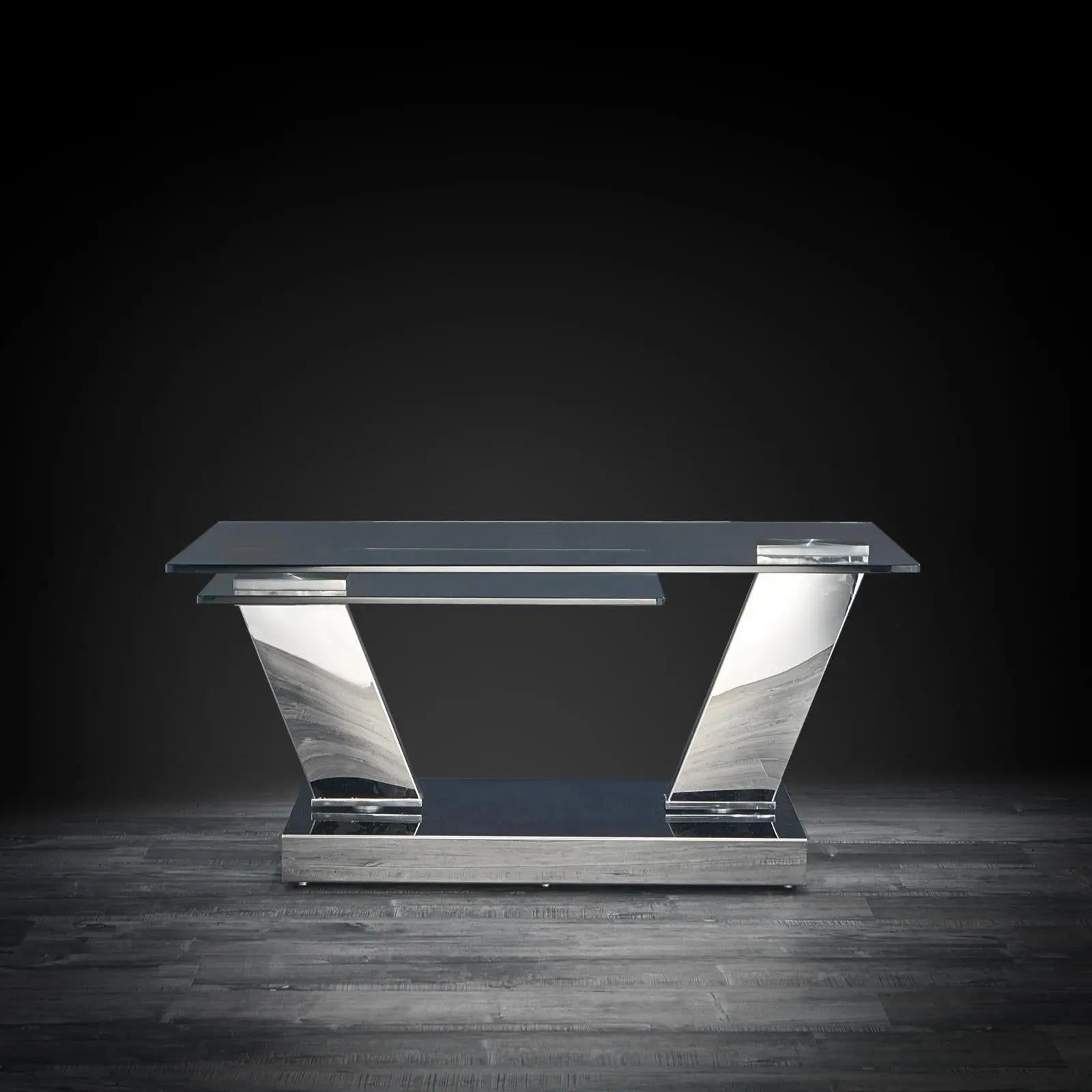 Omnia modern coffee table with the rotating mechanism allows this beautiful table to be very functional as well. The Omnia will start as a small rectangular table and will open up to two levels of rectangle surfaces. The Omnia table features a polished stainless steel base with clear tempered glass tops.