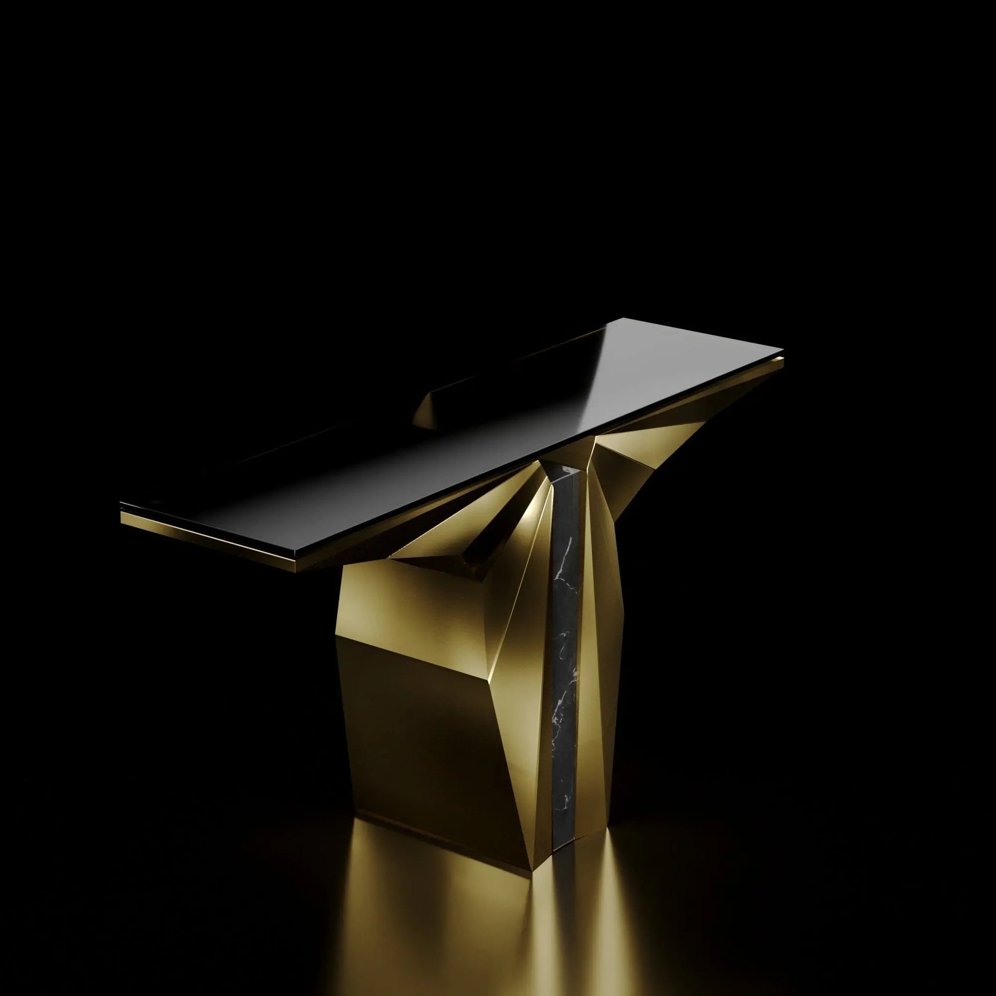 Top: The console table's top is crafted from black glass, which provides a stylish contrast to the metallic base. The black glass top enhances the overall aesthetic with a sleek and polished surface, complementing the metallic tones while offering durability and ease of maintenance.