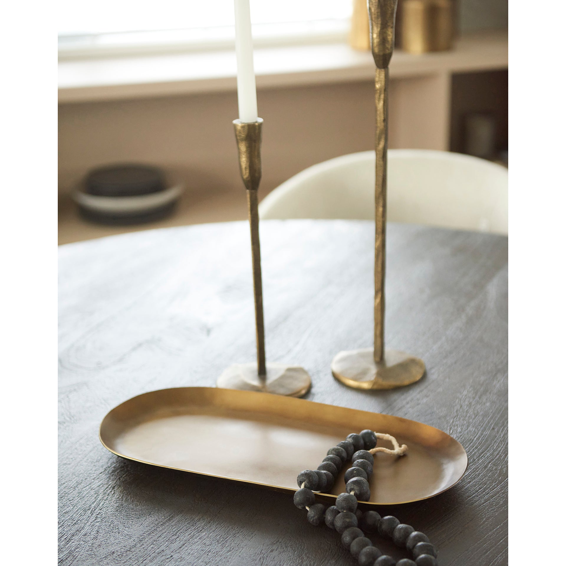 A sleek and sophisticated candle tray, made from an aluminum base and finished in an antique gold