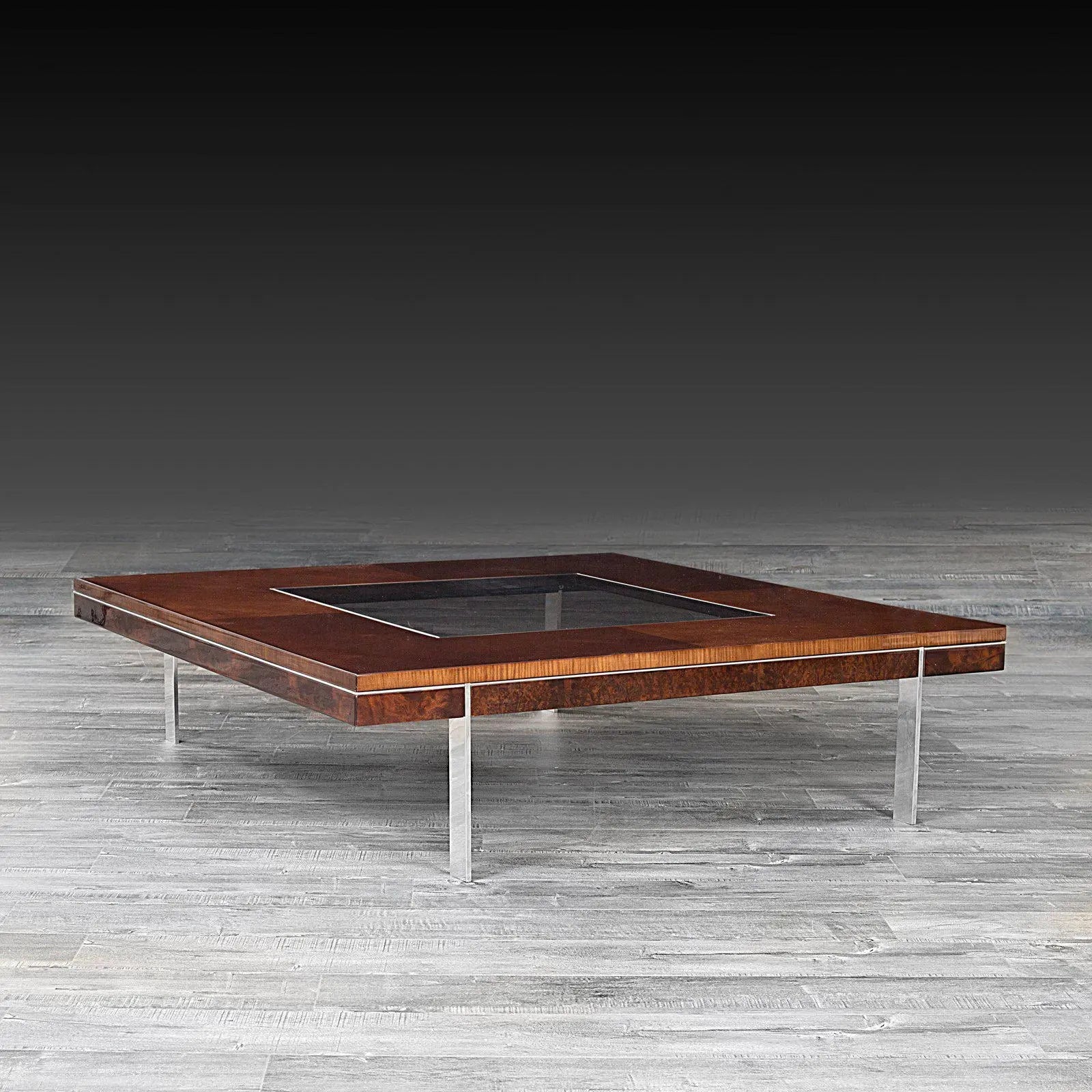 Demeter Luxury Square Coffee Table by Roberto Grassie is crafted by maple and burl wood veneers and finished with high gloss lacquered base and top inserted with smoked tempered glass. Also features silver polished stainless-steel legs.