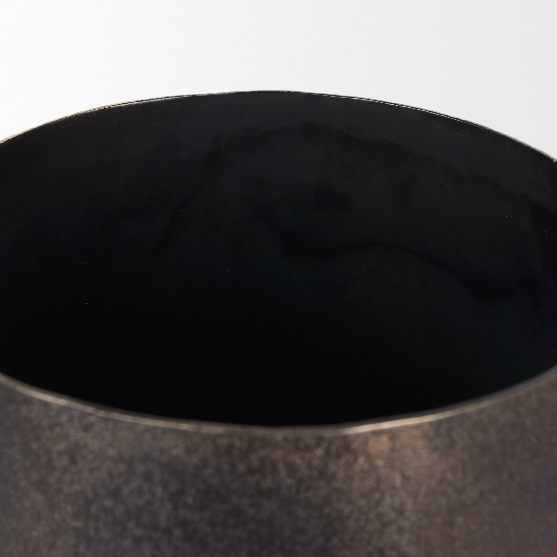Quade is a planter made of textured cast aluminum and finished in an antiqued gold.