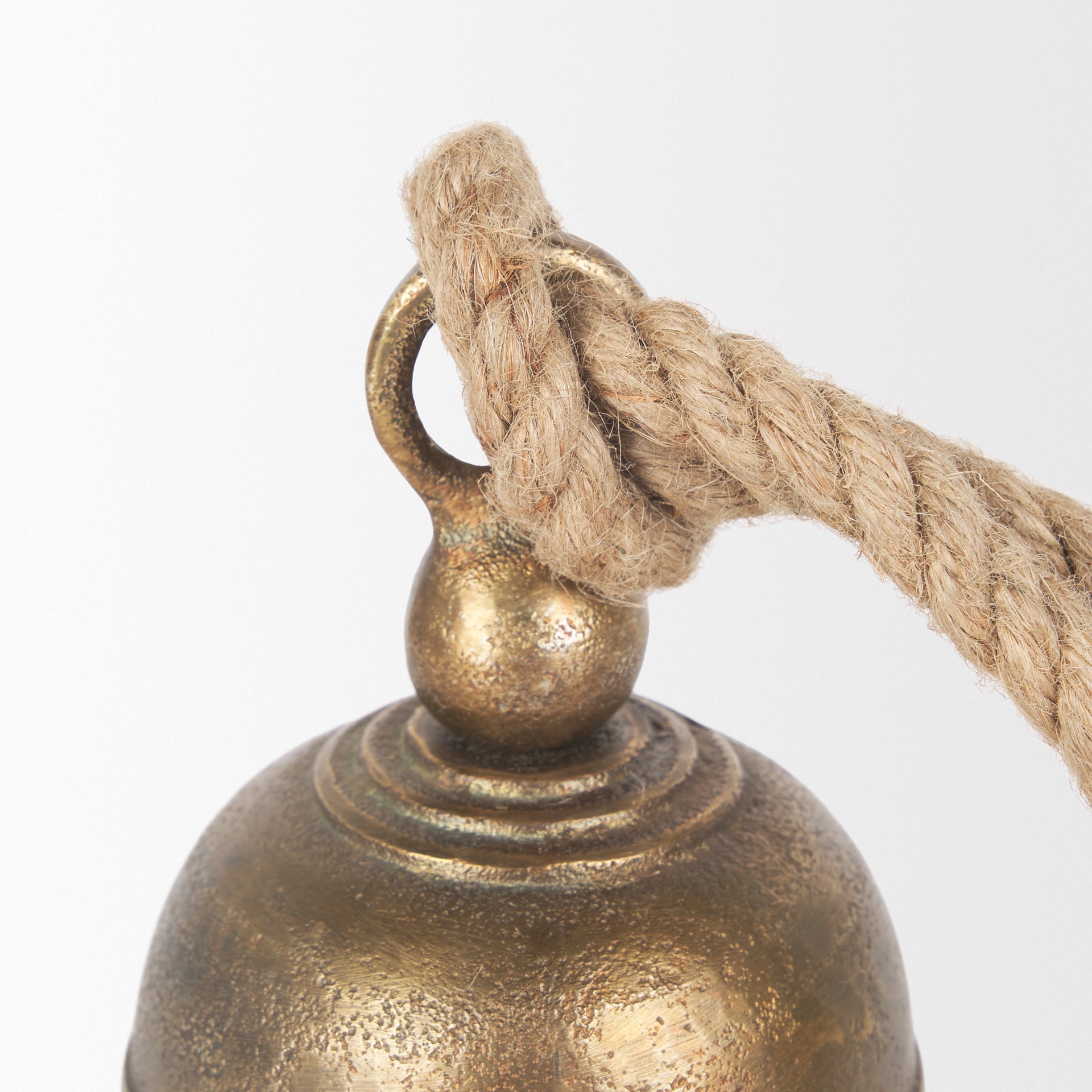 Quincy is a decorative gold metal bell made from cast aluminum, finished with a rope handle.
