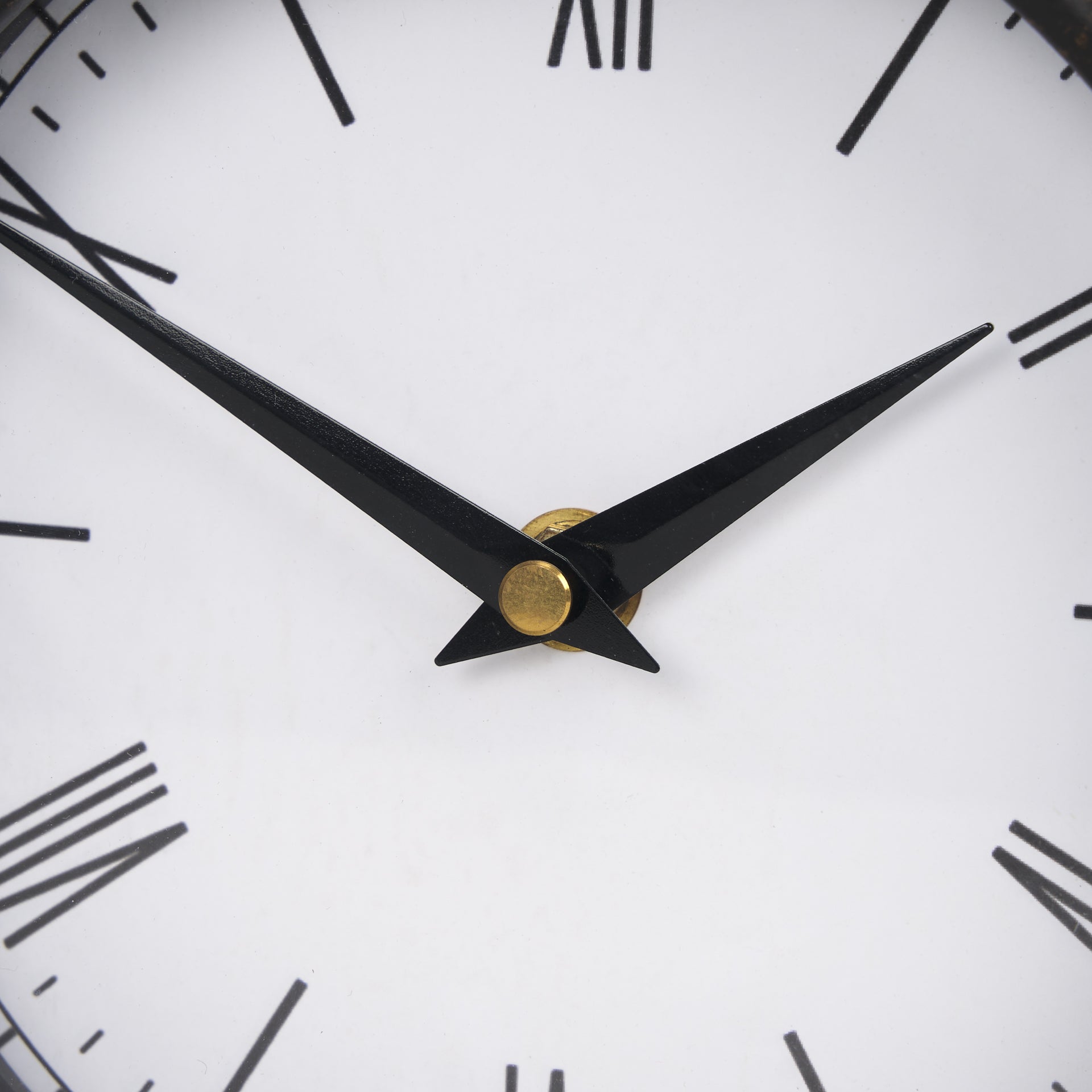 The Raisa Table Clock is crafted from a black metal frame with gold antiquing and has a white face.