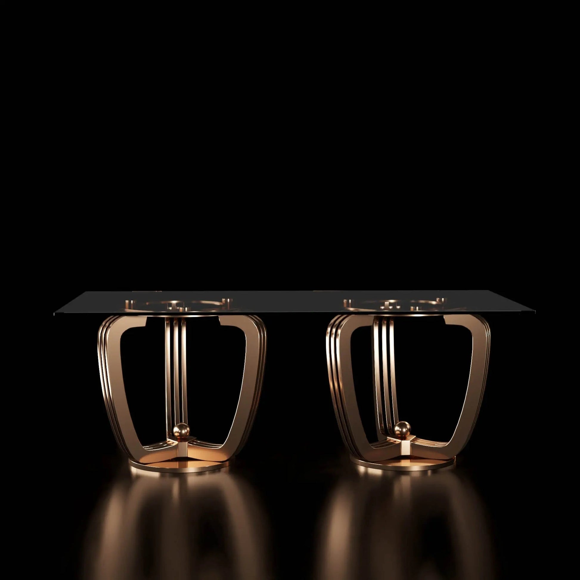 The Regency Rectangle Double Base Dining Table is a stunning centerpiece for any modern dining room. With its sleek, double-base design and polished stainless steel frame available in titanium gold, rose gold, or silver, this table combines elegance with contemporary style. Its rectangular glass top enhances the spacious feel while providing a luxurious and easy-to-clean surface. Perfect for hosting family dinners or formal gatherings, this dining table effortlessly complements a variety of interior styles, from minimalist to glam. Elevate your dining experience with this high-end, durable piece that adds sophistication to any space.