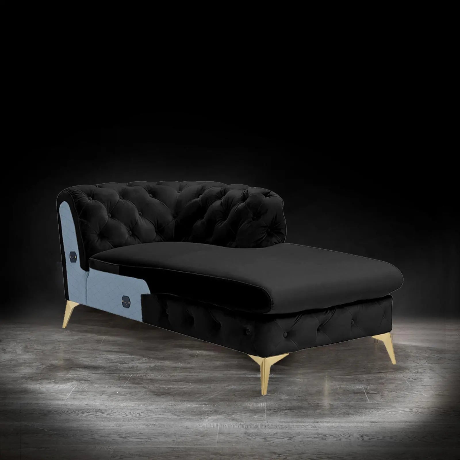 Regina Tufted Sofa chaise sectional is a statement piece like no other. It features tufted arms and back, allowing you to float the piece in the middle of your living room and still have stylish look from the back of the sofa. It features plush cushions for comfort. It is available in multiple colors on the fabric and Stainless steel or titanium gold options on the stylish sofa legs