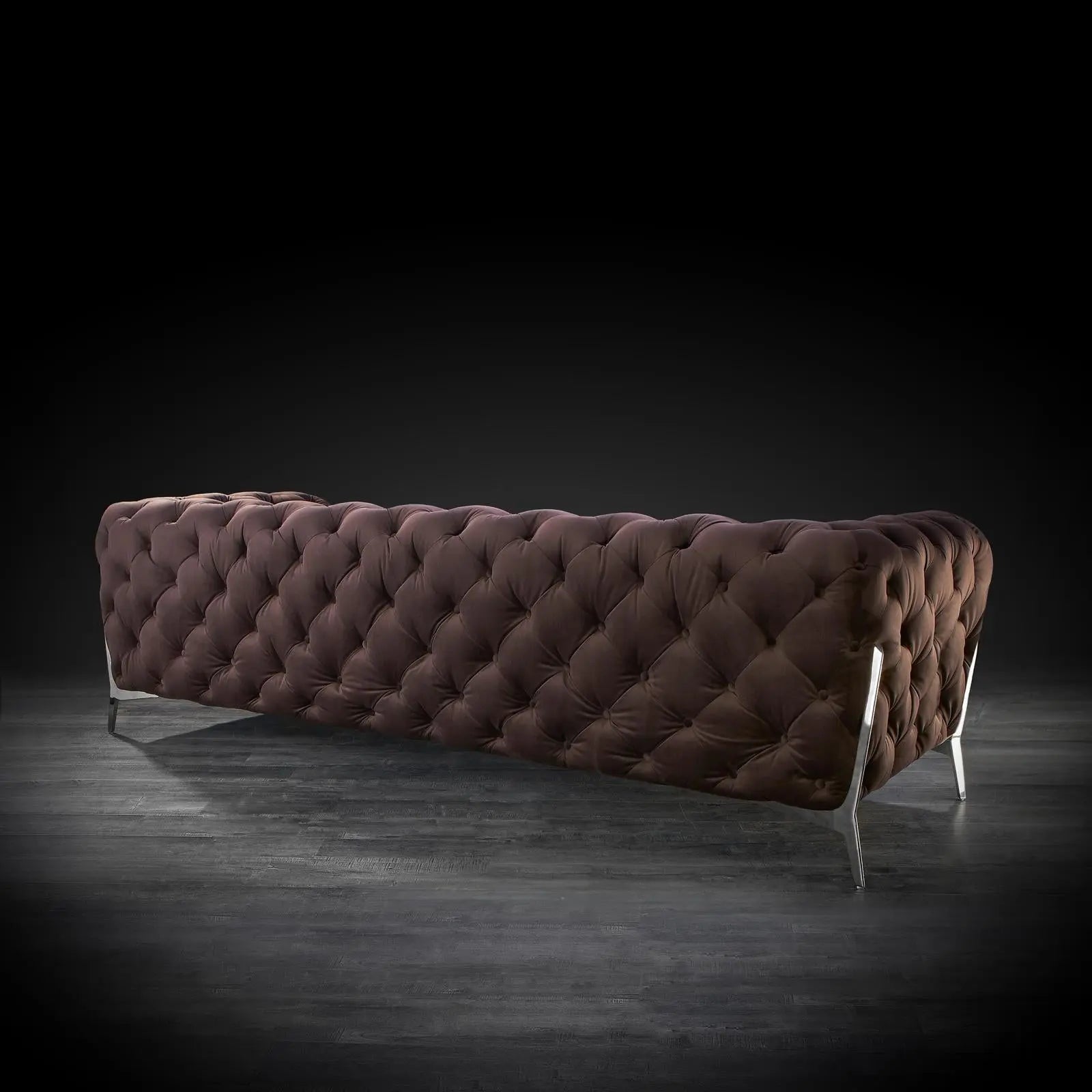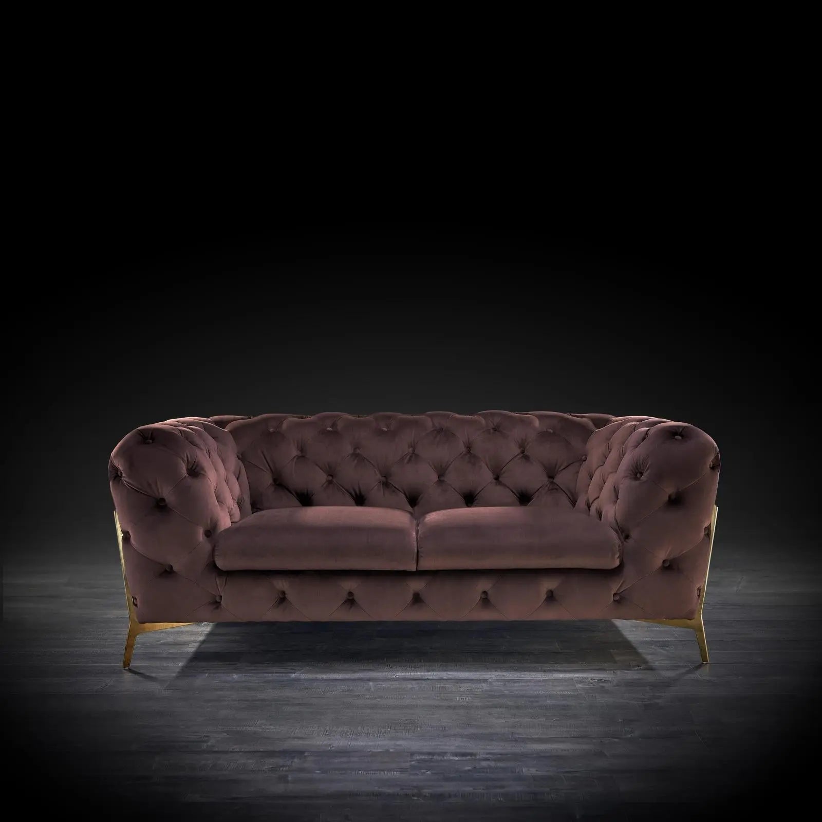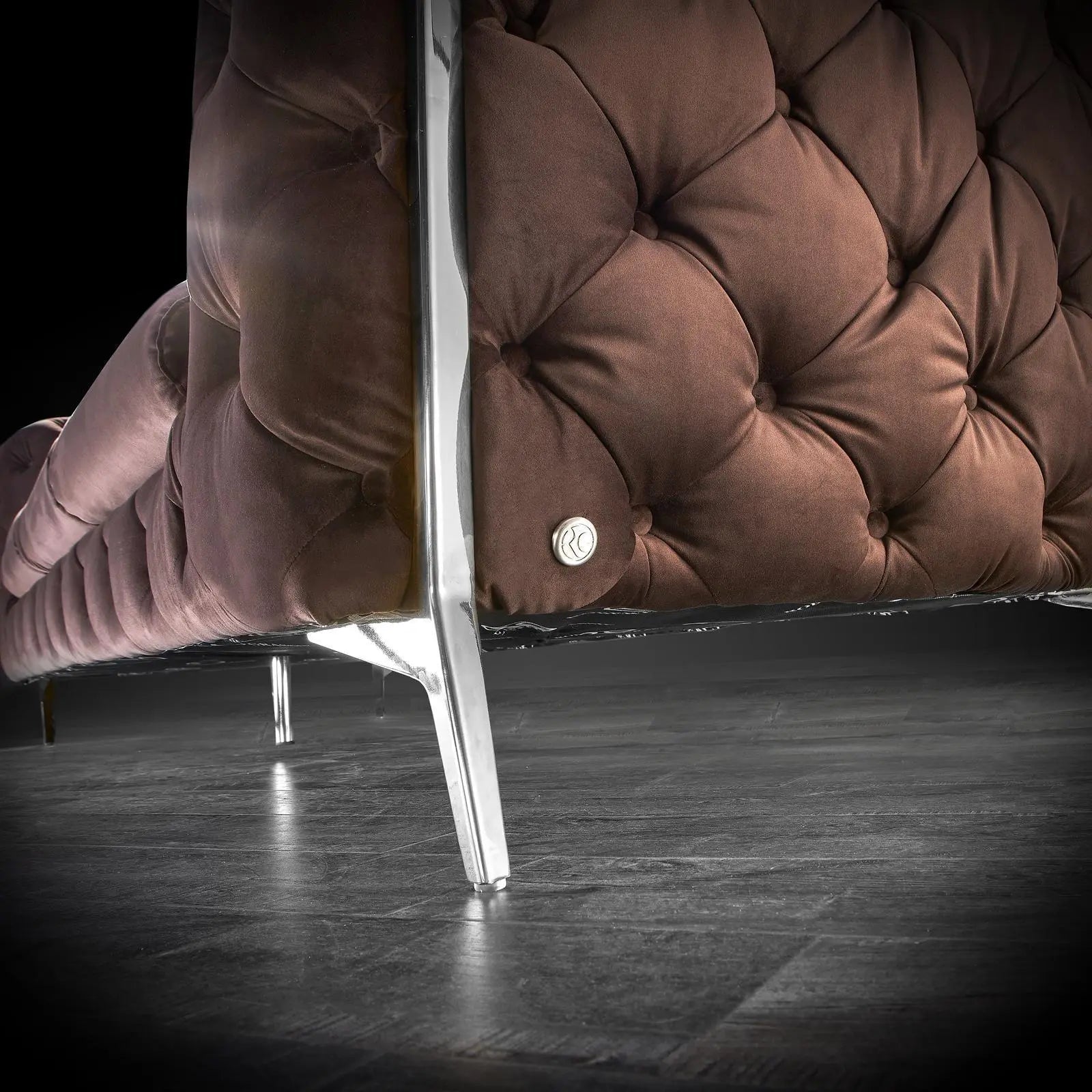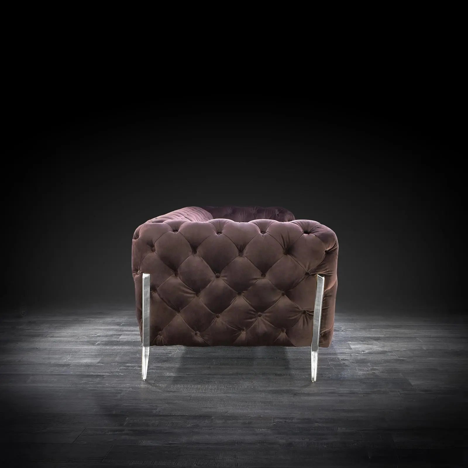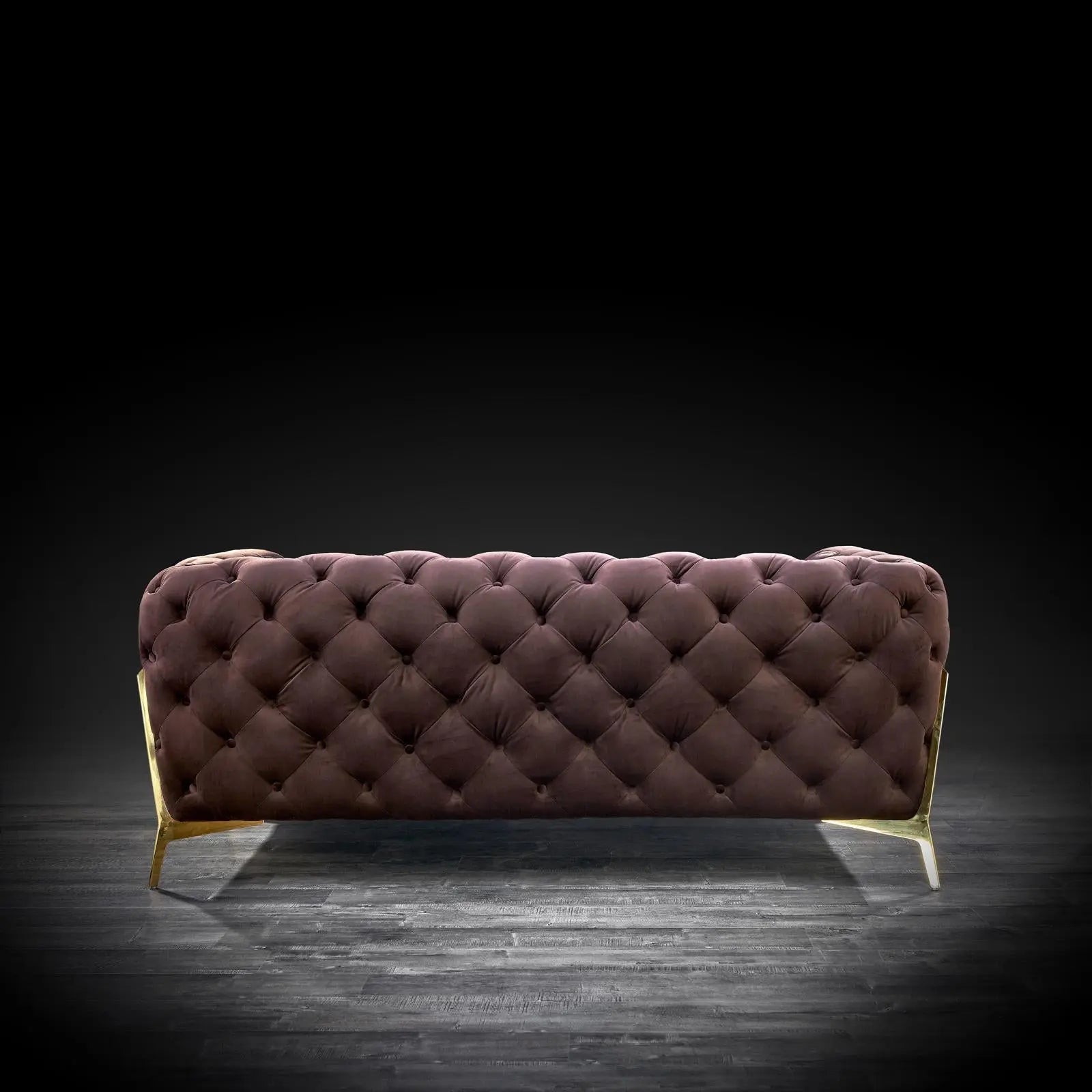 Regina Tufted sofa set is a statement piece like no other. It features tufted arms and back, allowing you to float the piece in the middle of your living room and still have stylish look from the back of the sofa. It features plush cushions for comfort. It is available in multiple colors on the fabric and Stainless steel or Rose gold options on the stylish sofa legs.