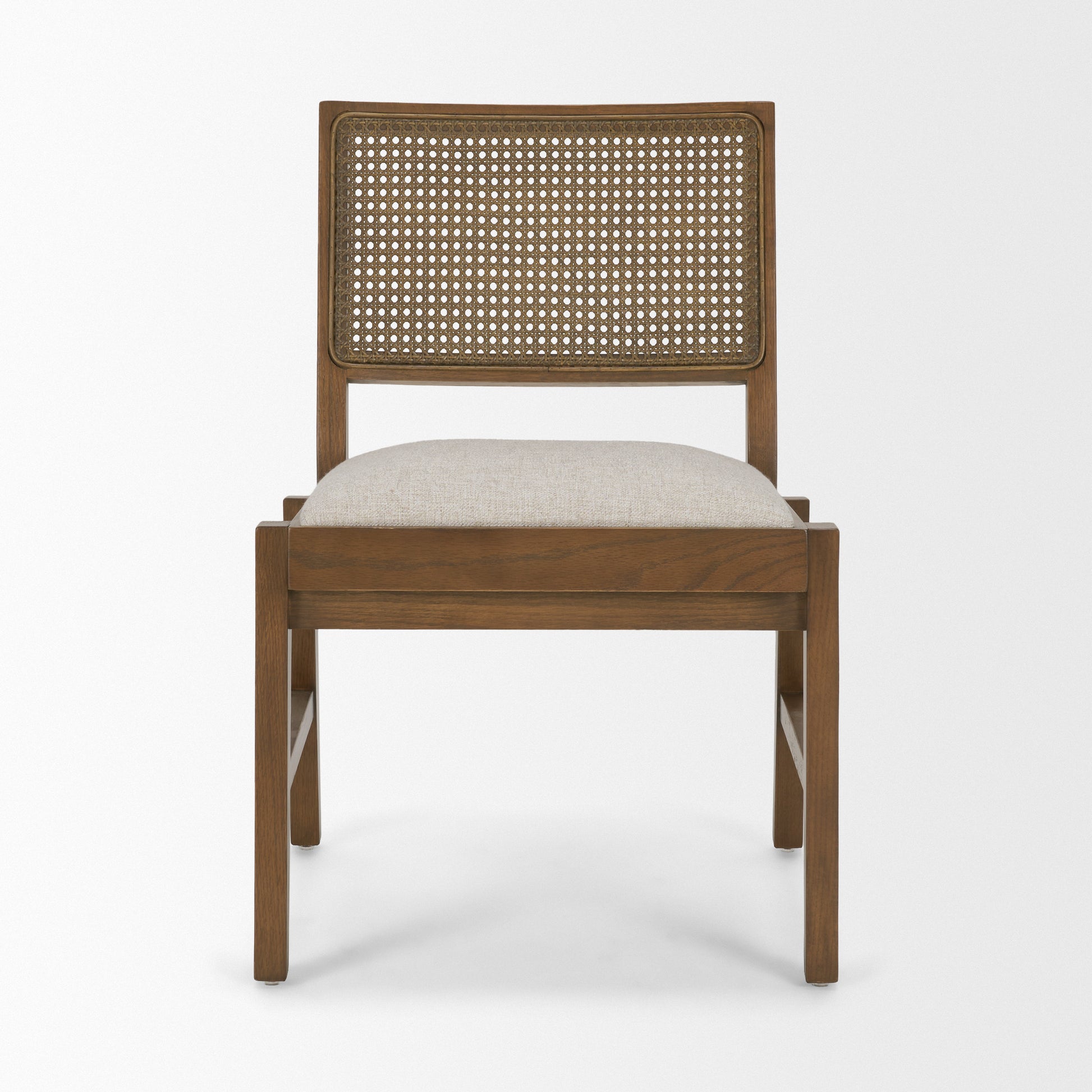 A refined nod to mid-century craftsmanship, the Reid side chair blends warmth and elegance with its solid oak frame in a rich brown finish. The handwoven cane back adds airy texture and artisanal charm, while the plush cream linen-blend seat offers tailored comfort and everyday durability. Perfectly balanced in profile and proportion, this chair elevates any dining setting with timeless character and ease.