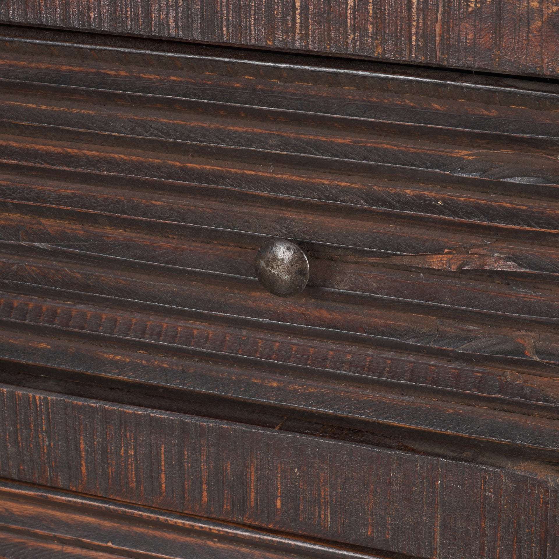 The Rhett 3-drawer accent cabinet is crafted entirely from reclaimed wood in a mid-dark brown finish with red undertones, highlighting its natural imperfections and rich character. Sharp-ridge carved fronts and rustic iron knobs bring added texture and a timeworn, handcrafted appeal.