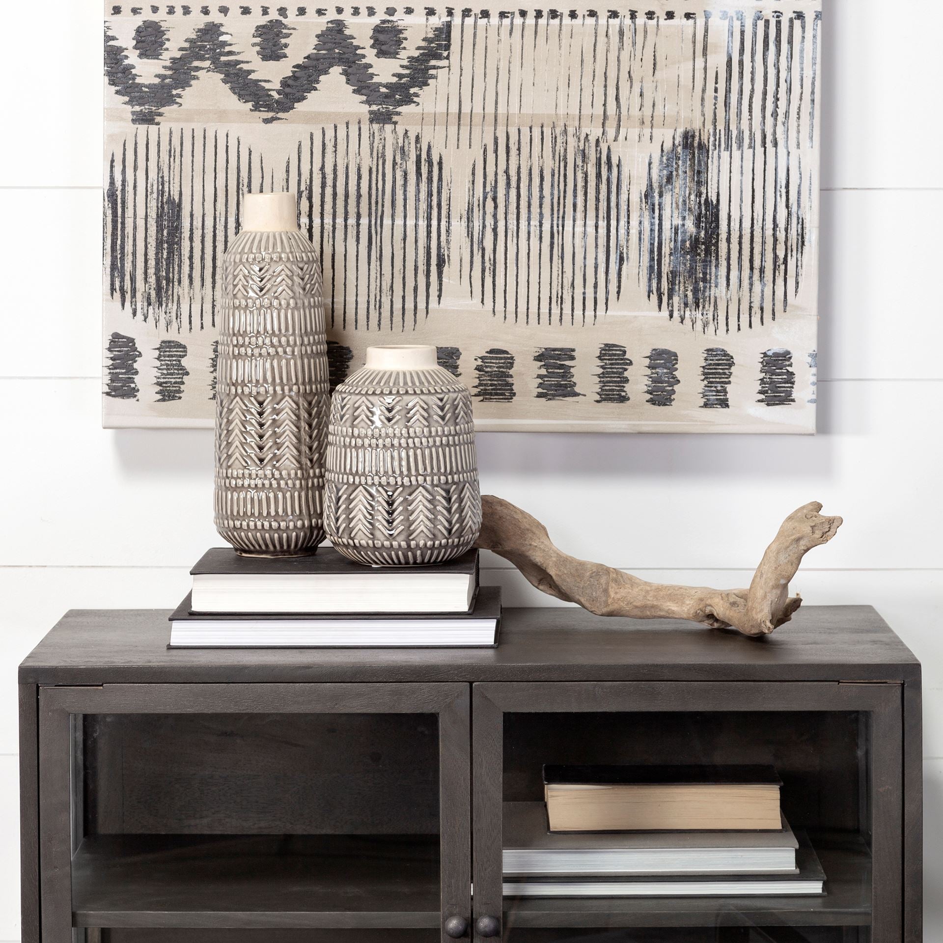 The Riker is finished in a spectacular cream tone with an intricate, geometric pattern on it, making it a stunning vase that is sure to turn heads.Β