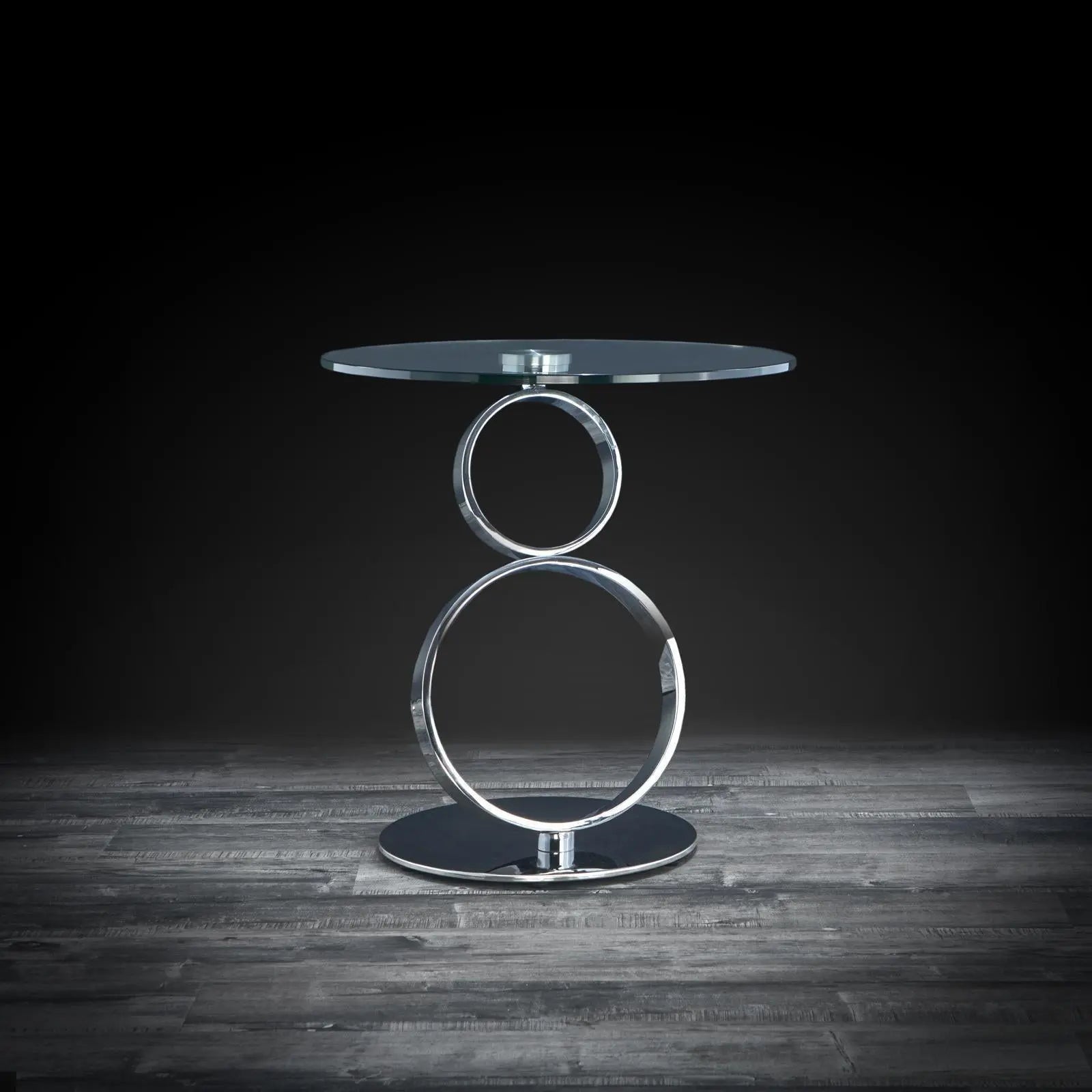 Ring end table features polished stainless steel base with clear glass top. It is a large size end table which complements the ring coffee table perfectly. The rings are placed at a slight angle and the glass also sits on top with an opposite angle and therefore giving the illusion of a balancing act. It can also be used as a bed side table for a modern setup.