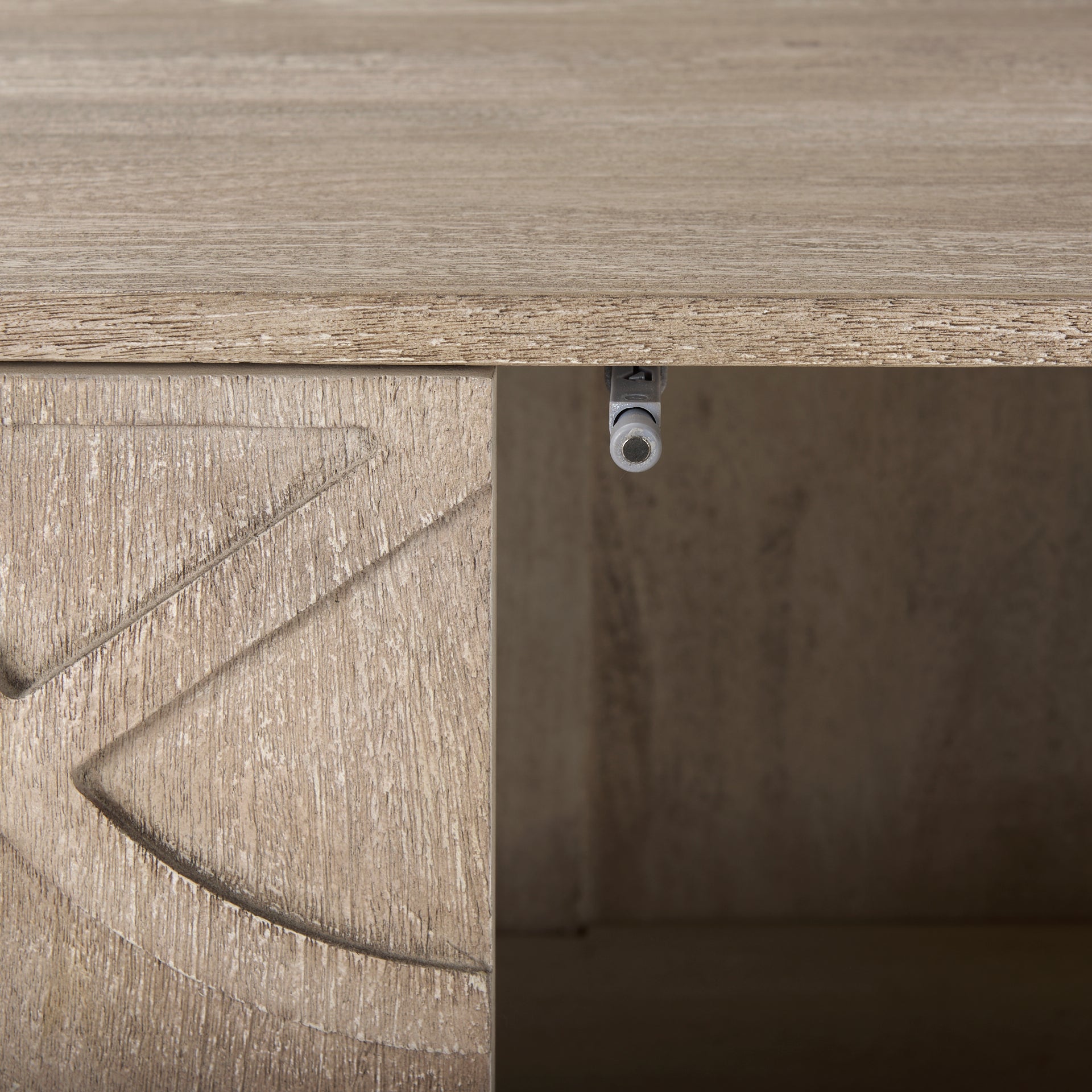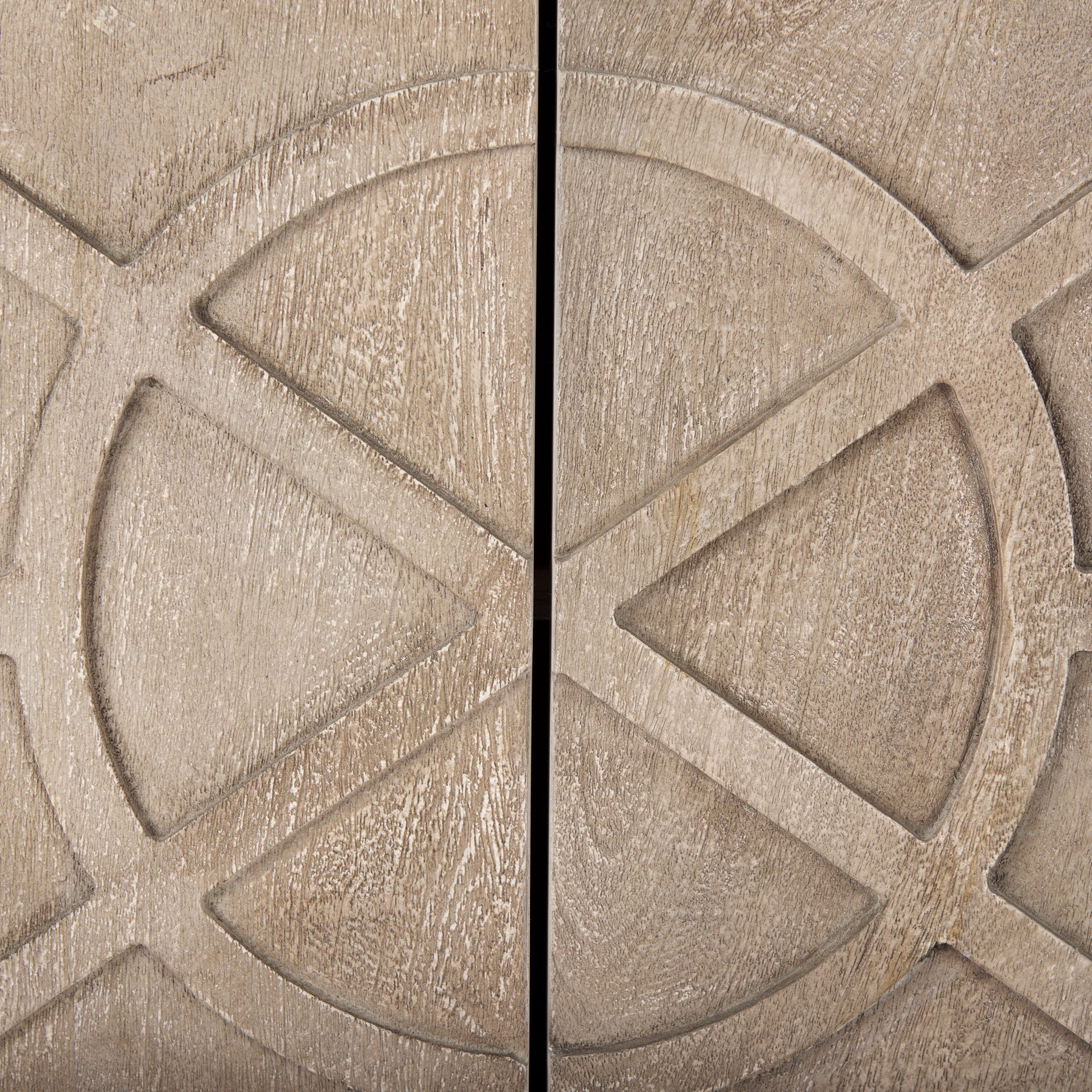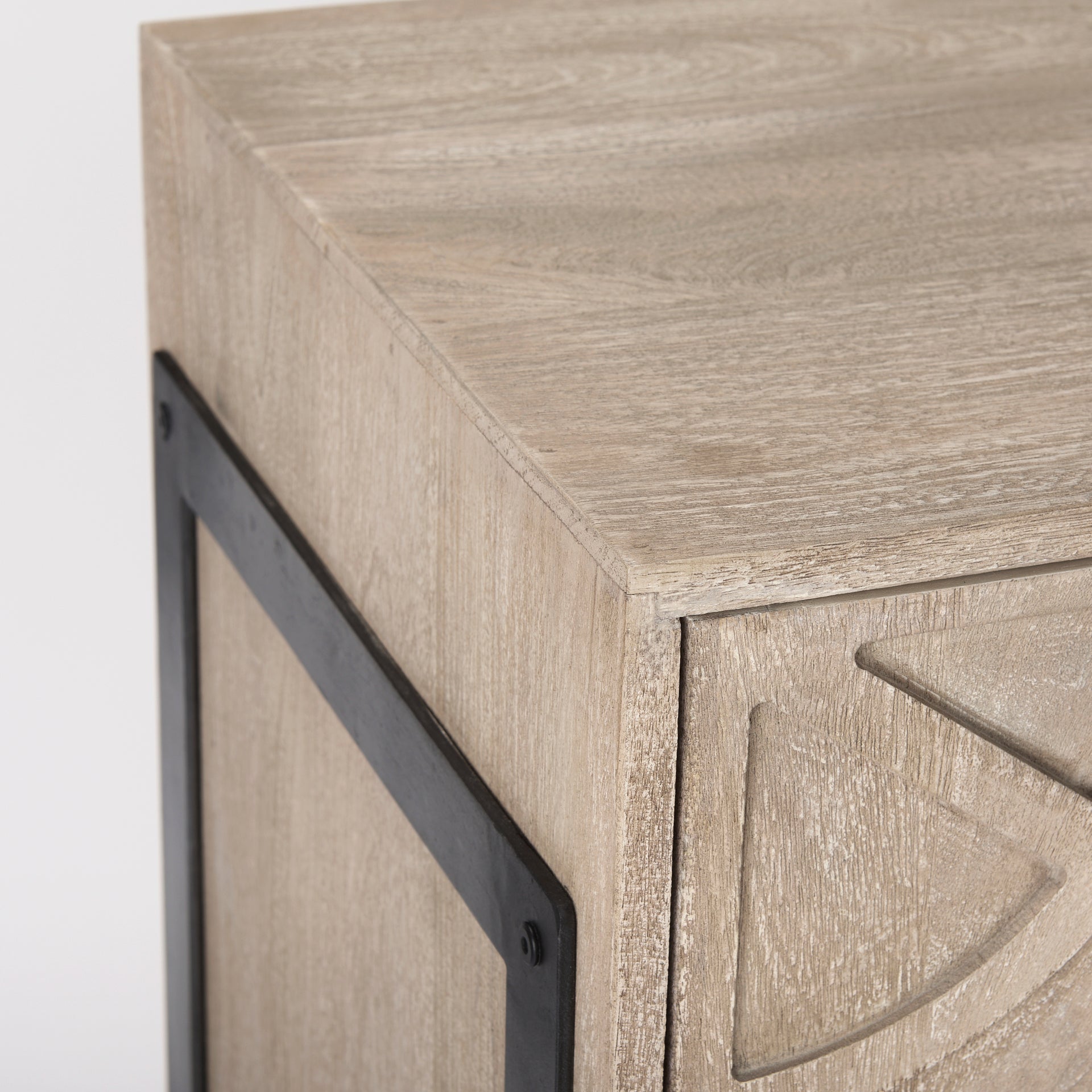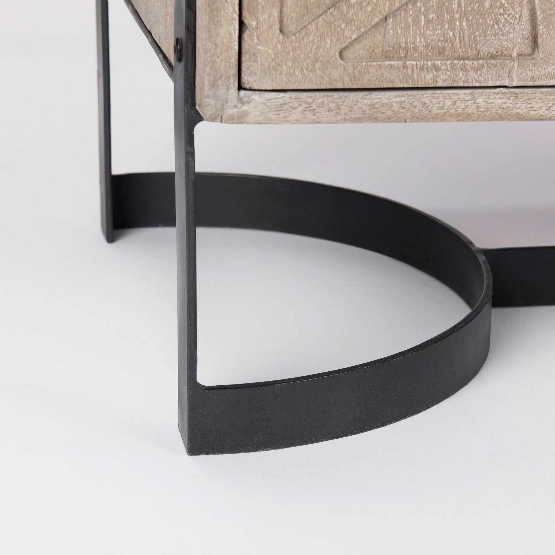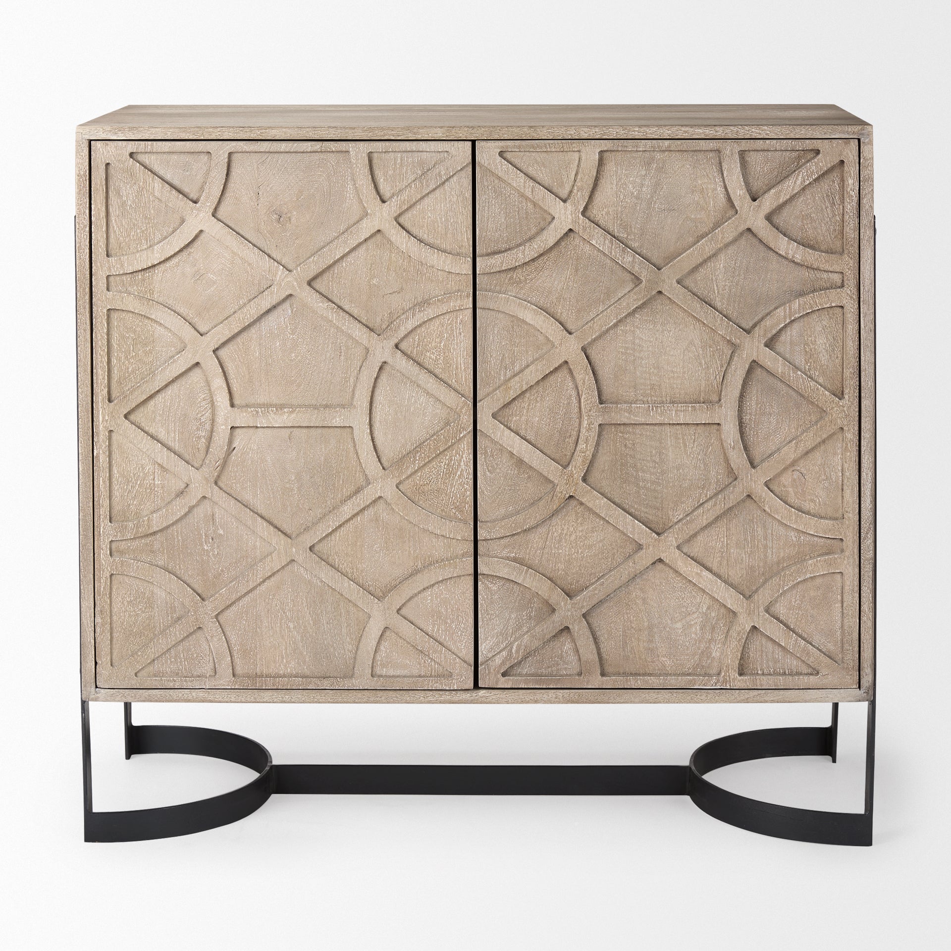 Rivien Accent Cabinet is a light brown, solid wood accent cabinet with a matte black metal frame.