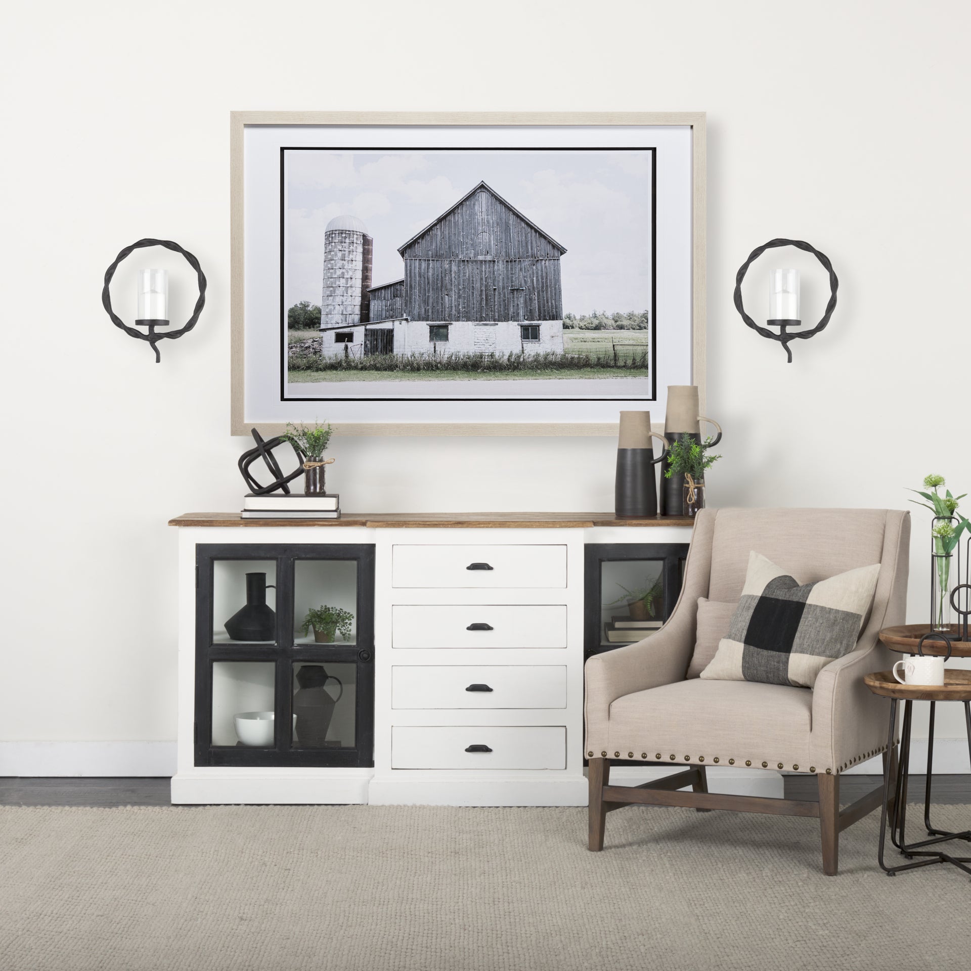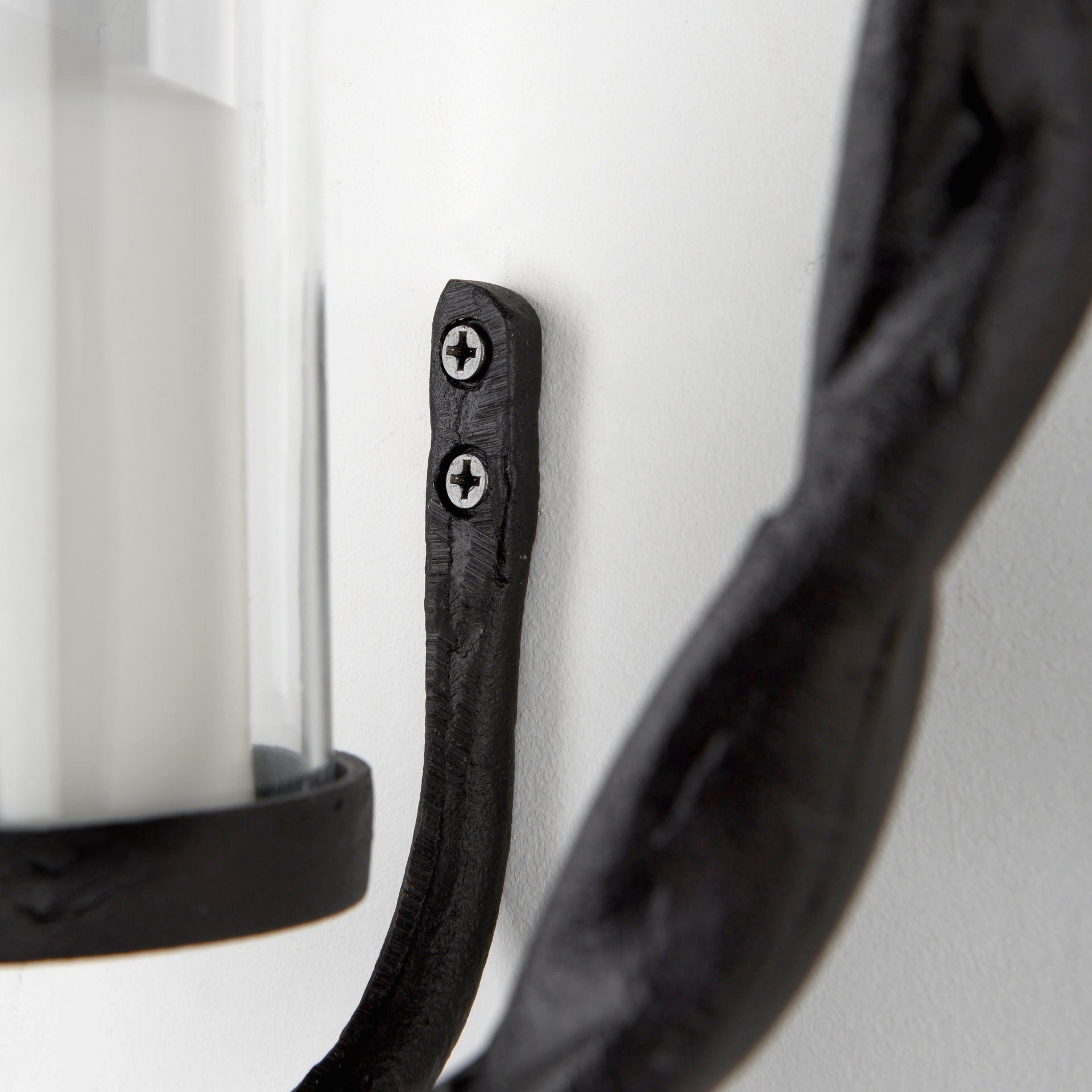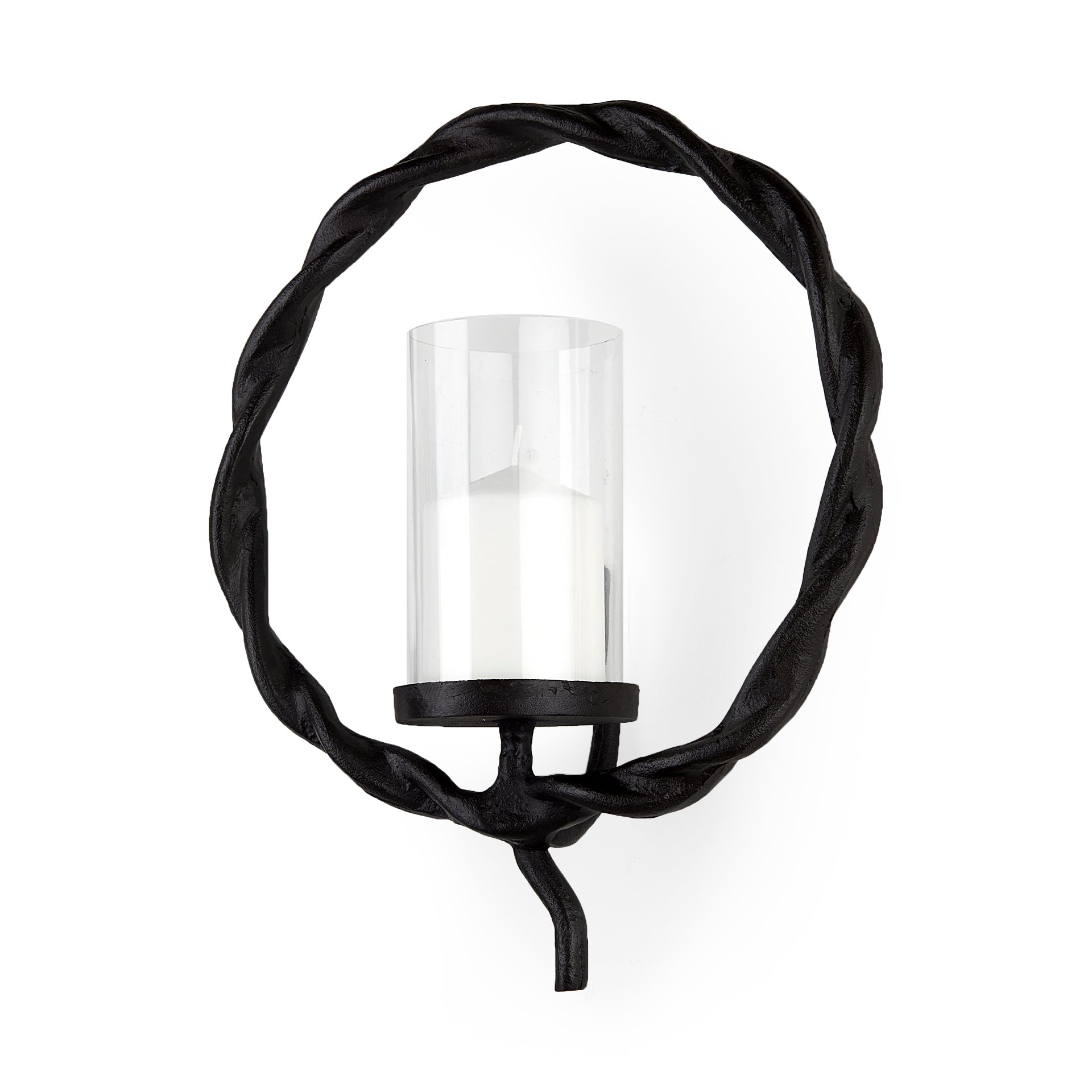 Add a touch of artistic ambiance with the Rizwan candle holder, a braided sculptural wreath crafted from cast aluminum encircling a cylindrical glass candle holder.Β