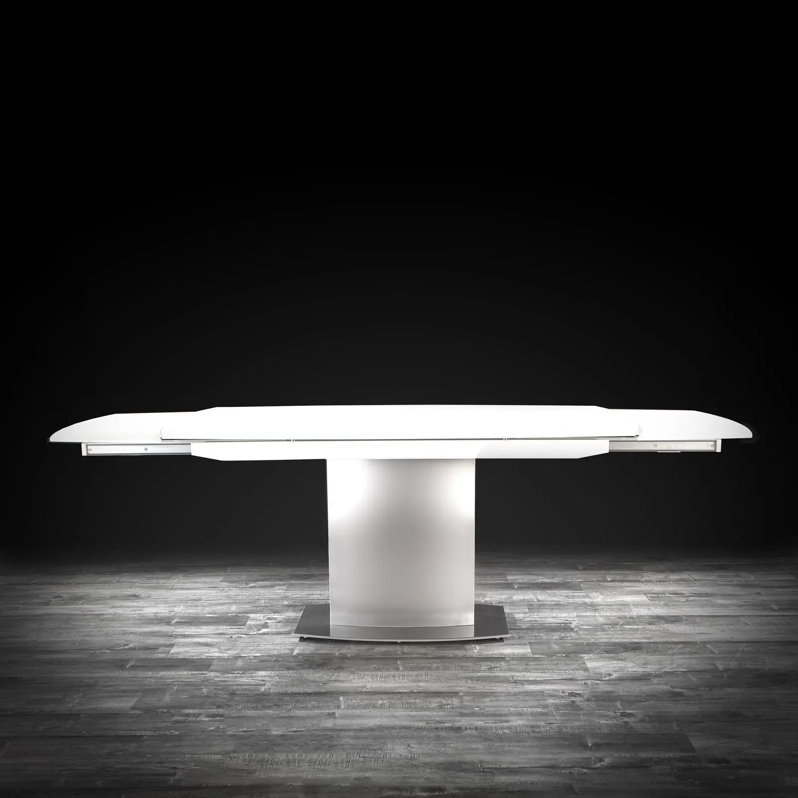 Romeo matte White Extendable Dining Table 10mm an acid washed tempered matte white glass top, brushed stainless steel base. Smooth mechanism expands the dining from both ends with one motion. The handle is located underneath the extension leaf.