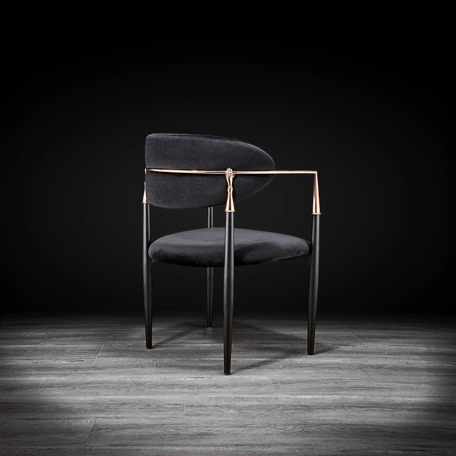 Roubi dining chair with fulfilling Rose Gold armrests and matte black frame design. The chair has Bauhaus modern layout with elegant new materials. The velvet upholstery gives the chair a luxurious feel and look while the Rose Gold stainless-steel finish on the frame adds a touch of contemporary to this irresistible chair by Norhaus Furniture.