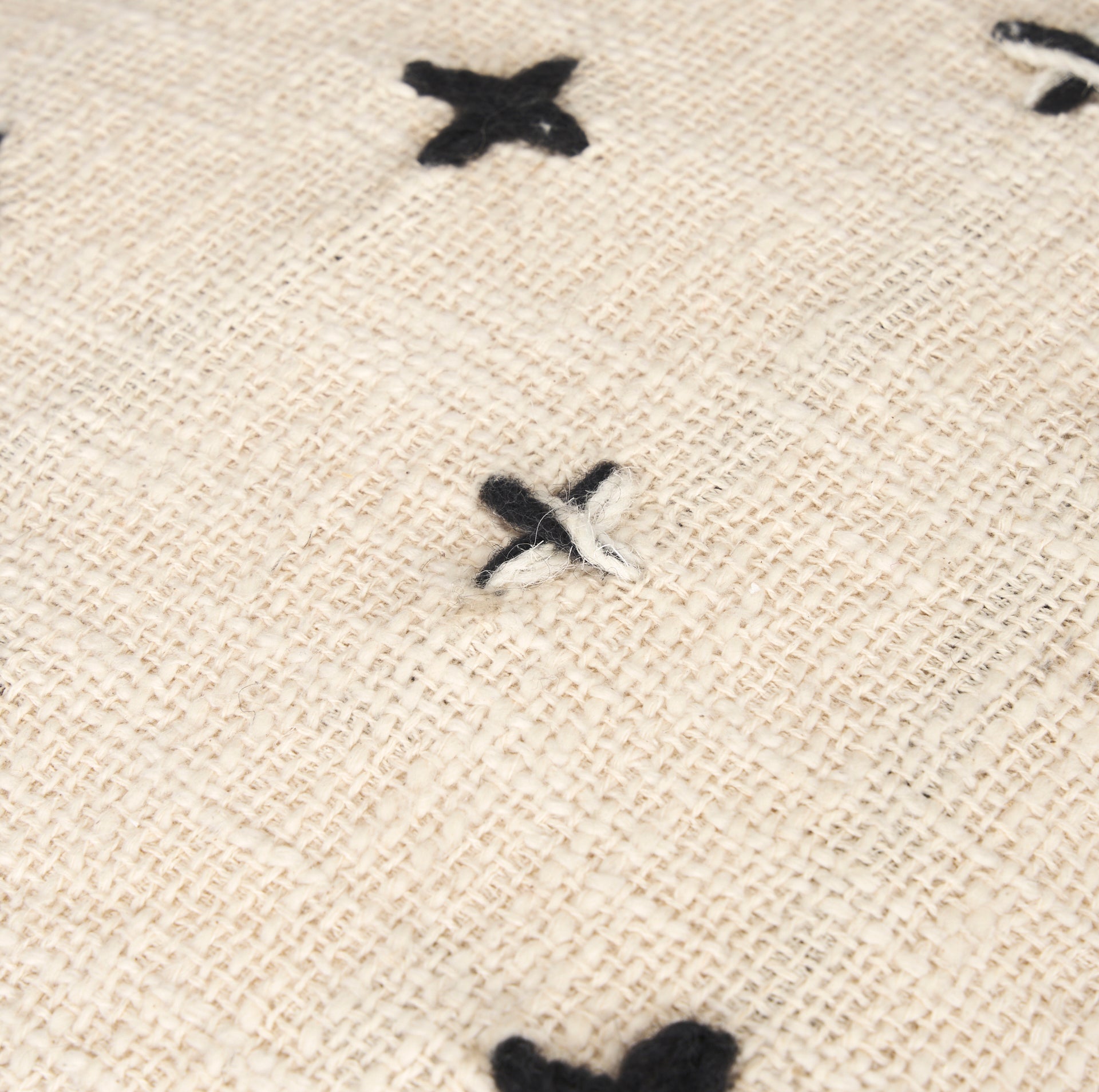 Saanvi Pouf is handwoven from cream wool and stitched with a black and cream cross pattern.