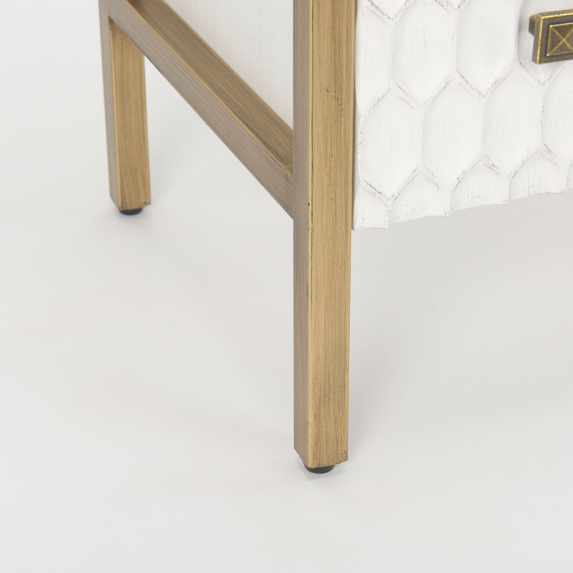 A sturdy, three-drawer accent cabinet with a honeycombed façade with a distressed white finished and gold-brushed metal frame and pulls.