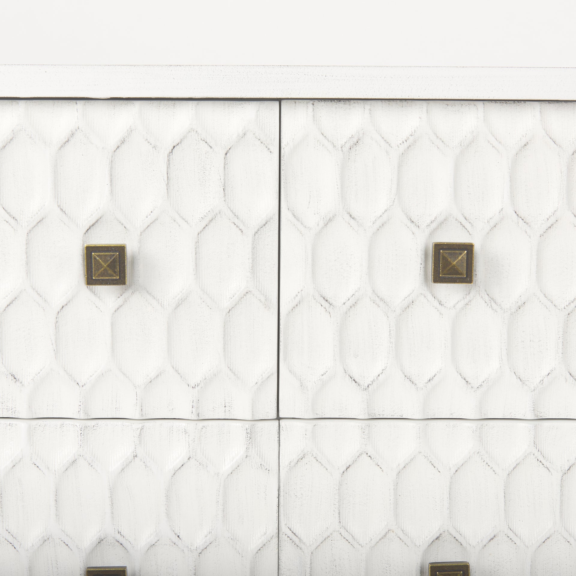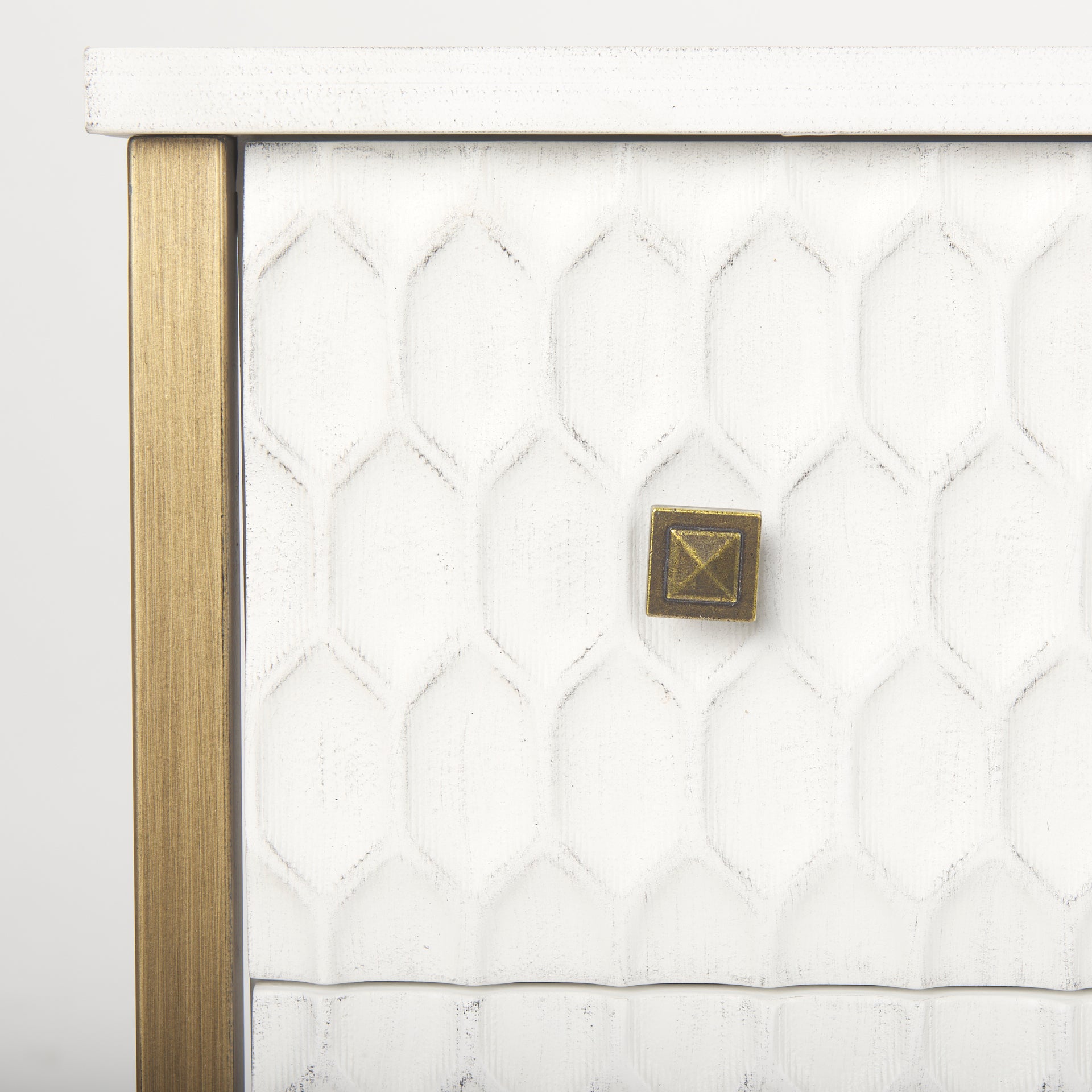This Savannah sideboard features six carved cabinet drawers and fir veneer finished in distressed white with a gold-brushed metal frame and dainty metal handles.