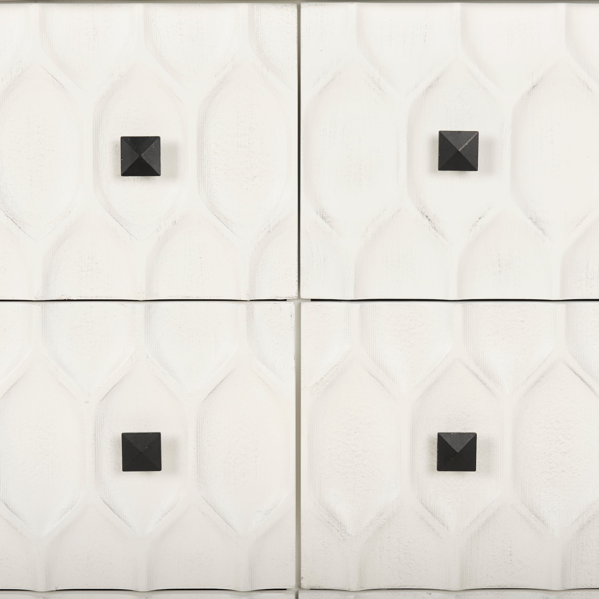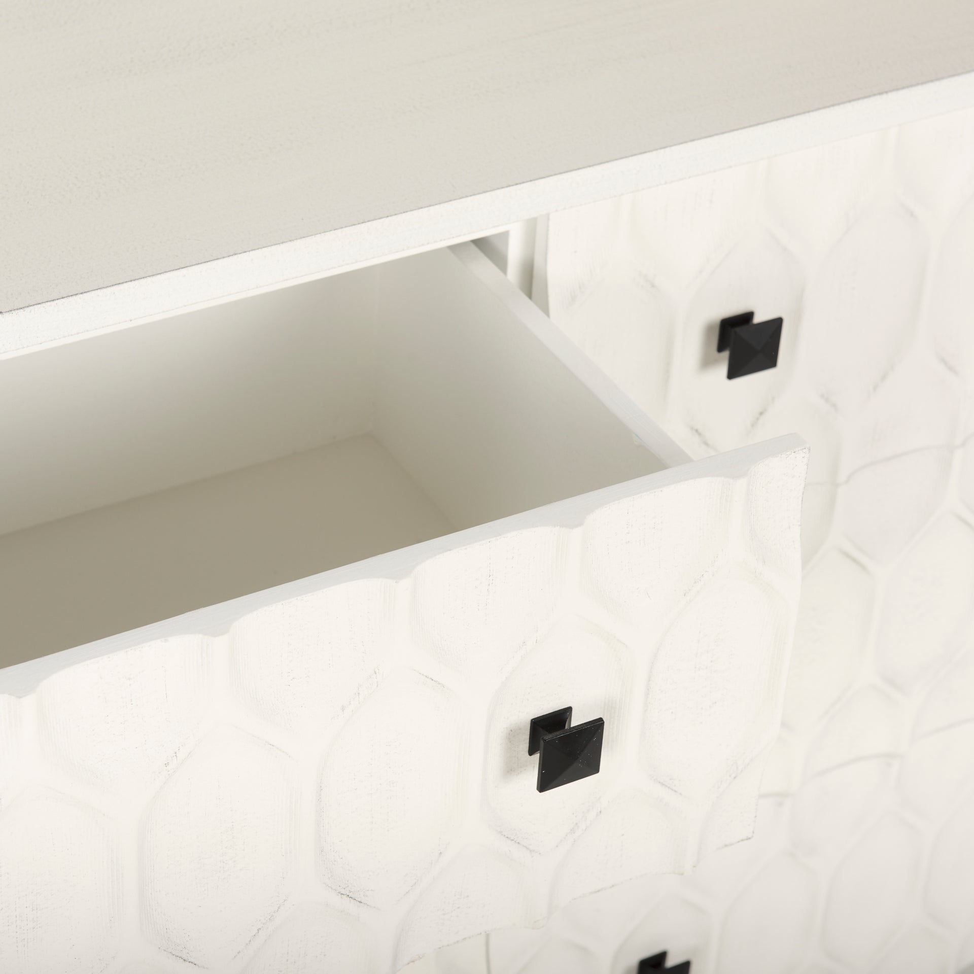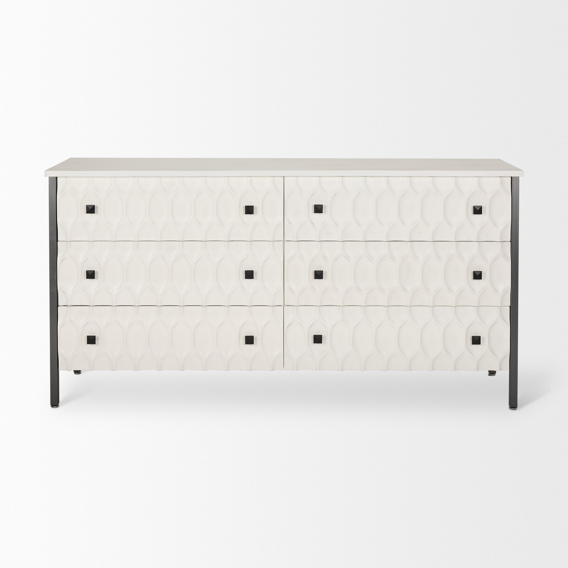 This Savannah sideboard features six carved cabinet drawers and fir veneer finished in distressed white with silver metal frame and dainty silver metal handles.