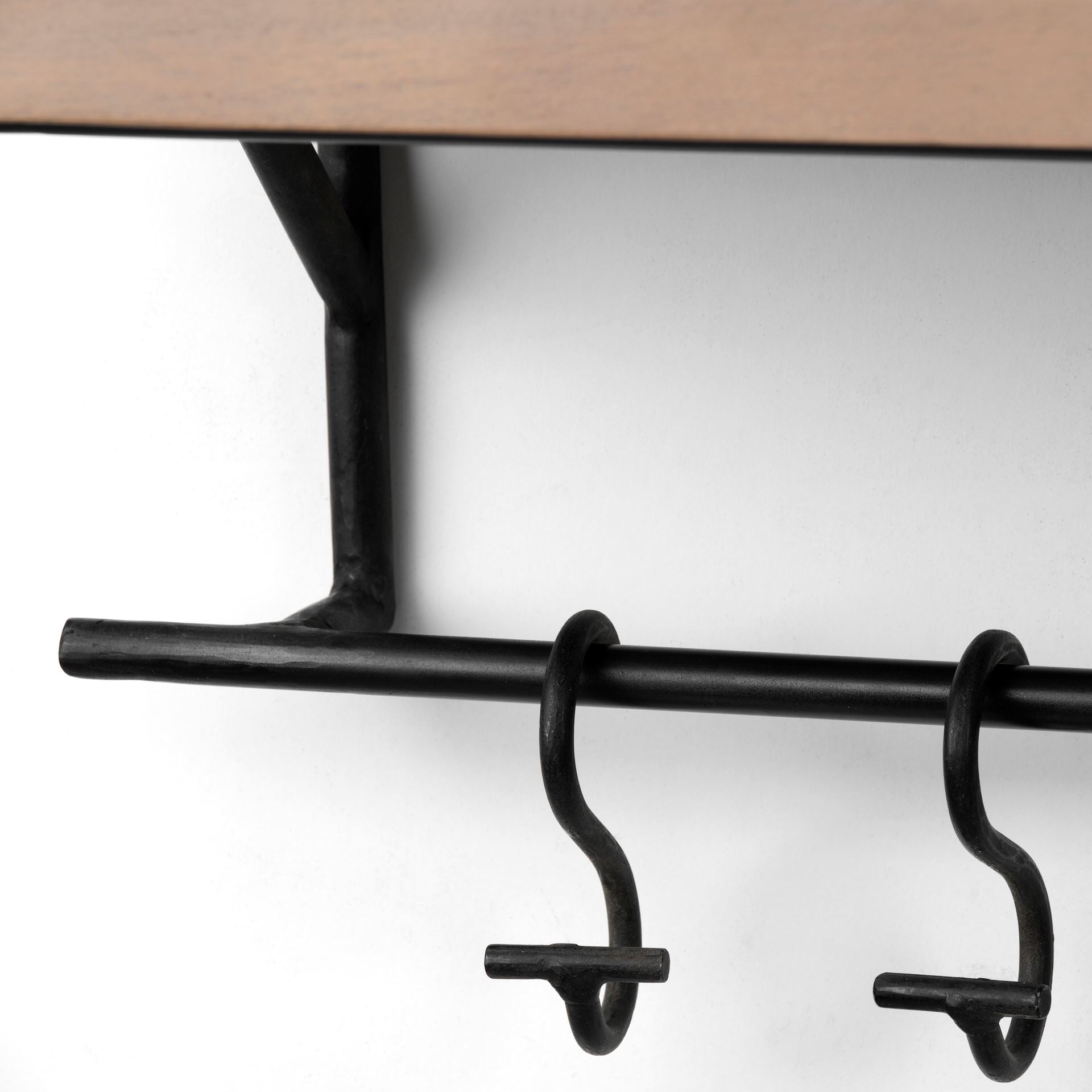 The Schutt I wall-mounted wooden shelf flaunts a natural wood finish with matte-black polished metal hanging hooks.Β
