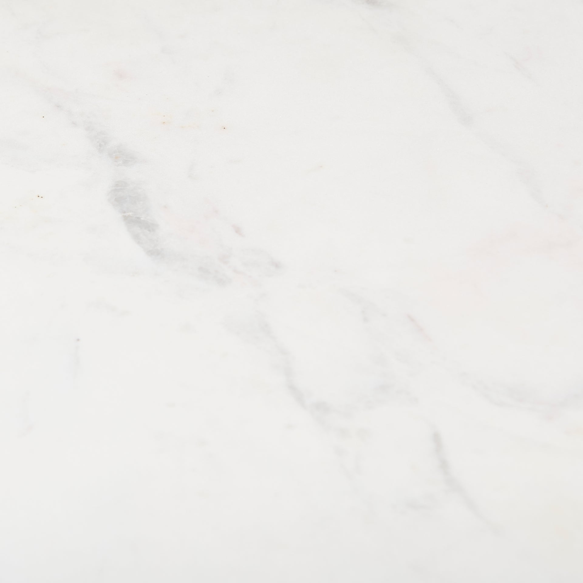 Serre End Table has a smooth, round white marble top secured on a matte black metal base that has 3 legs.