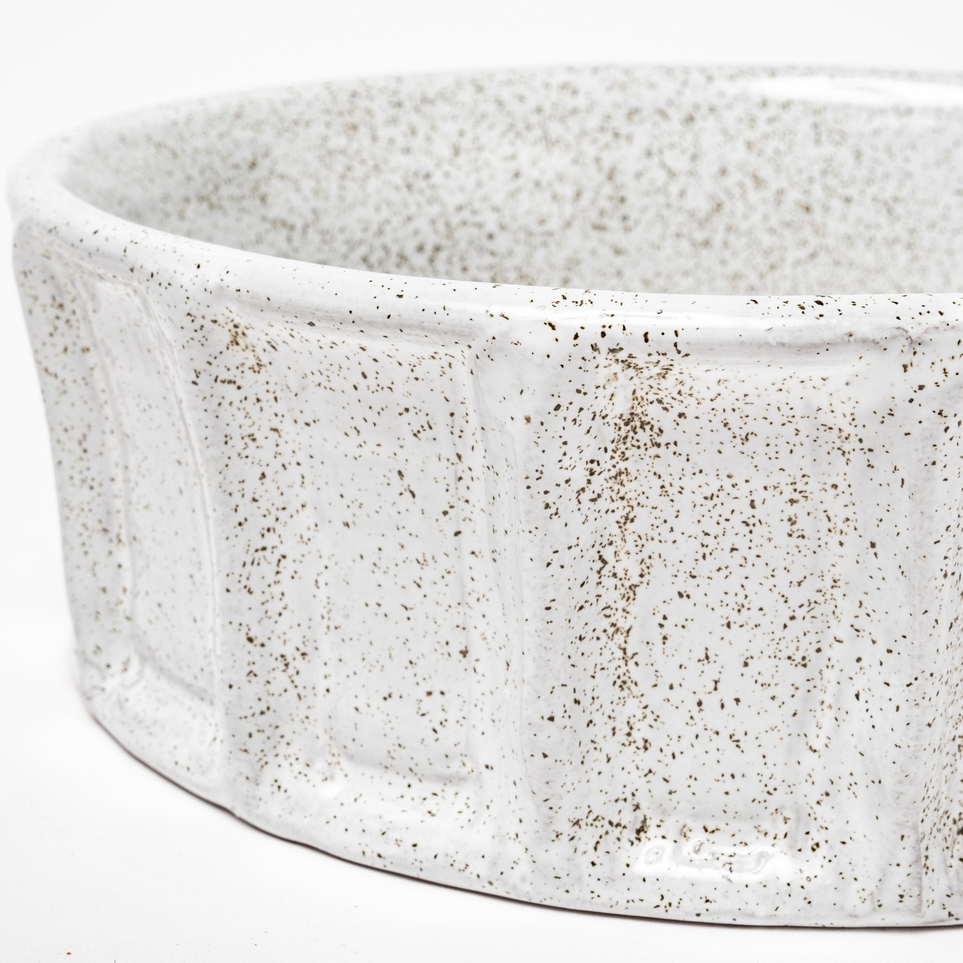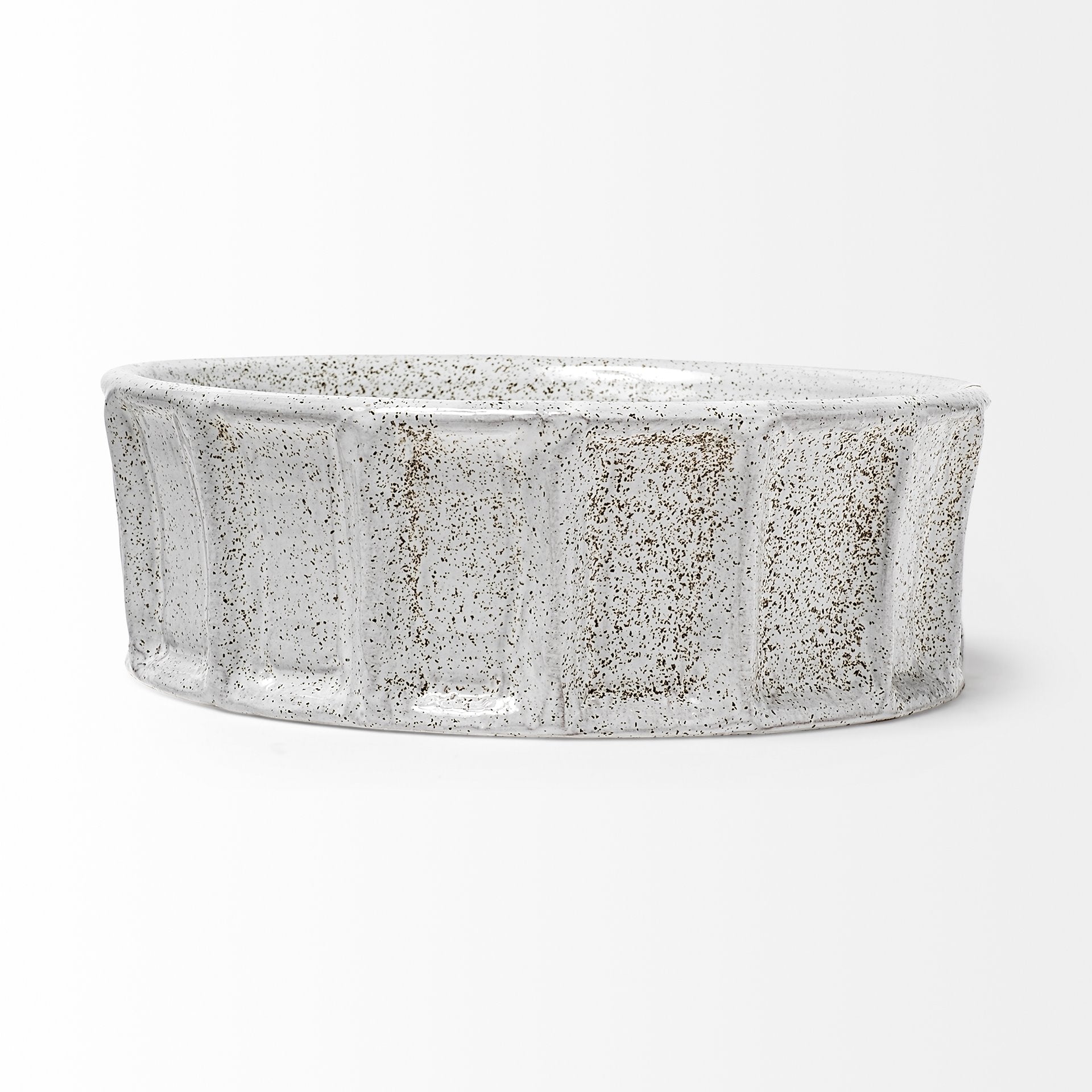 The Silone I, the smaller of the bowls from the Silone series, is crafted from ceramic and finished in a glossy white tone with brown speckled details.