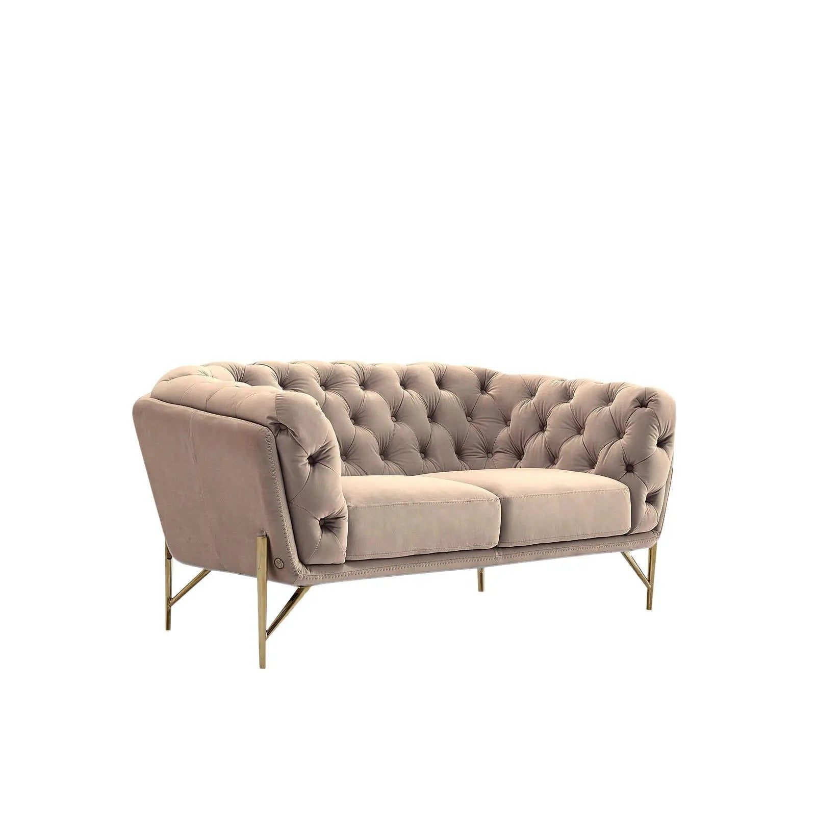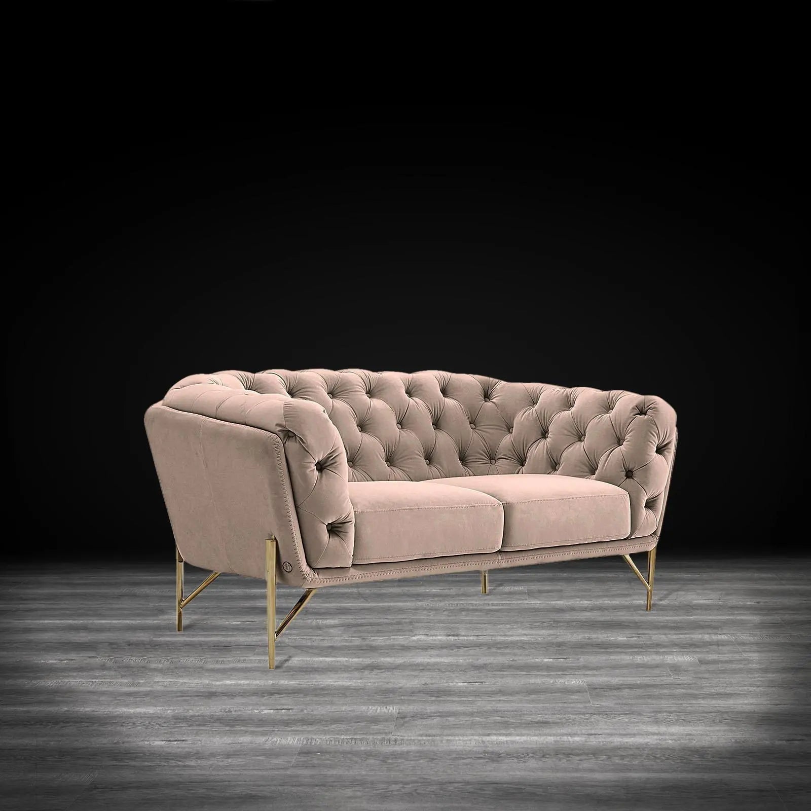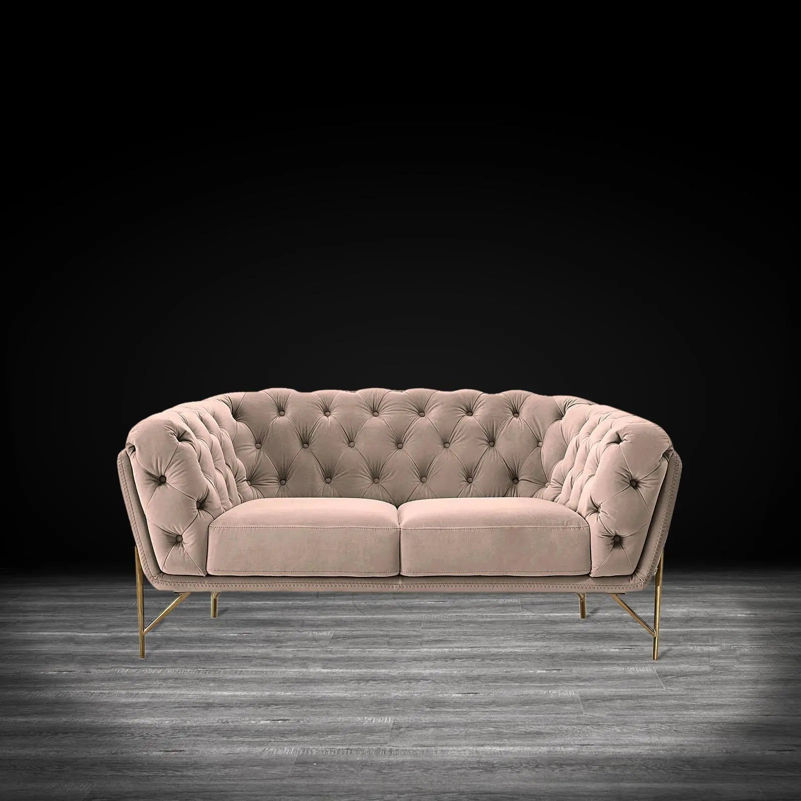 Sofia Tufted Sofa set is a statement piece like no other. It features tufted arms and back cushion. It features plush cushions for comfort and a very unique frame shape. It is available in multiple colors on the fabric and has gold stylish sofa legs.