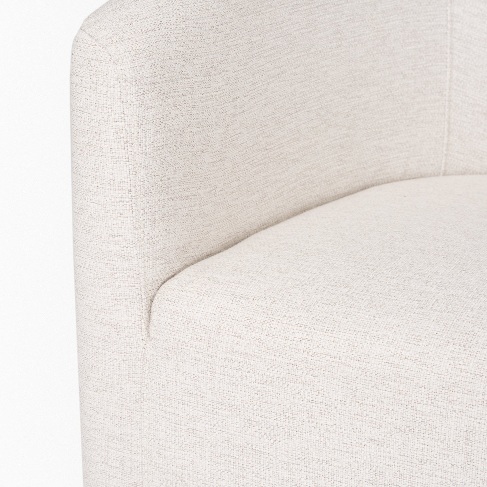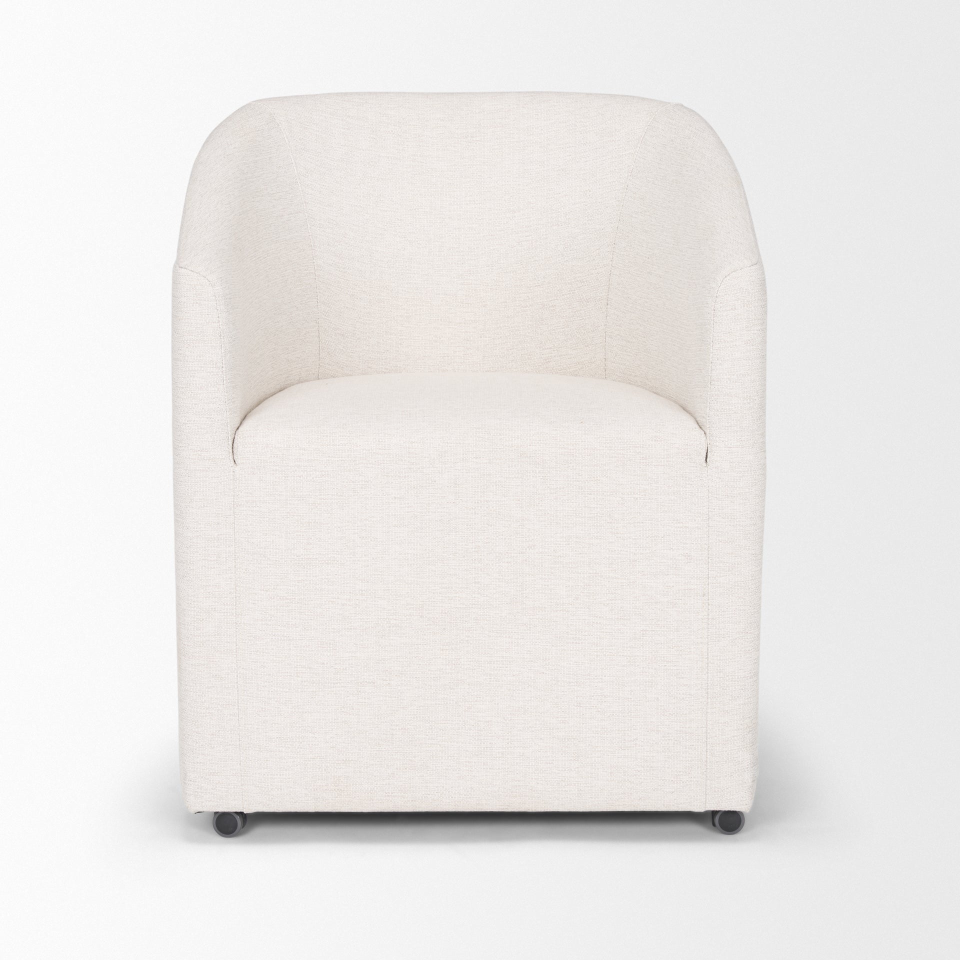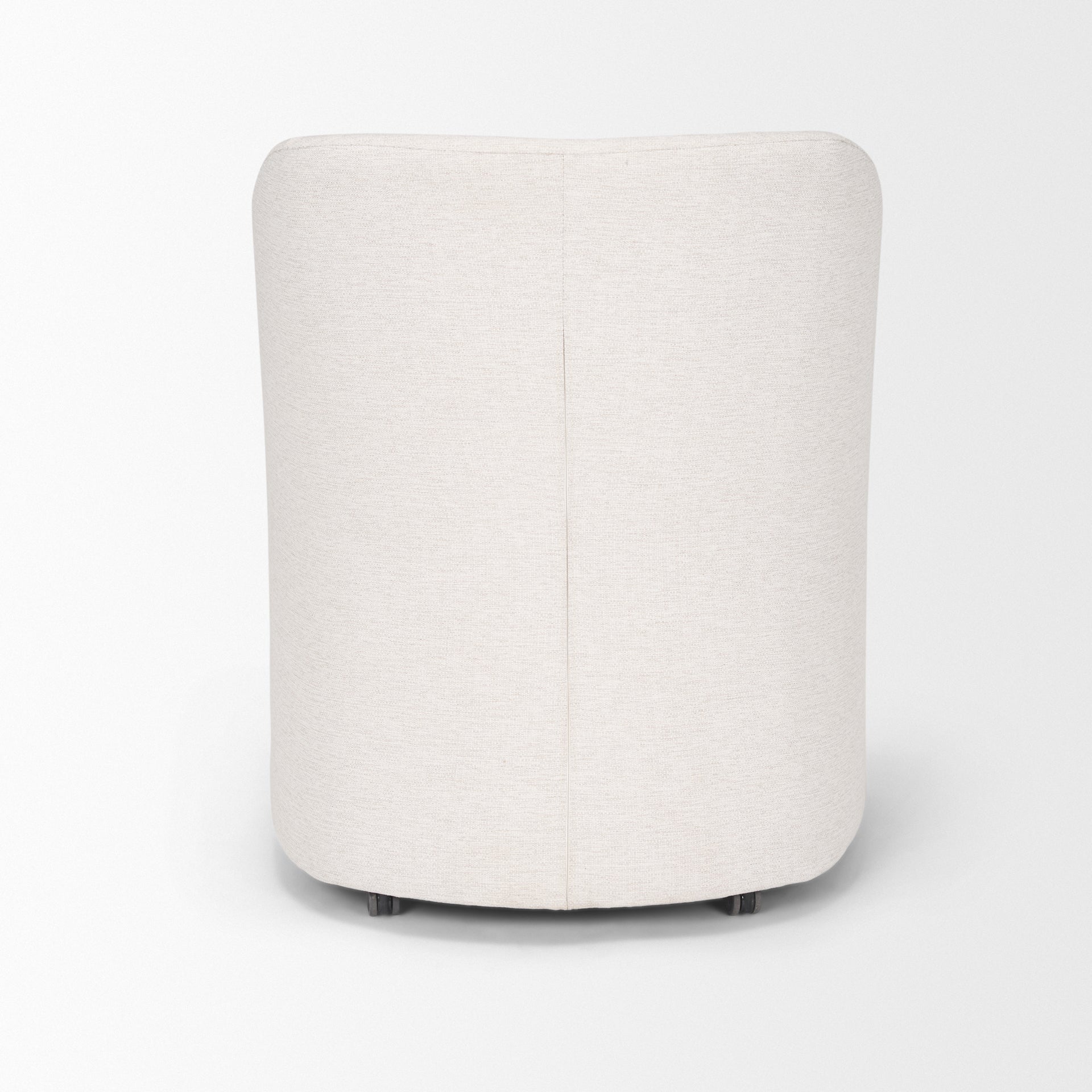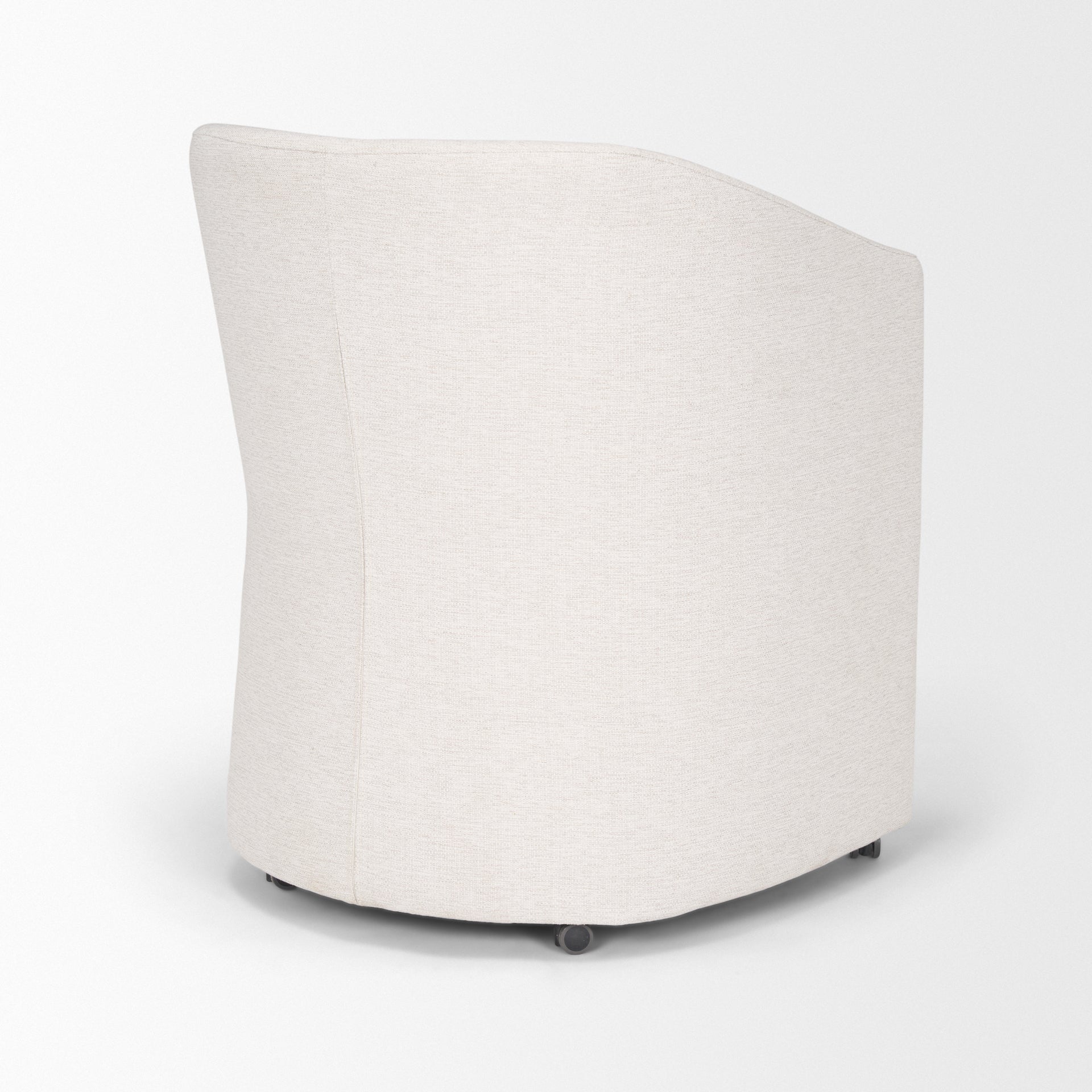 A refined take on casual comfort, the Sondra Dining Chair pairs tailored elegance with everyday ease. Wrapped in soft beige fabric, its curved tub-style form offers a cocooning seat, while discreet caster wheels add effortless mobility for dining or workspace versatility.