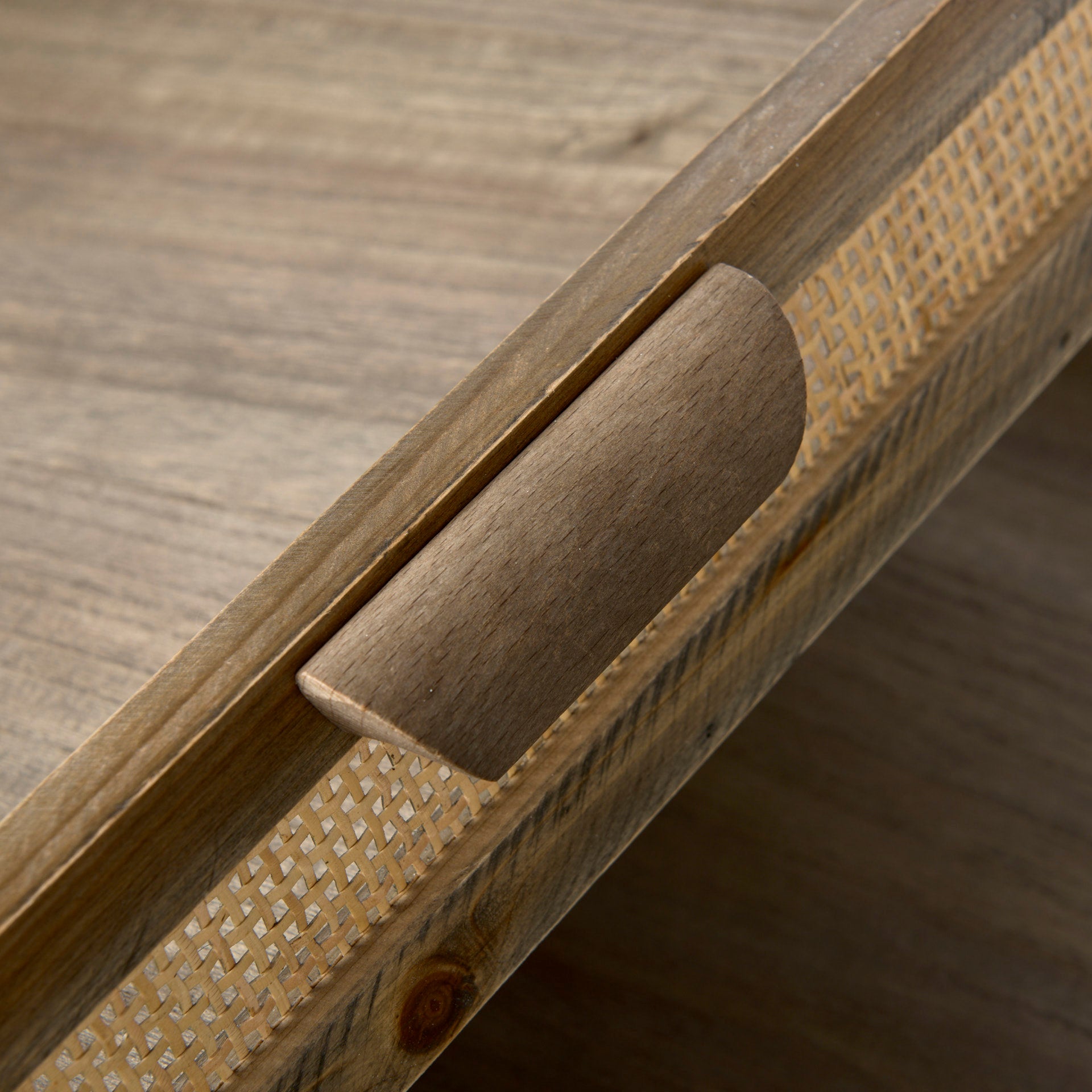 The Sonny trays have wicker weaving details on all four sides of the tray, and premium Mango wood on the bottom. These trays are finished in a beautiful light brown color with small wooden handles on the sides.