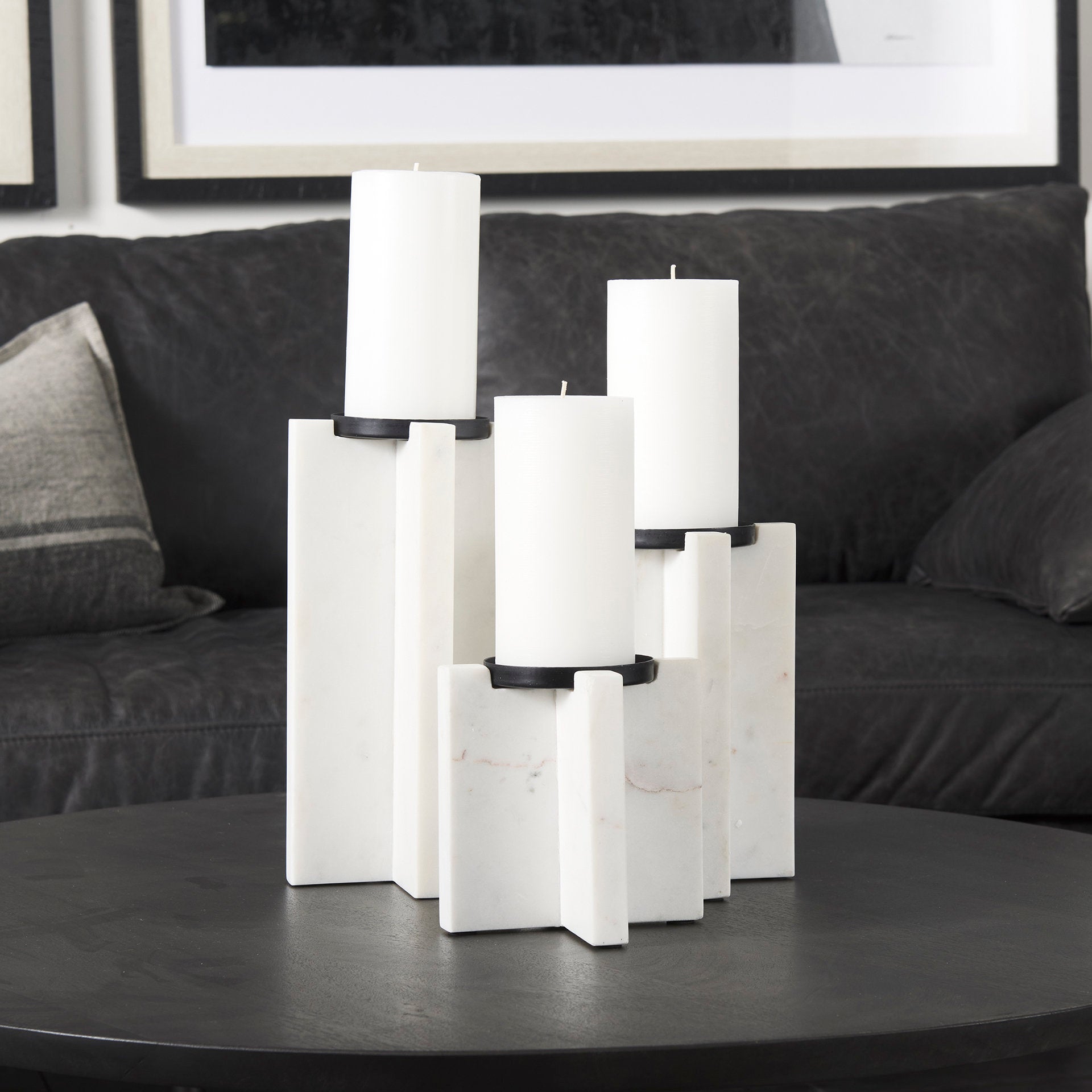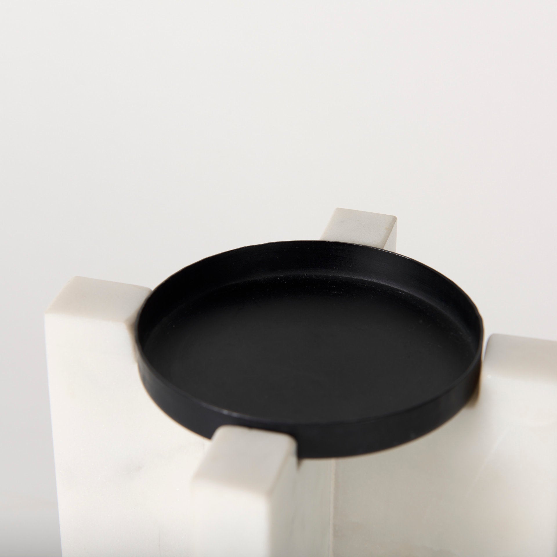 A sophisticated candle holder made from solid white marble that houses a black iron base for holding pillar candles