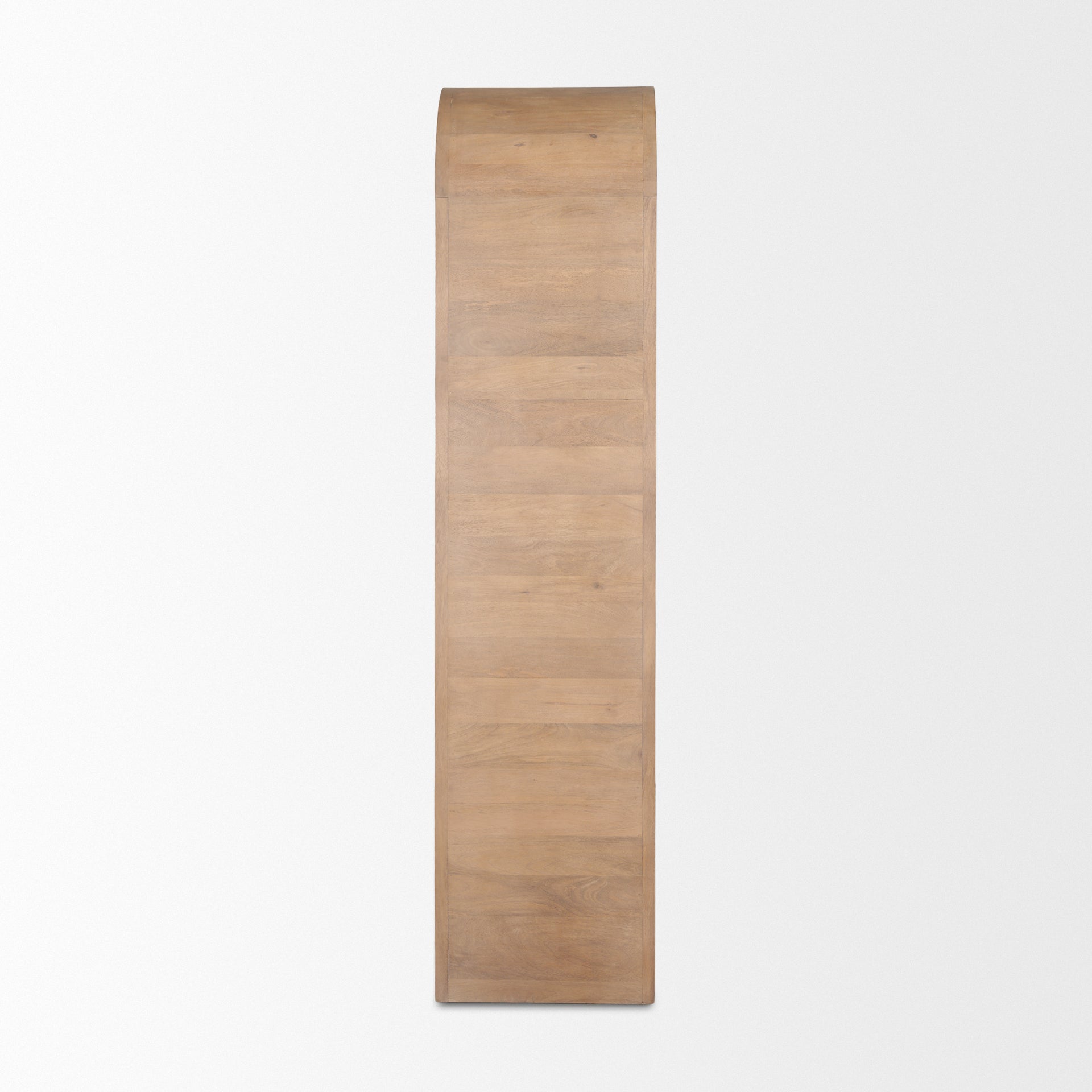 The Sorina Curio Cabinet is crafted from solid mango wood in a natural light brown finish with four reverse fluted CNC cabinet doors.