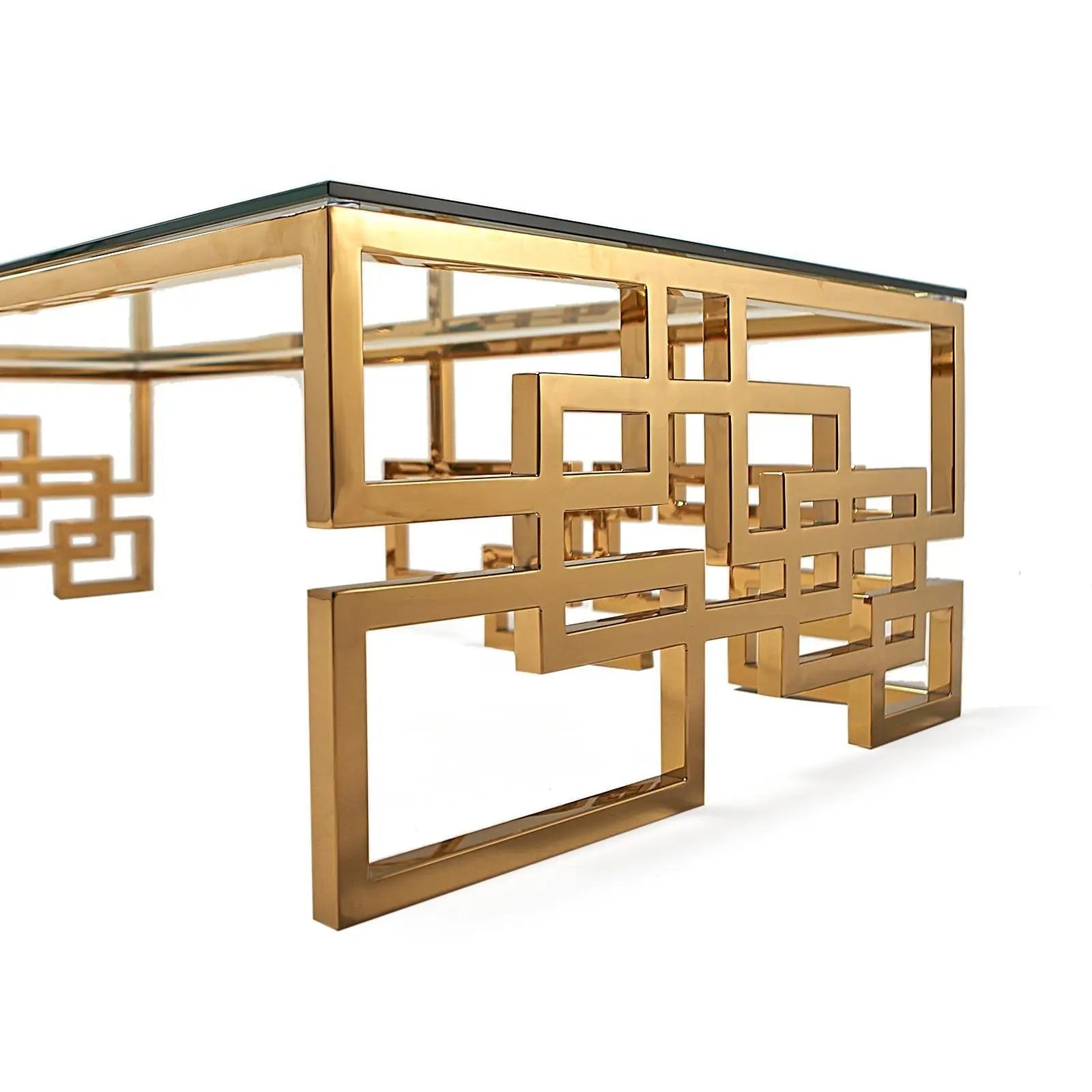 Spectra Modern Rectangular Large Coffee Table by Roberto Grassie has a geometric shape base crafted with a silver/rose gold/titanium gold polished stainless-steel base and a 12mm glass top with a 1β bevel.