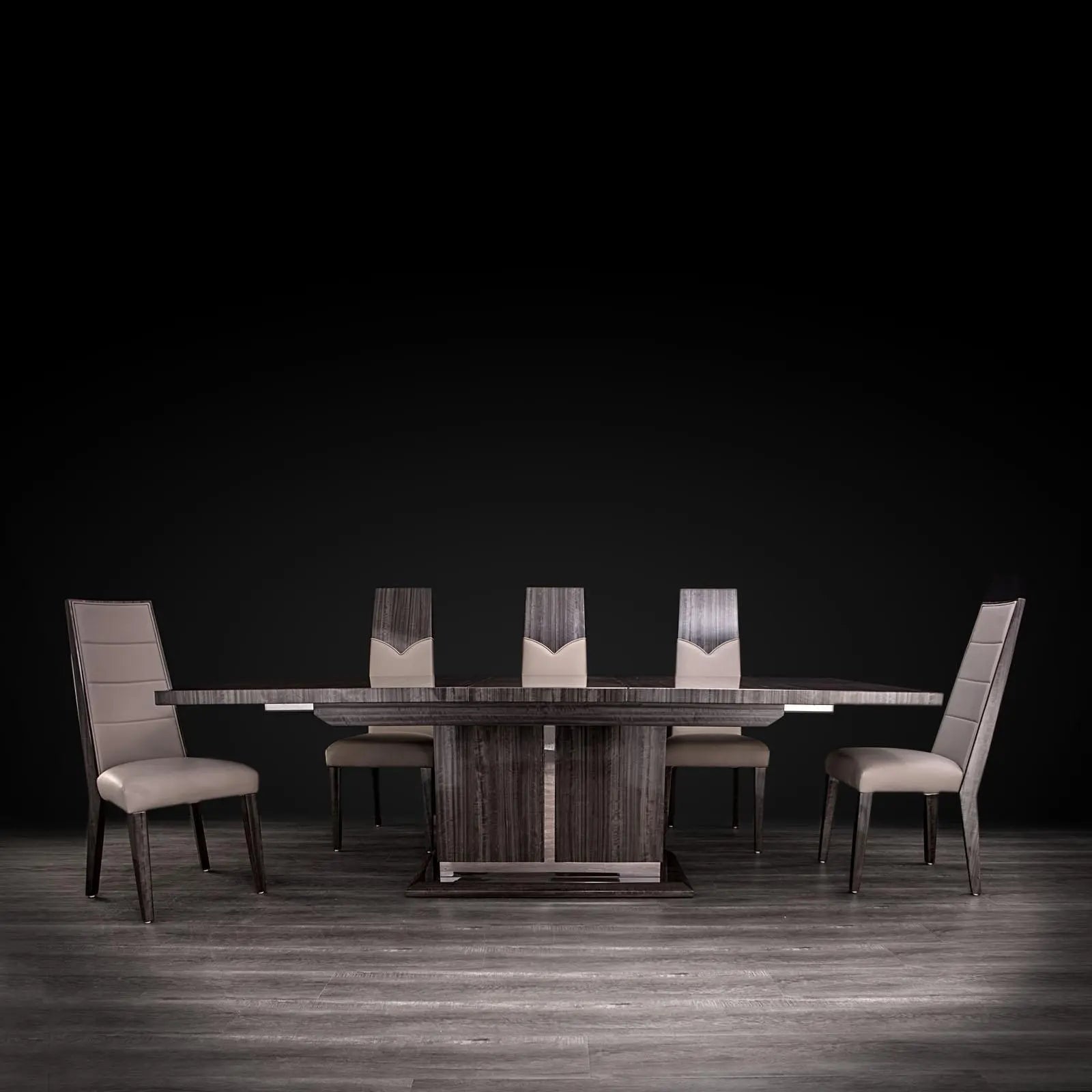 St Tropez collection by Norhaus Furniture is inspired by modern design and elegant finished of the lacquered wood. This Luxurious Dining Table has a gray angley lacquered top and base with silver polished stainless-steel details. The expandable feature provides 10 seats. The extension can be stored inside the table.