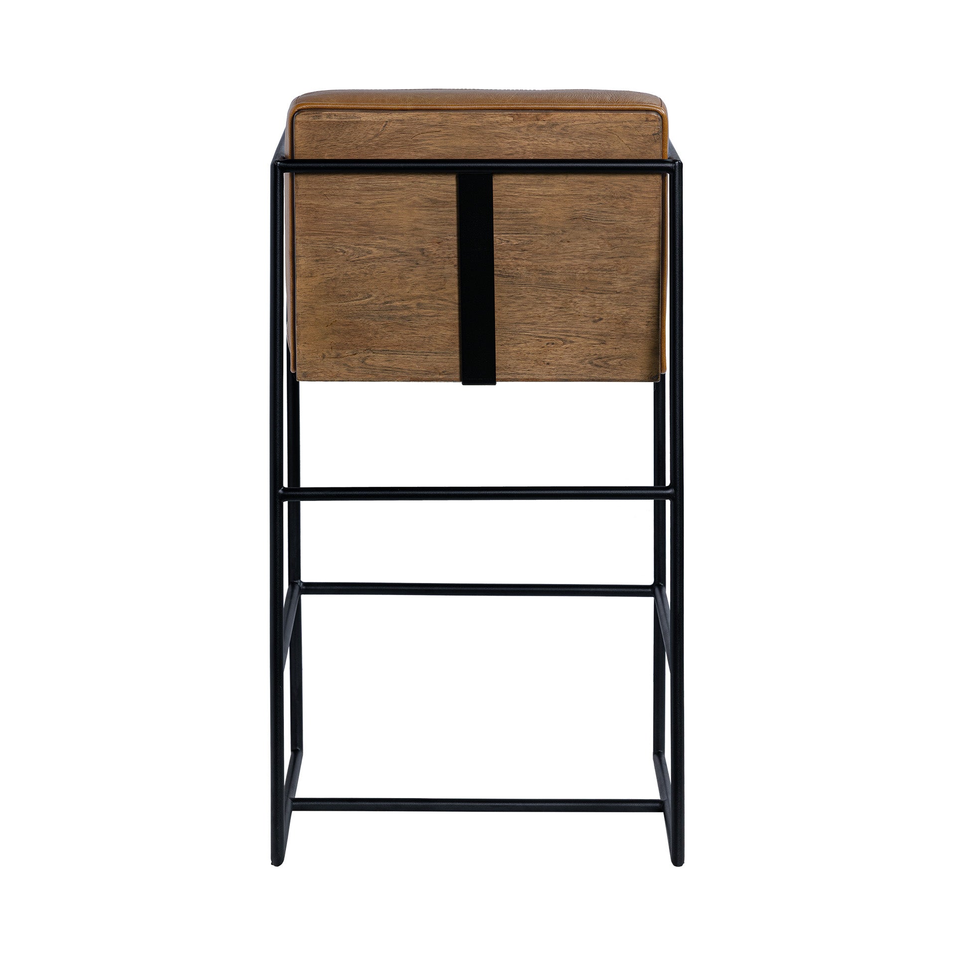 The Stamford is a contemporary genuine cognac leather bar chair braced by a sturdy, matte-black toned metal frame.