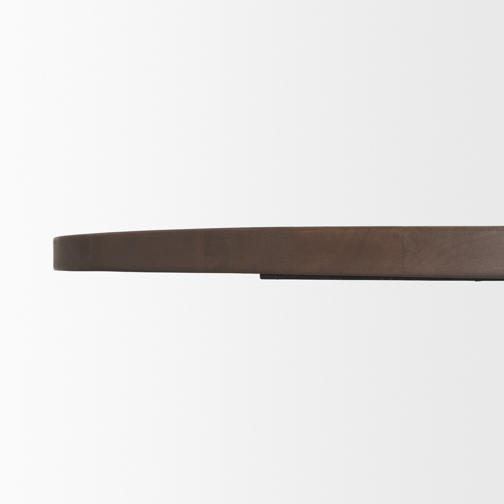 The Swanson Dining Table is constructed from dark matte brown mango wood with a smooth, round tabletop, matte black iron metal neck, and a tapered, scalloped pedestal base.