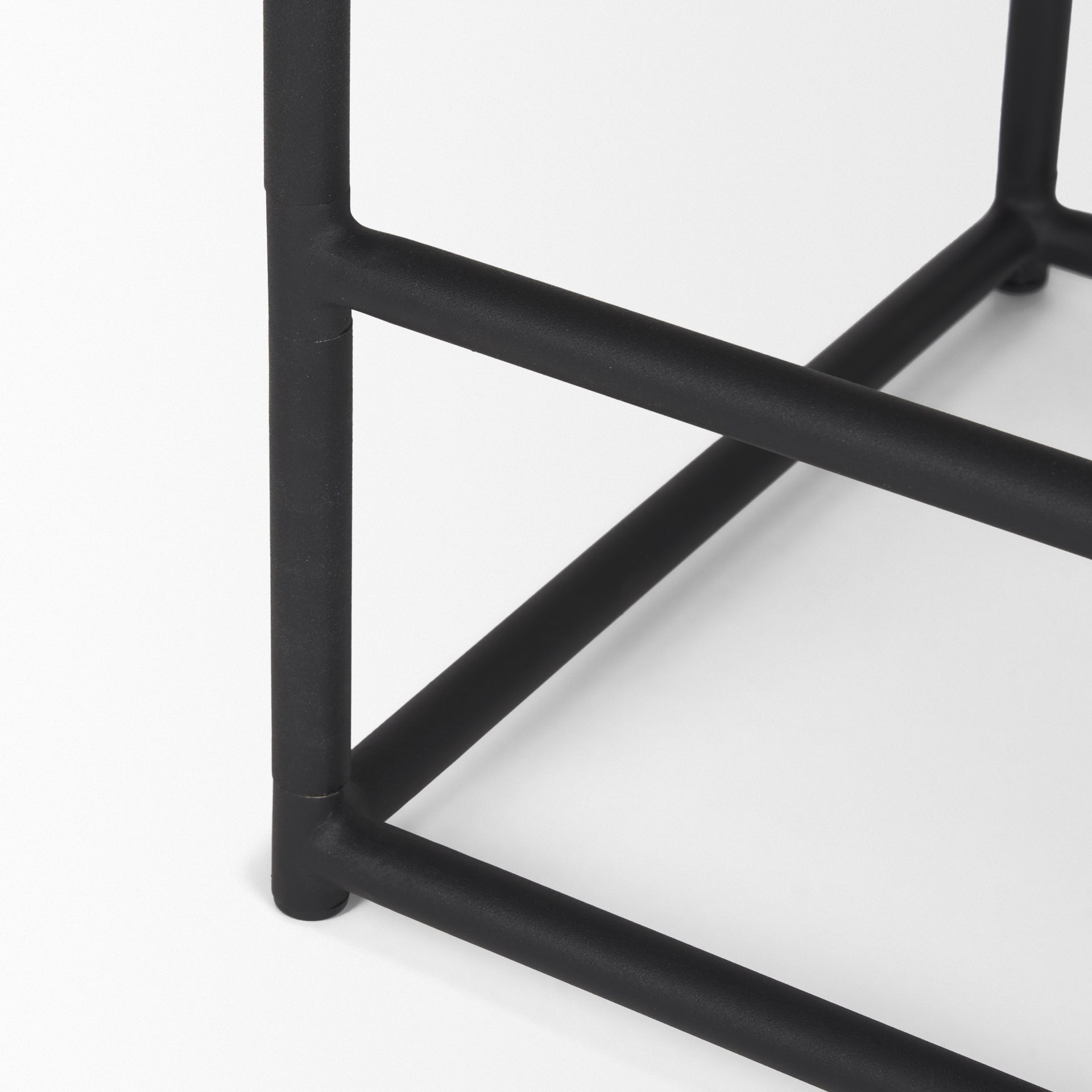 The Taniel Counter Stool is constructed from matte black iron tube metal with a contoured light brown solid wood seat.