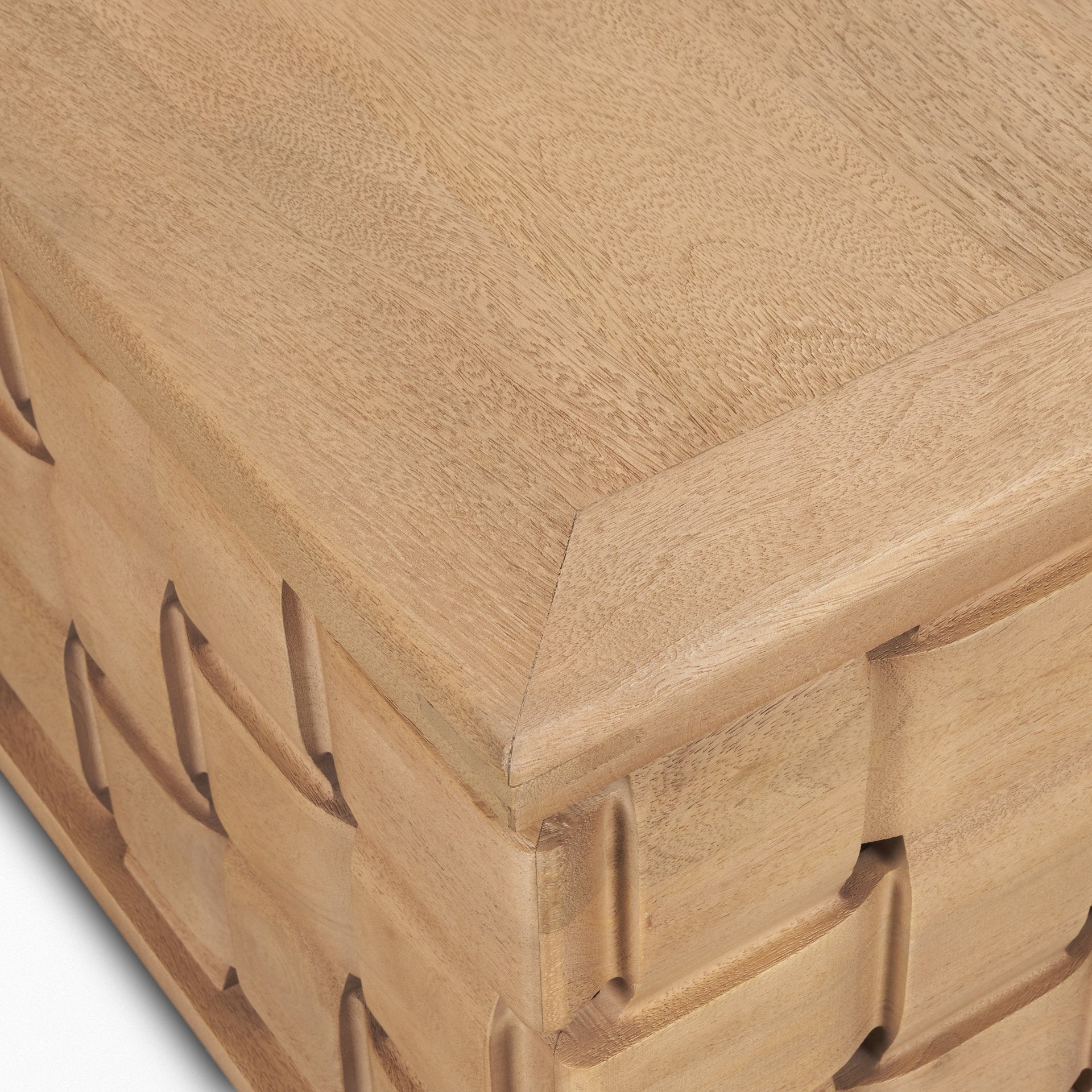 The Trellyn square coffee table brings sculptural presence to the center of a room with its minimalist top and fully carved base. The smooth, crisp-edged surface maintains a clean, modern profile, while the base introduces movement through a precision CNC-carved woven texture. Because the carving continues seamlessly on all four sides, the table presents as a complete 360Β° form, highly impactful in open living spaces. Its bold geometric shape creates a grounded focal point that pairs beautifully with both neutral and dramatic seating arrangements. The light brown version showcases a neutral, versatile warmth that blends effortlessly with soft, modern, or transitional palettes.