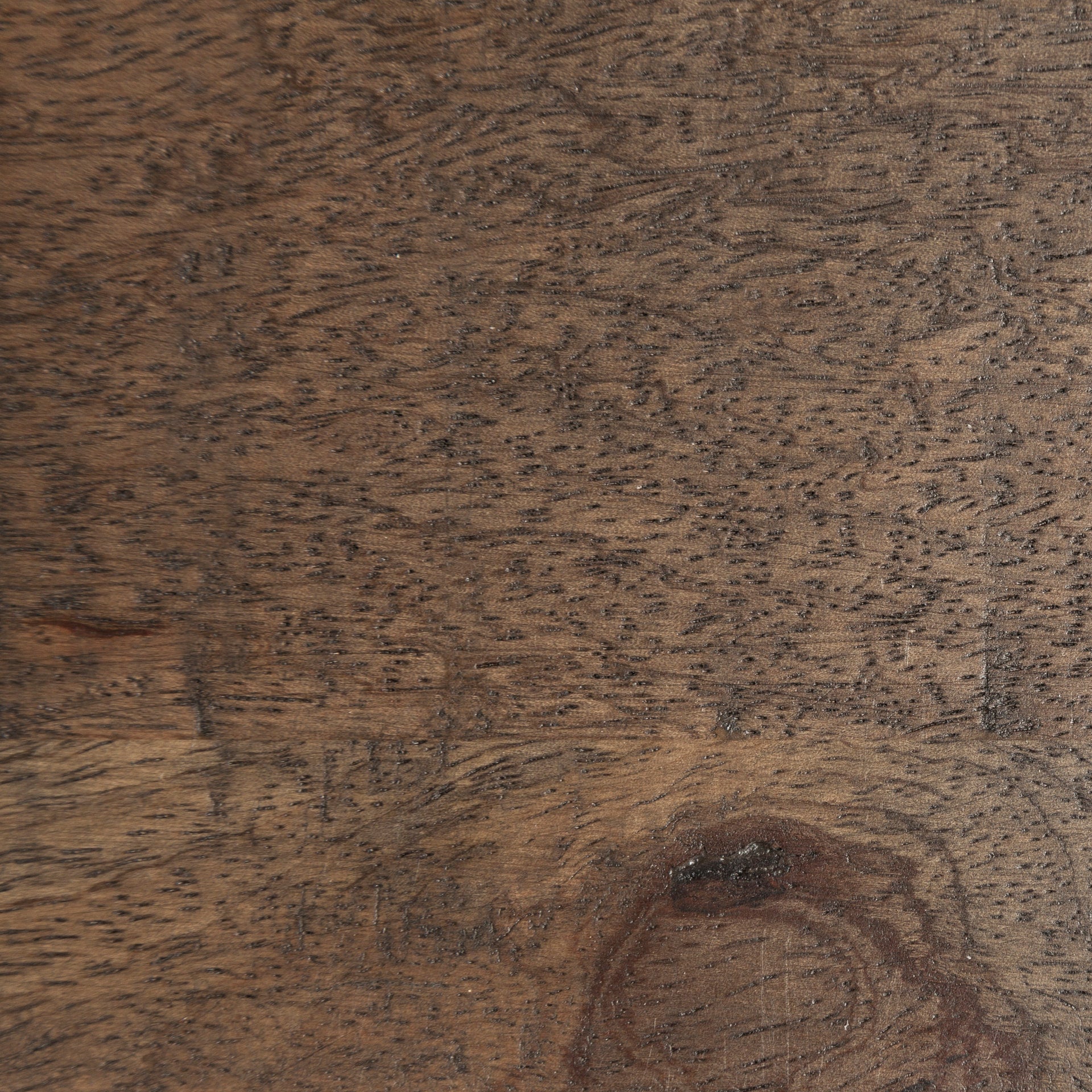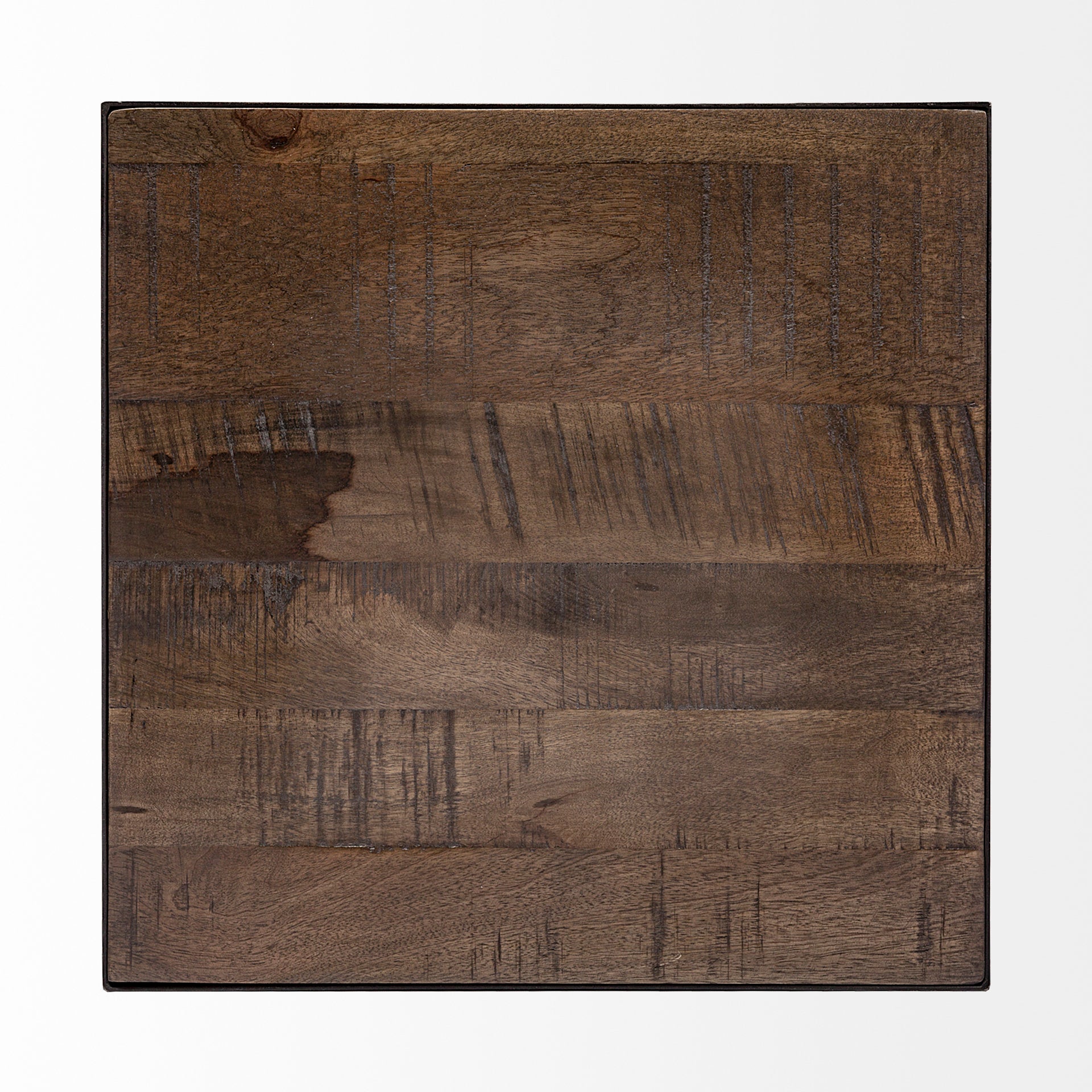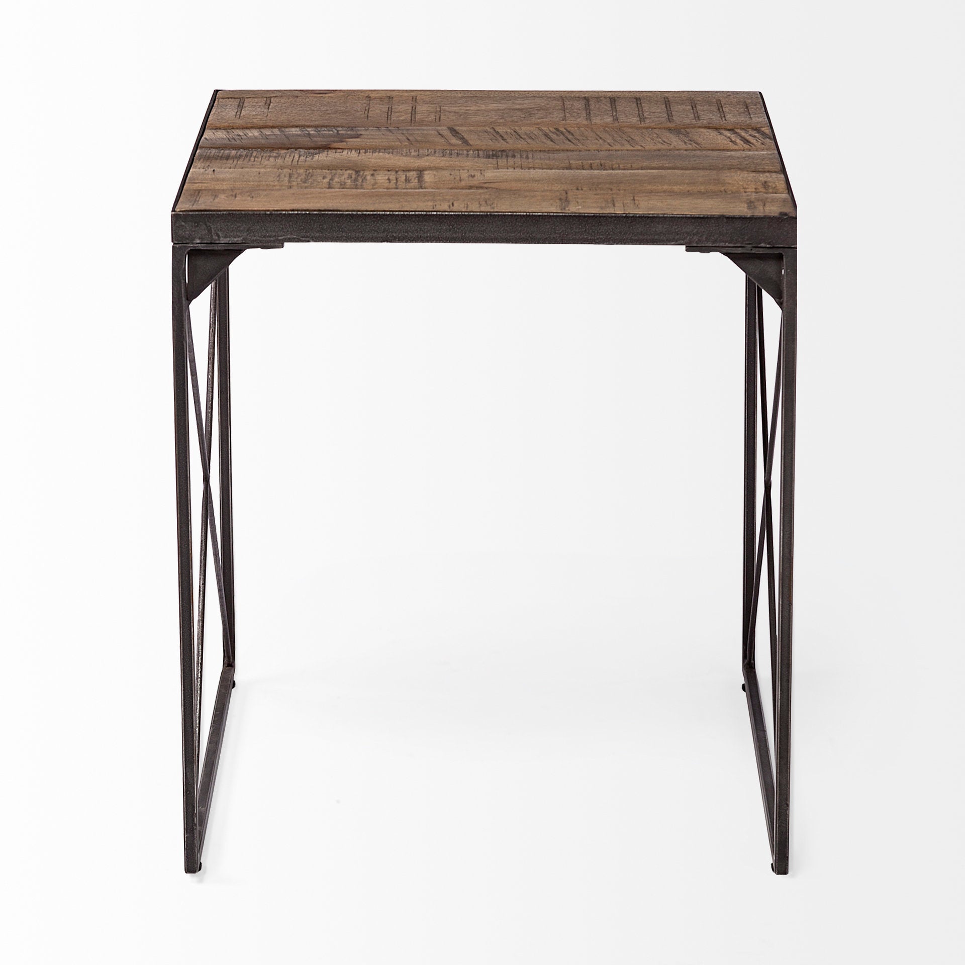 This farm-style side table, made from solid Mango wood, features cross-brace, iron legs beneath a square top with a flat, iron edge.Β