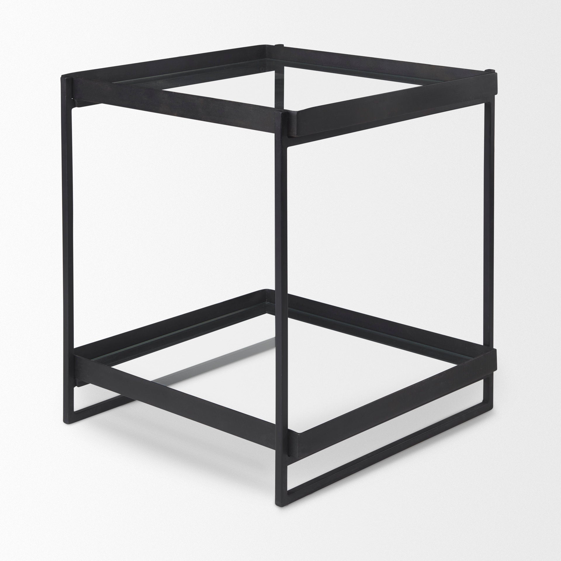 A sleek and stylish, coal-black side table, made from sturdy iron and finished with tempered glass shelves