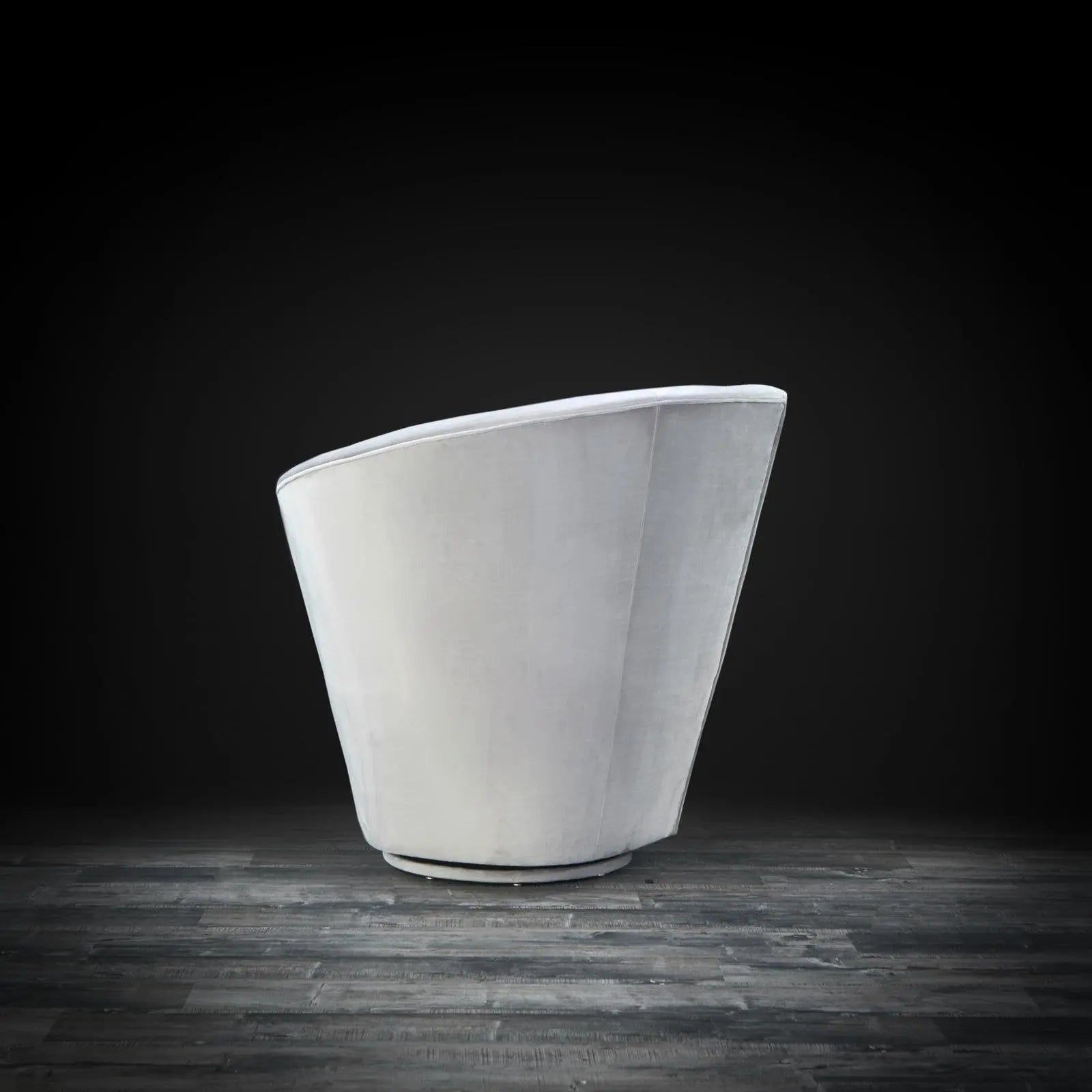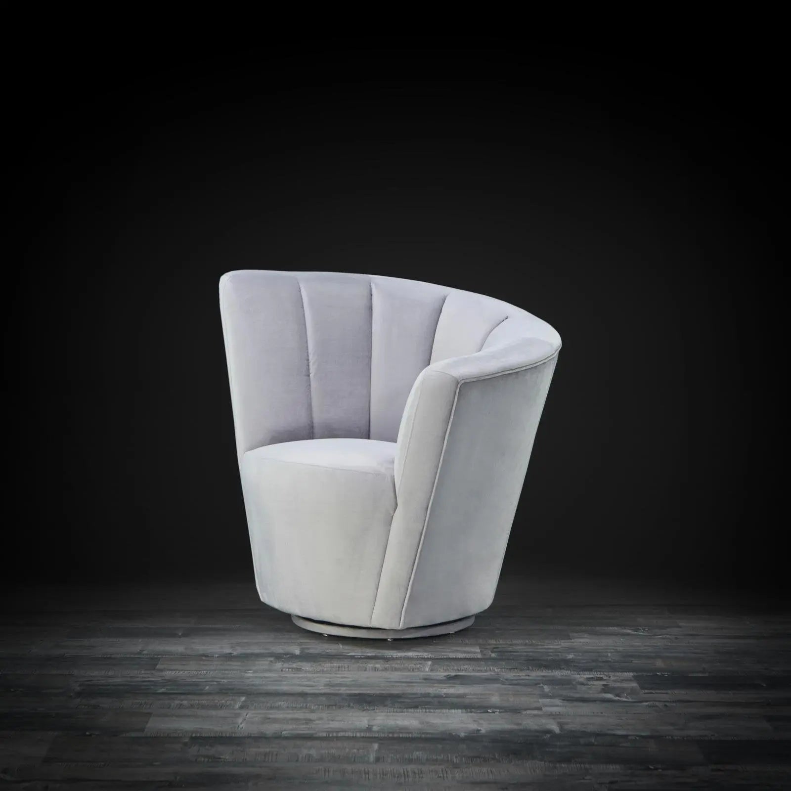 Design & Upholstery: The chair is fully upholstered in velvet, providing a luxurious, soft texture. Both the seating and back are upholstered, with vertical channeling that adds a tailored, sophisticated look. Even the swivel base is wrapped in matching velvet, which ensures a cohesive, elegant appearance from top to bottom.